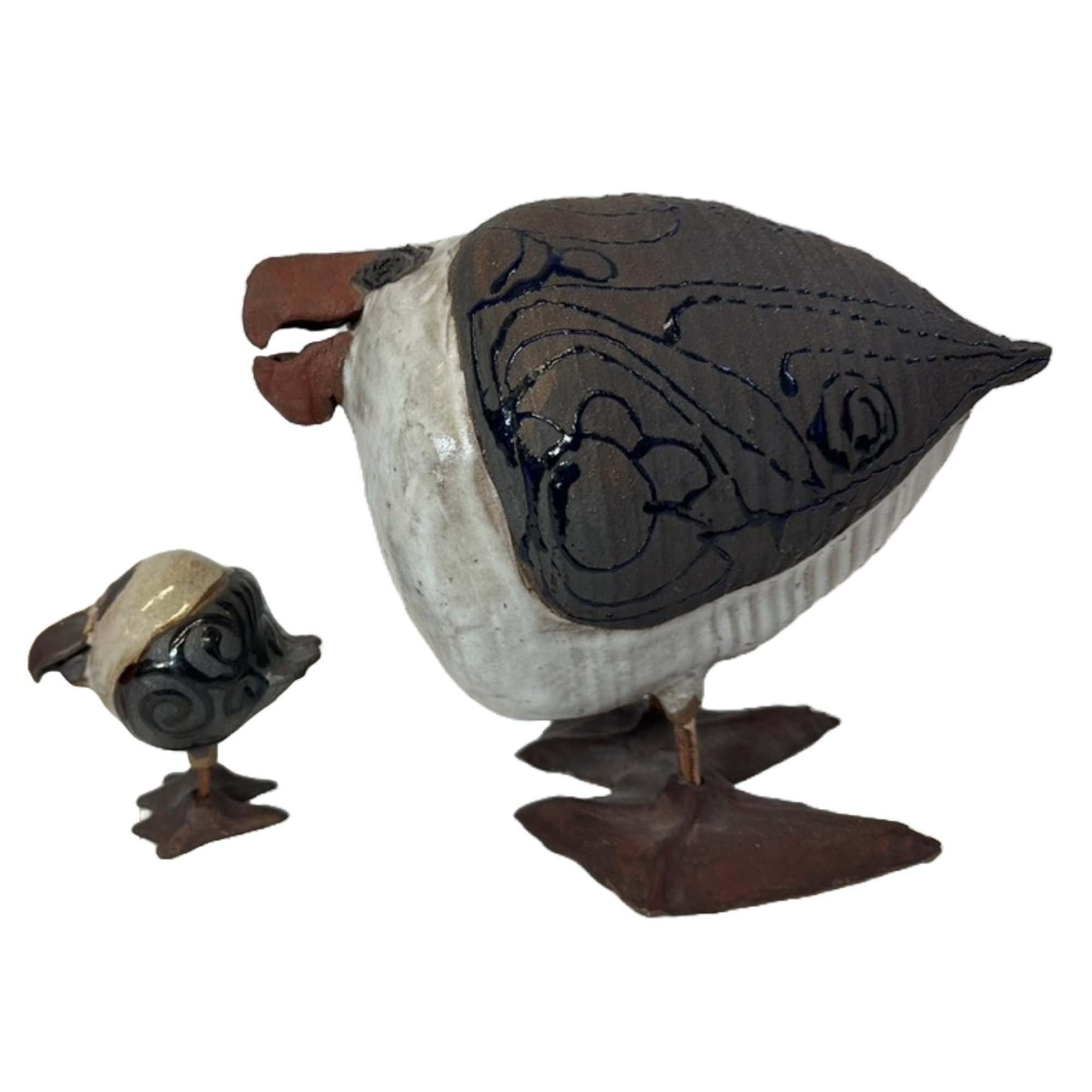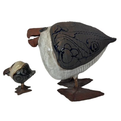 A group of 2 Susan Dennis (Cape Cod artist) studio pottery shorebirds including a larger one (7"H), and a small bird (3.25" H). Both signed on the bottom.