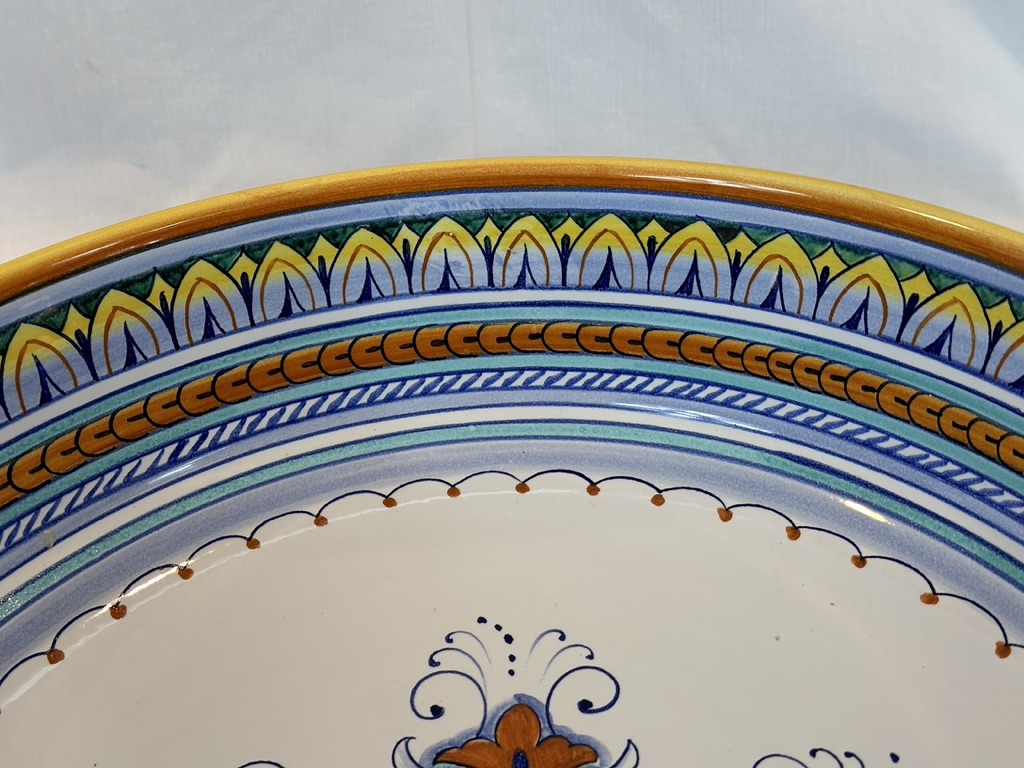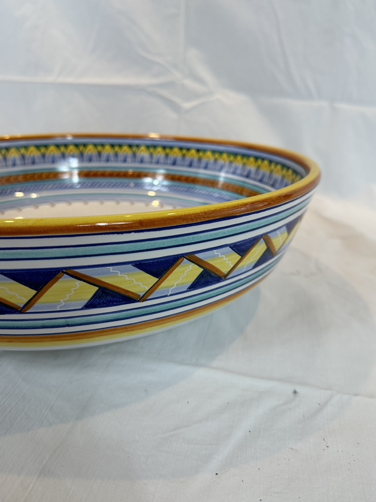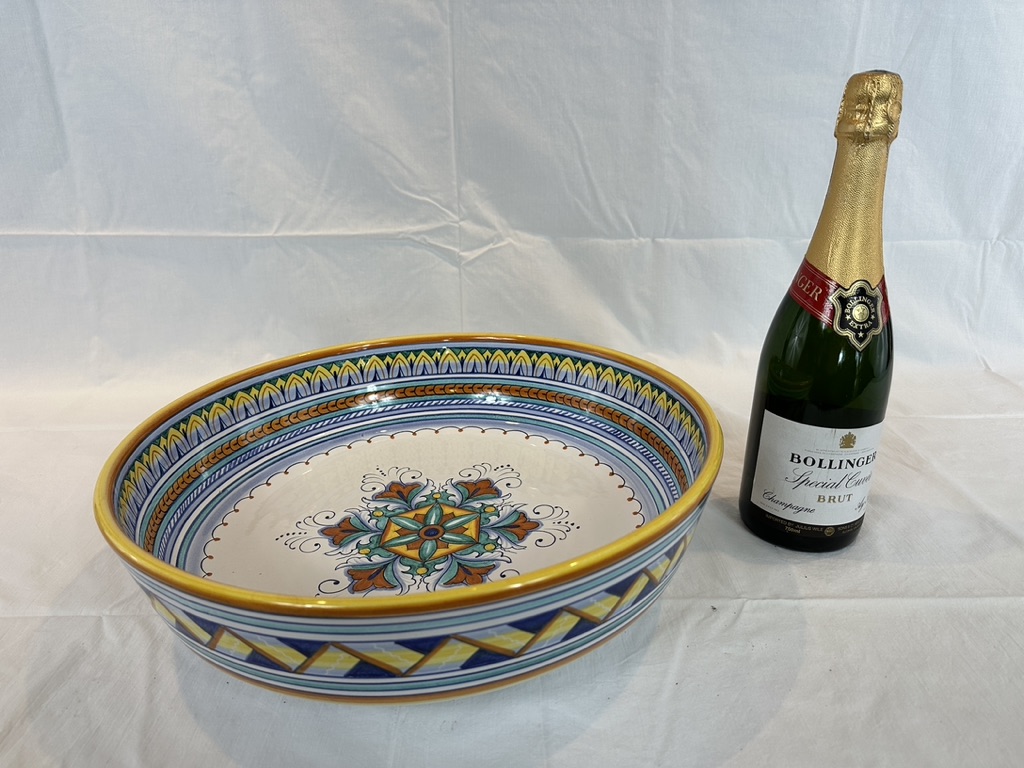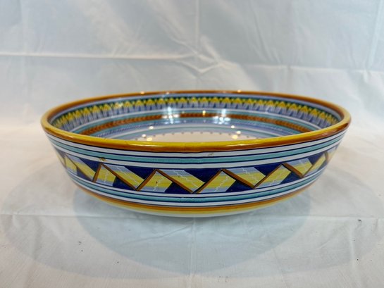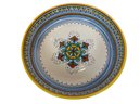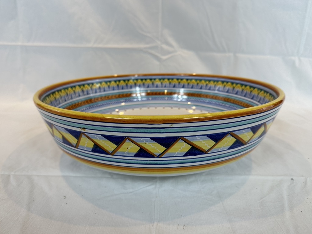 Hand-paint decorated earthenware bowl with repeating border design and a floral motif center.