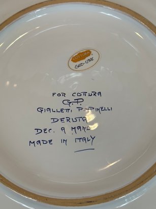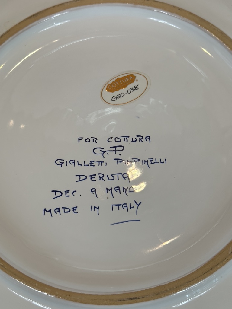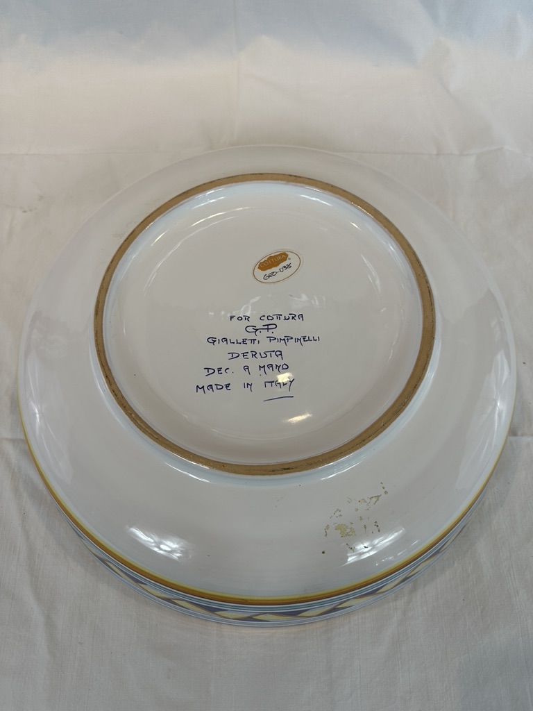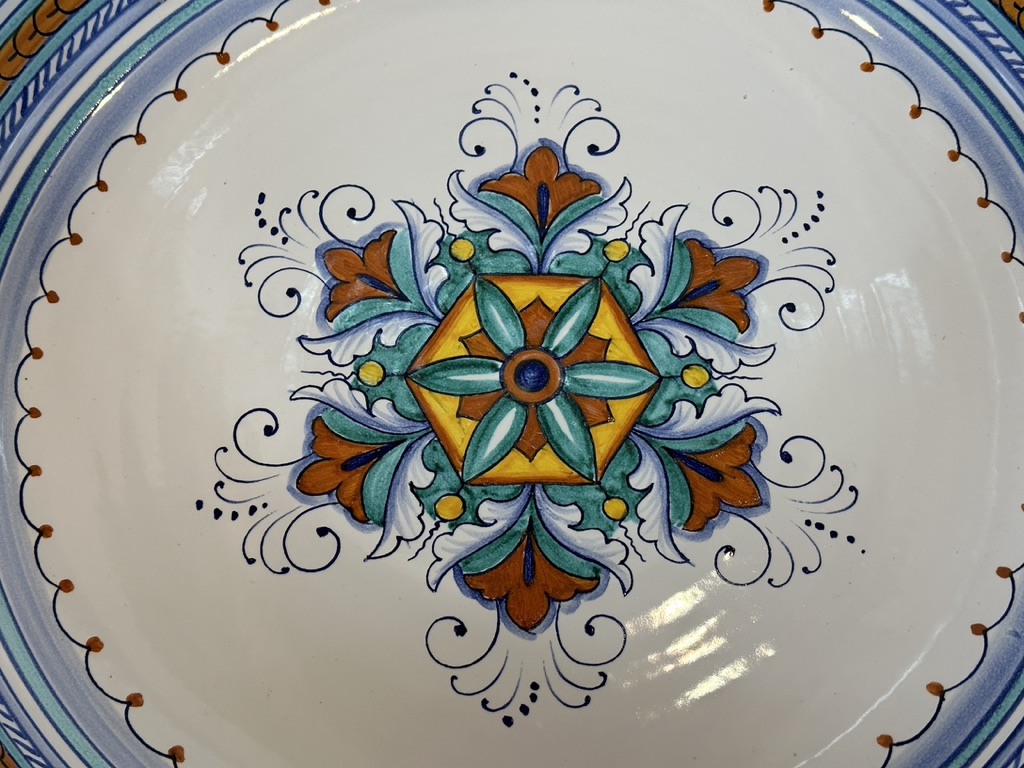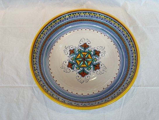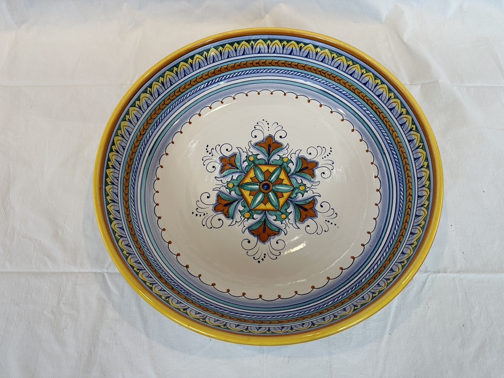 Hand-paint decorated earthenware bowl with repeating border design and a floral motif center.