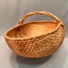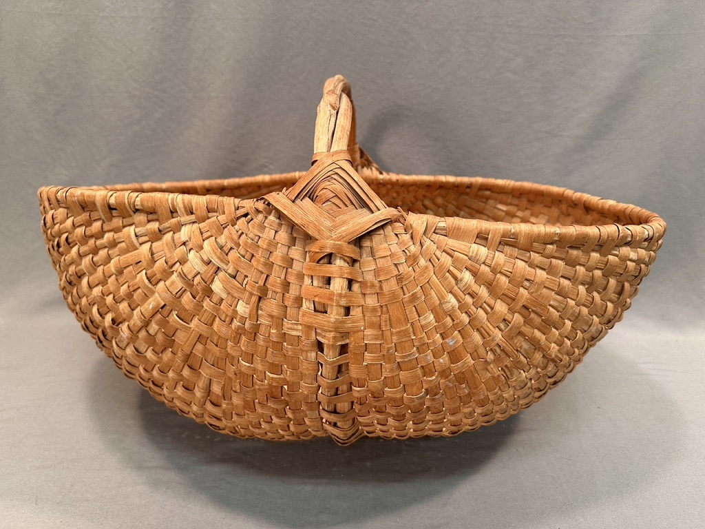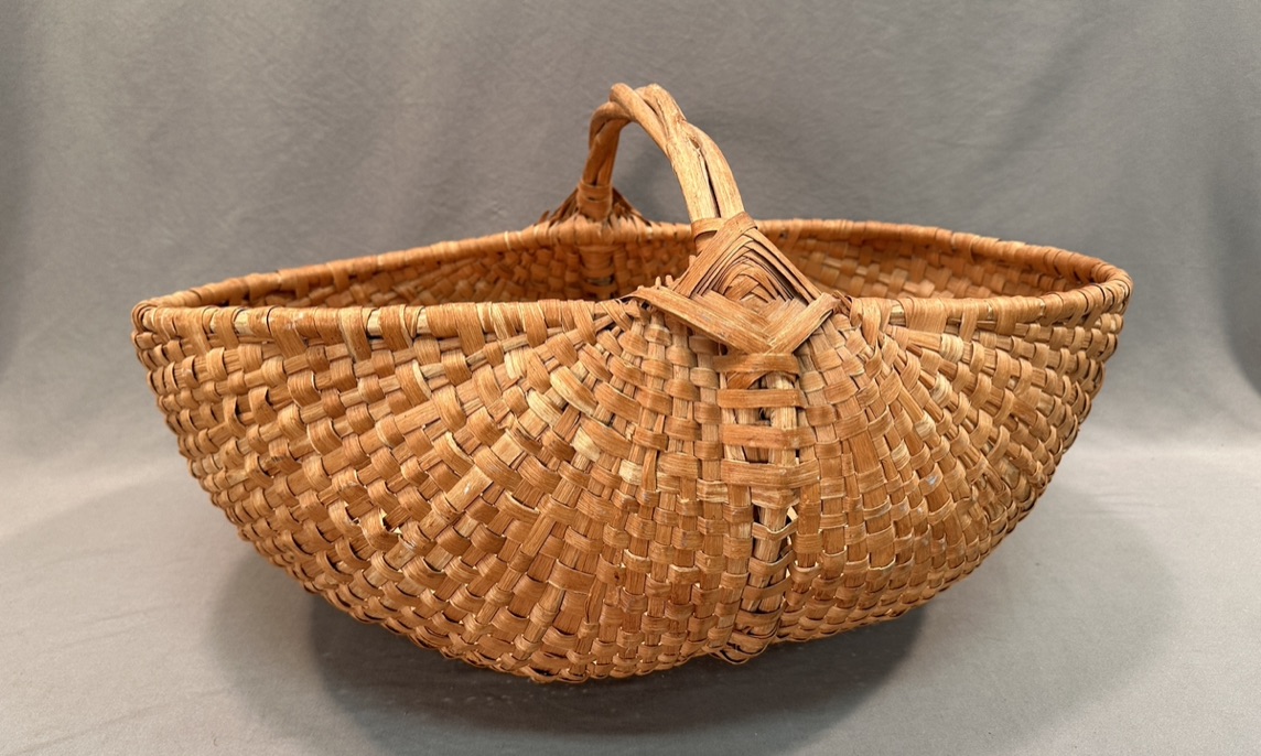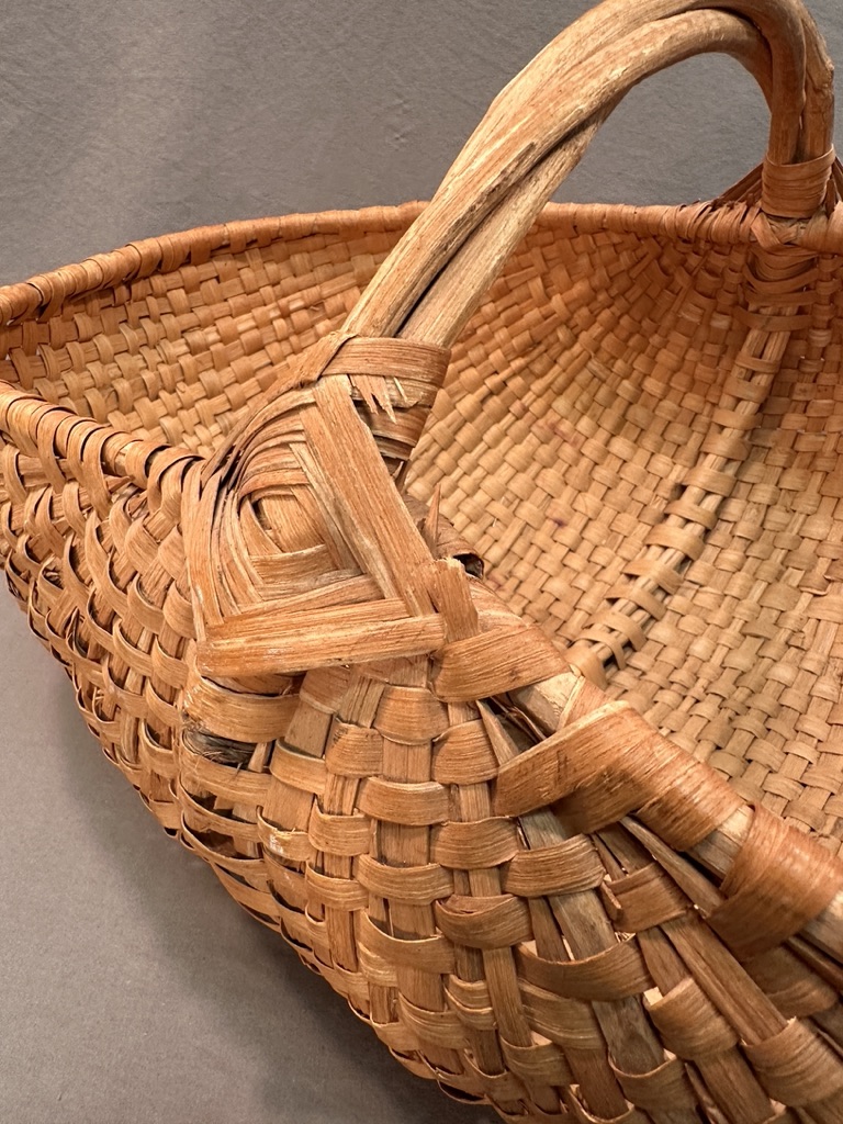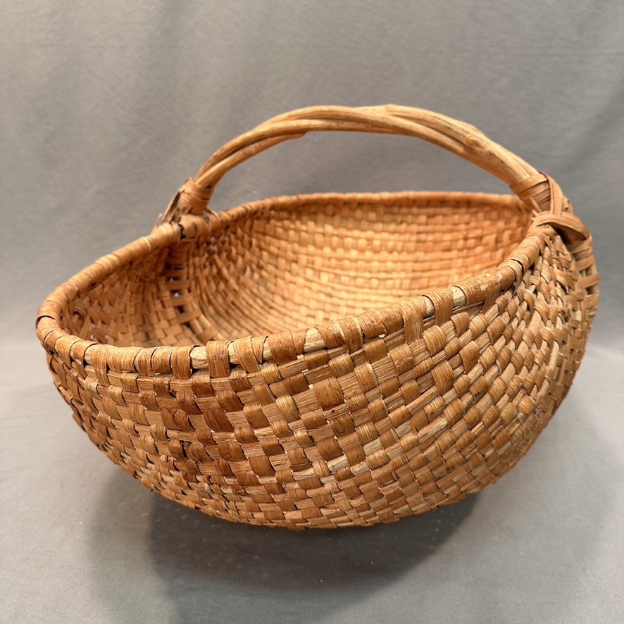 A antique split oak buttocks gathering basket with woven twig handle and woven diamond design at handle joints.