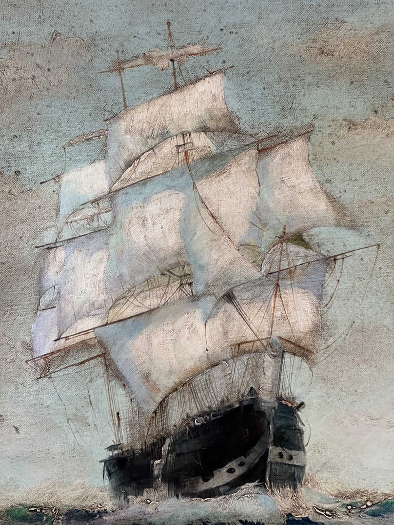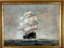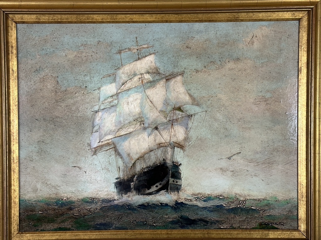 A painting depicting a tall ship at sea. Signed lower right, Cooper. Framed in gilt wood frame.