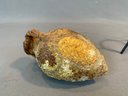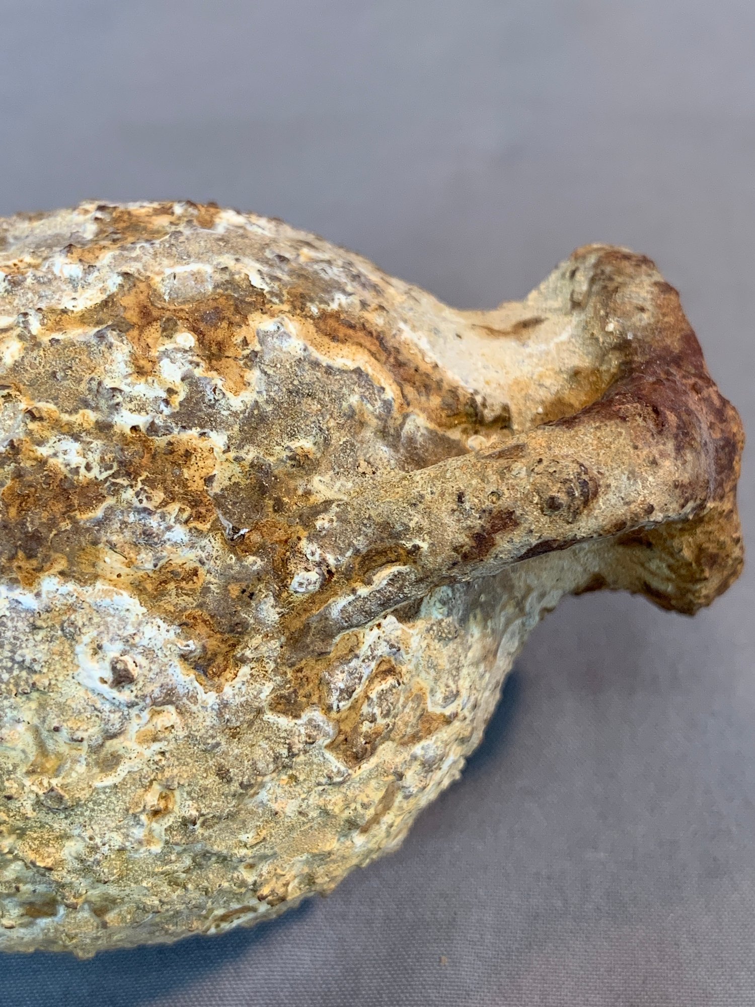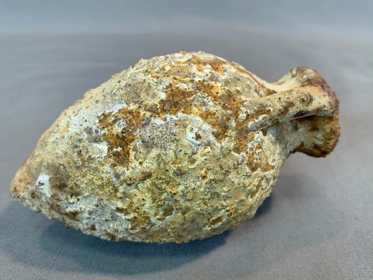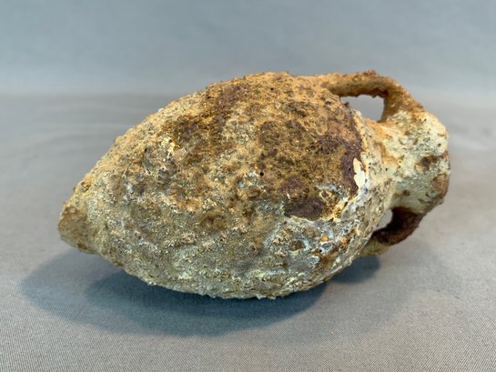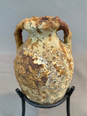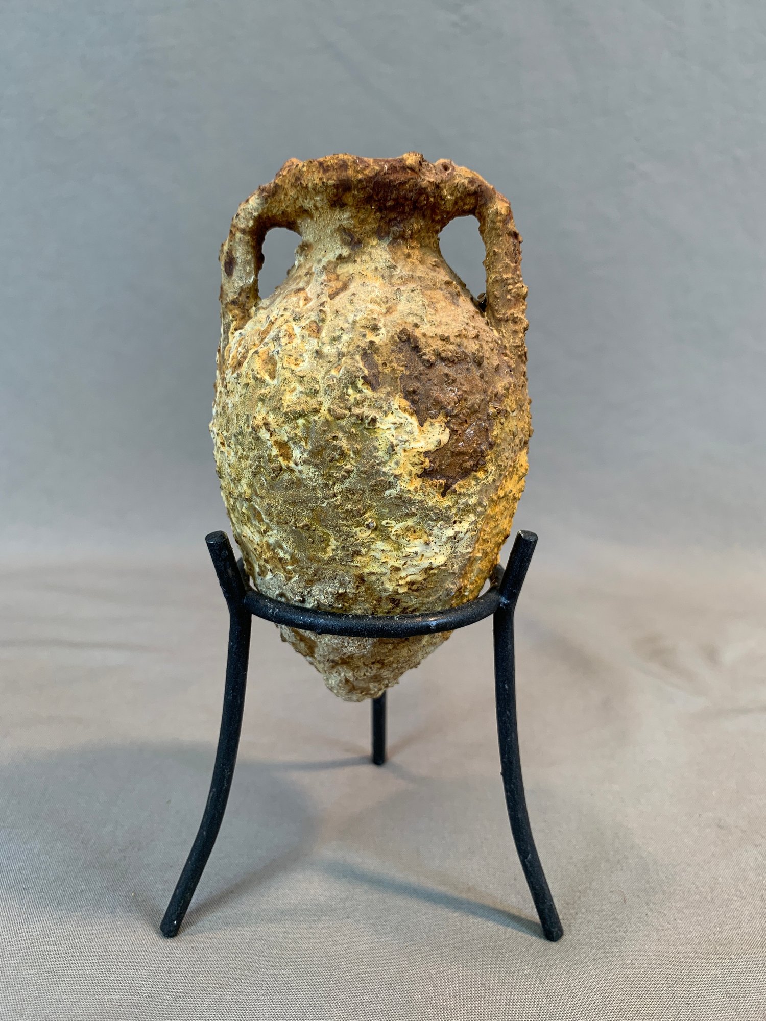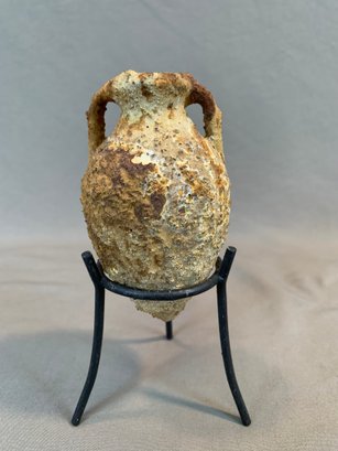 Small two-handled amphora with heavy marine encrustation consistent with seafloor recovery. Ancient, Mediterranean origin. Mounted on a modern iron display stand.