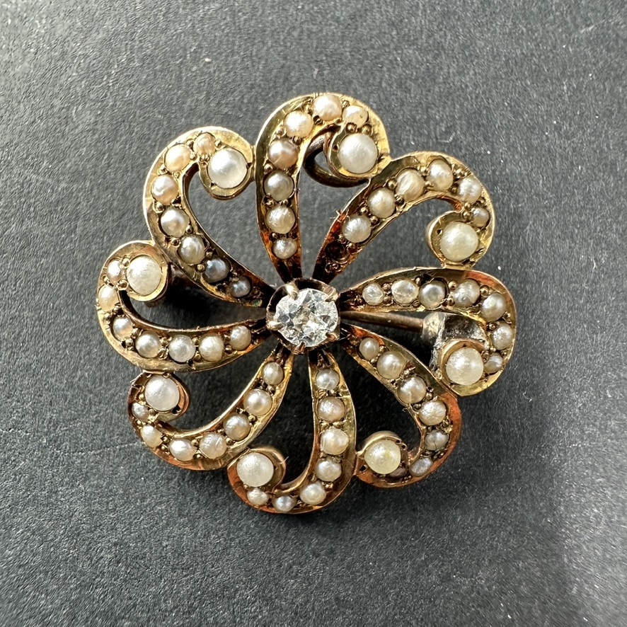 A fine 14k yellow gold Victorian pinwheel shaped brooch or pendant with faceted diamond in center. Both have been tested.