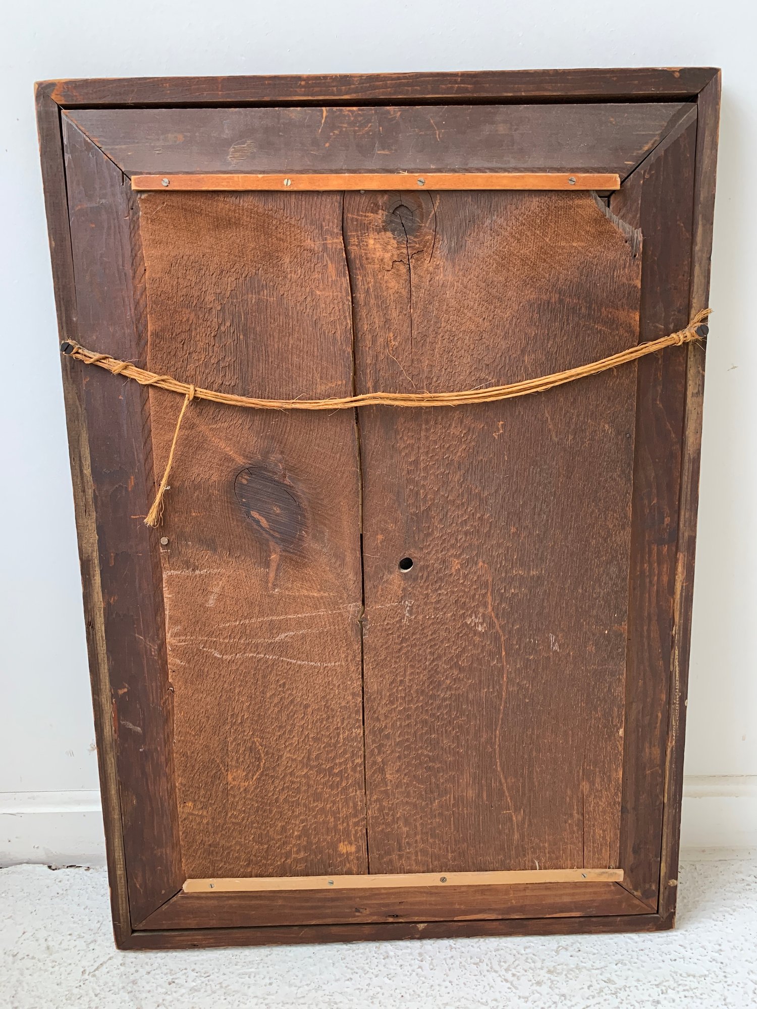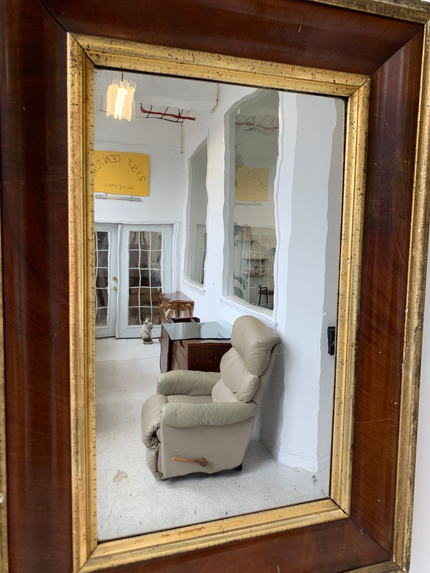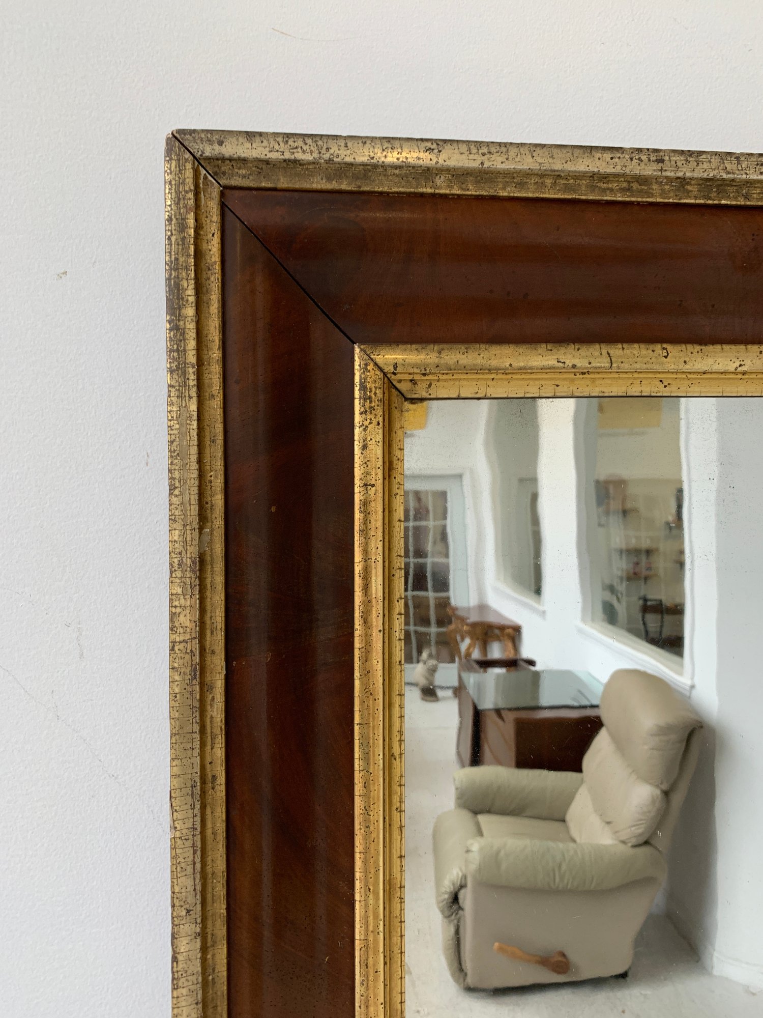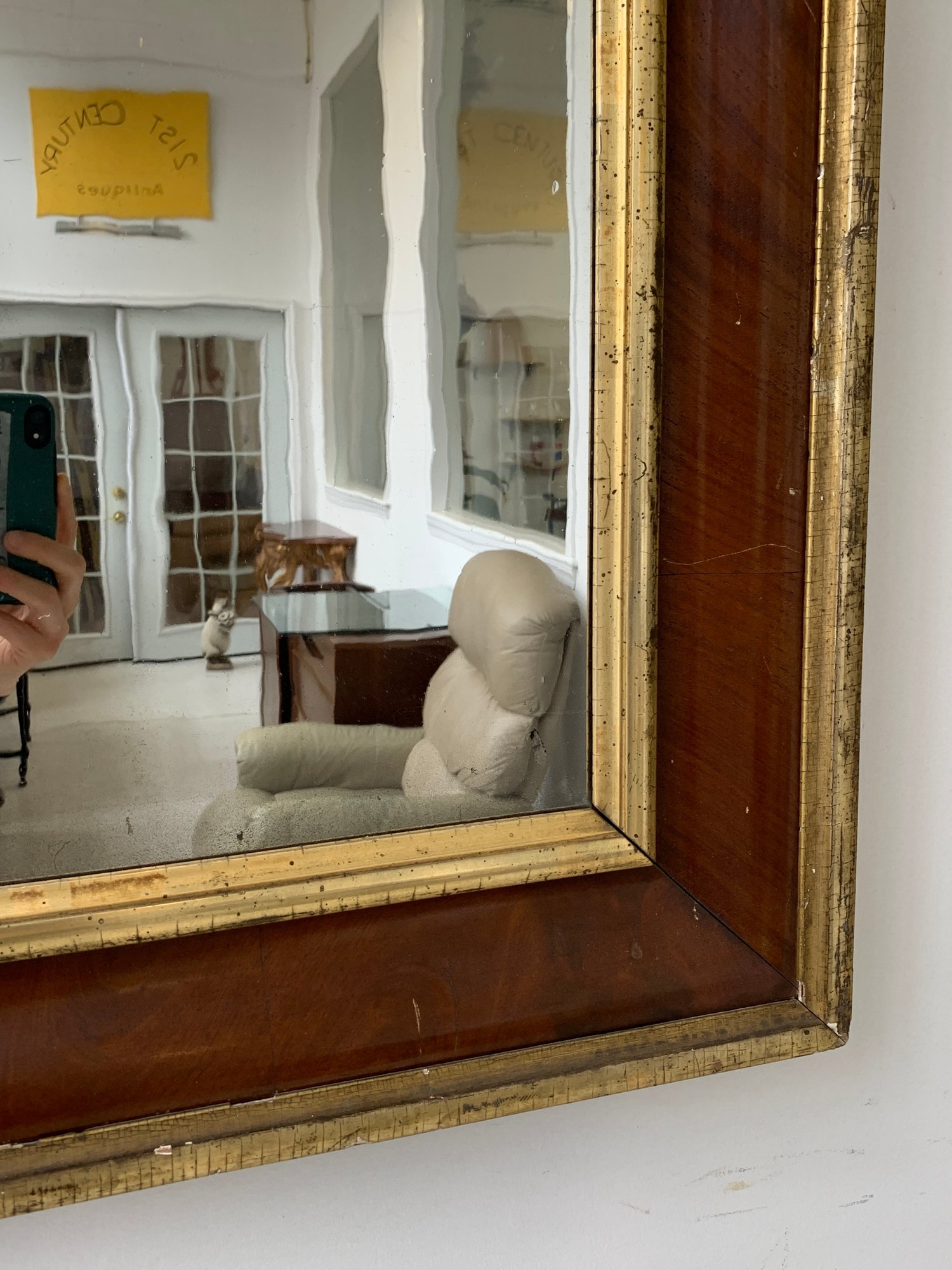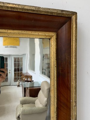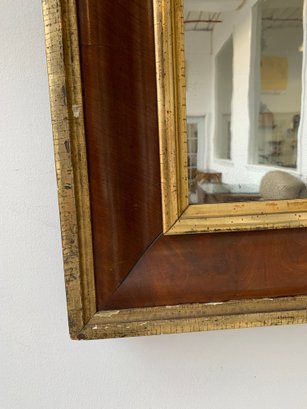Antique 19th century American mahogany ogee mirror with gilt inner liner, retaining the original mirror plate. The two board wood backing with rope hanger is consistent with American construction of the period.