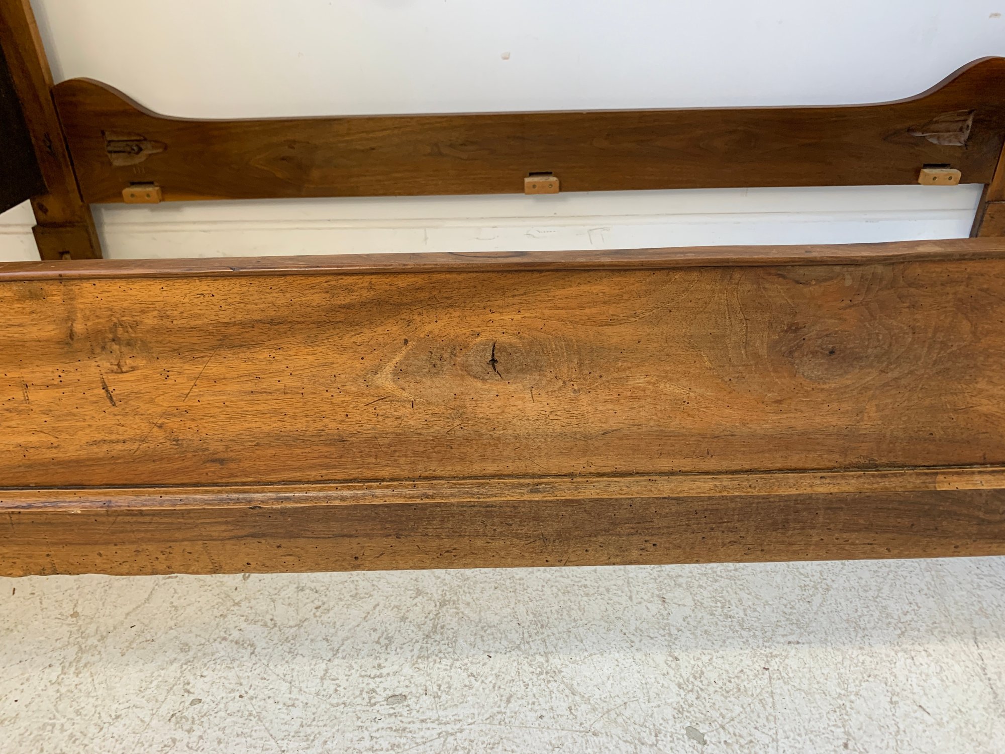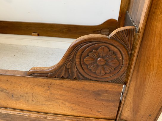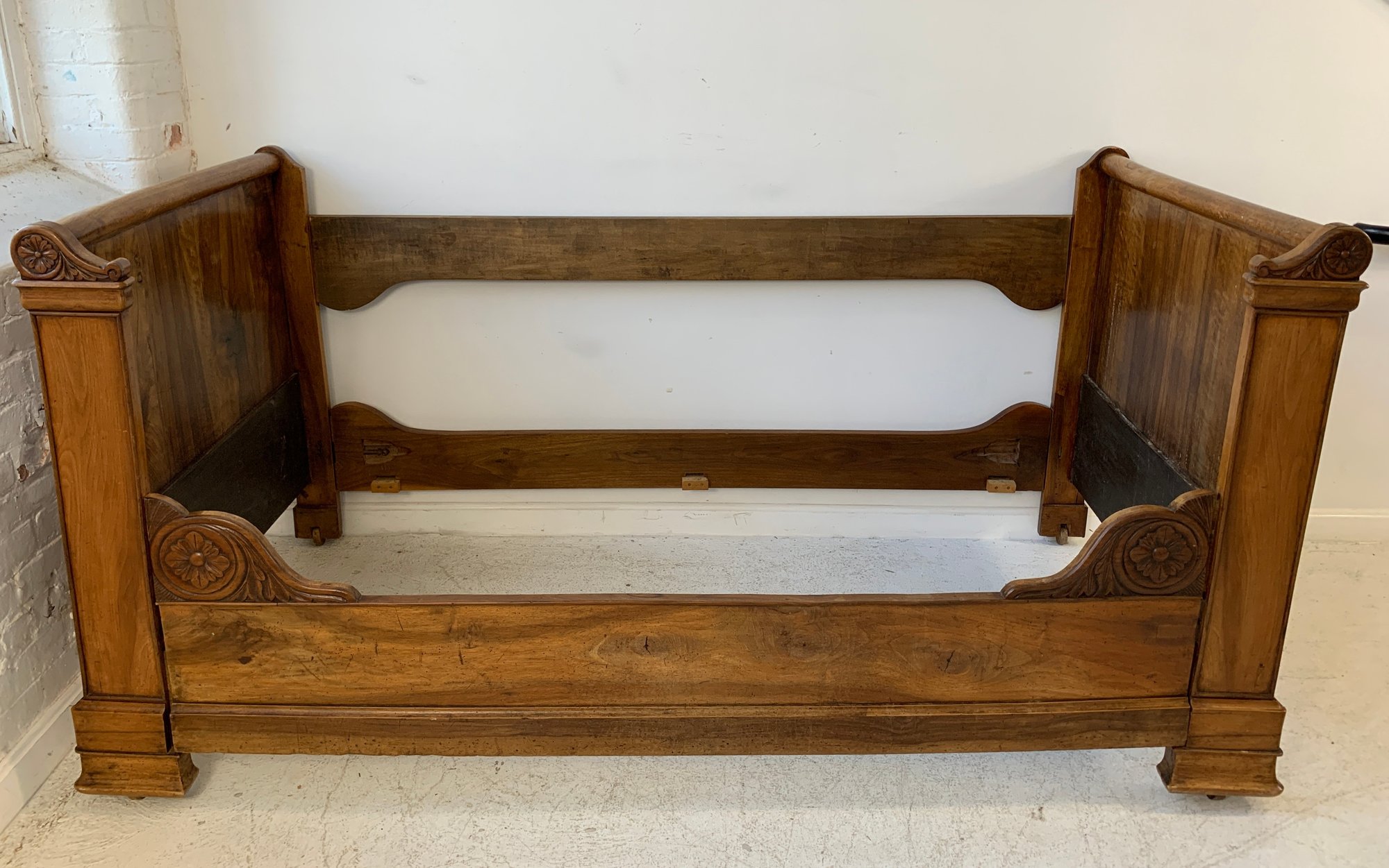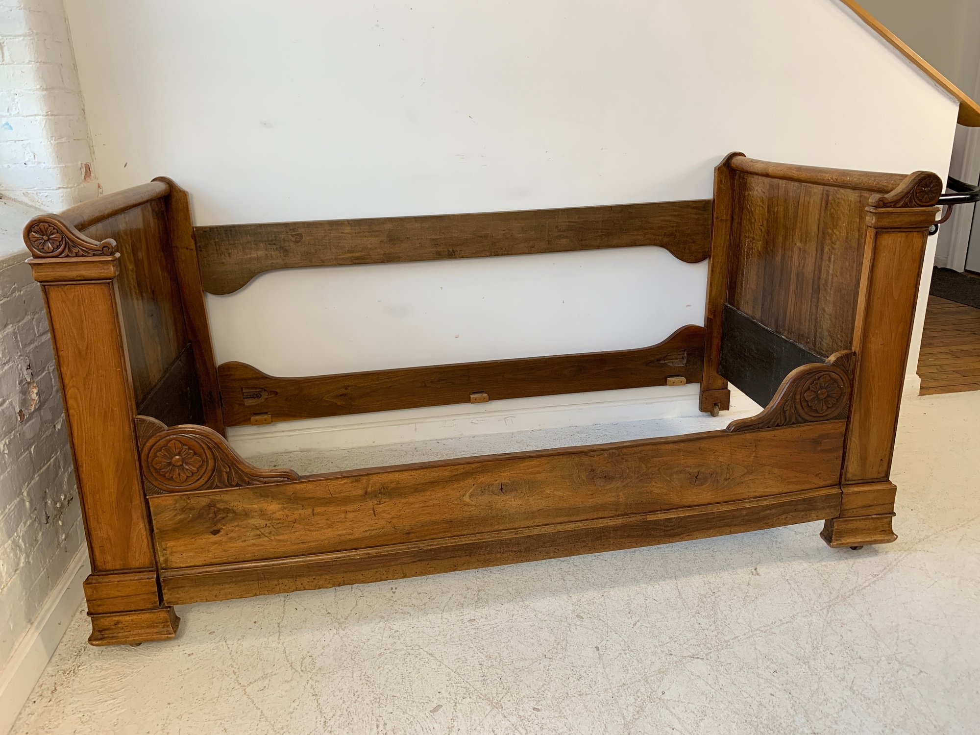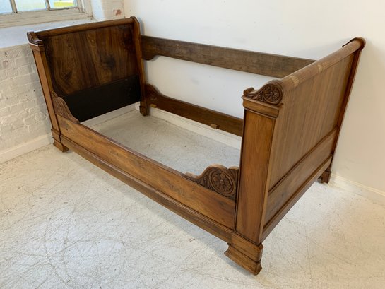 A walnut daybed in the Louis Philippe taste with scrolled rails, carved rosette and acanthus volutes at the corners, paneled sides, and block feet. Original iron bed bolt hardware intact.
