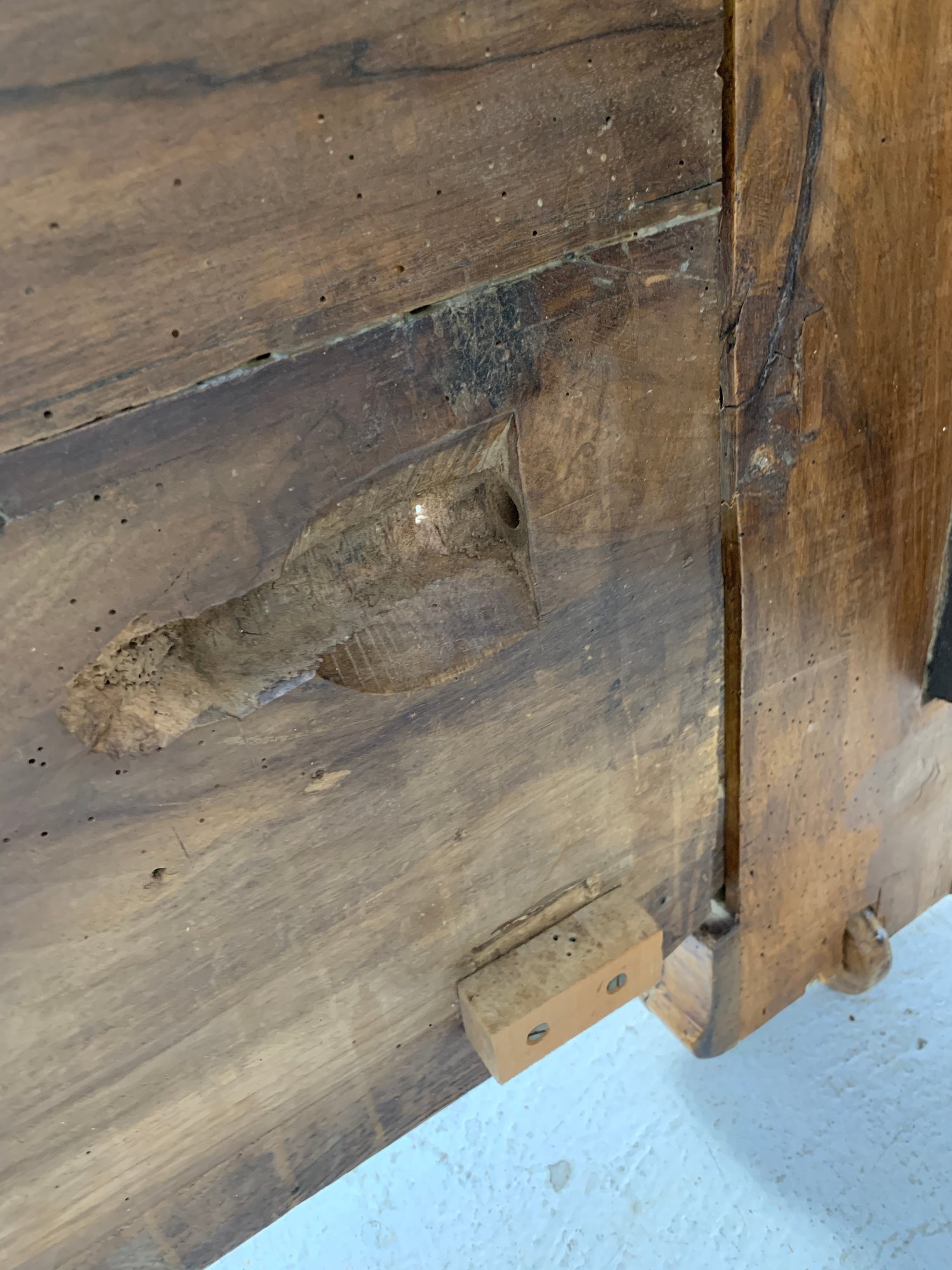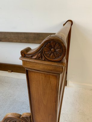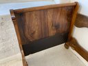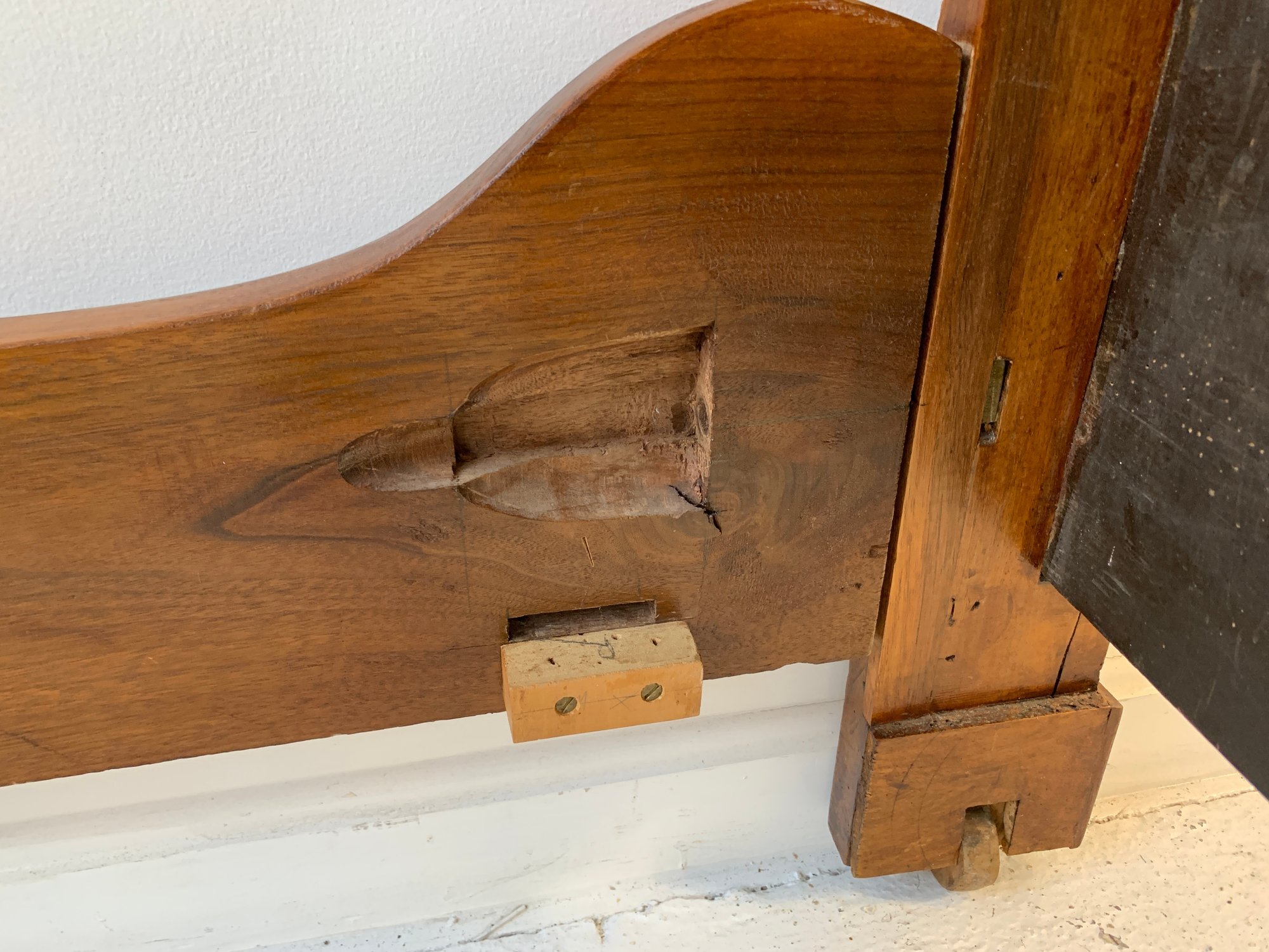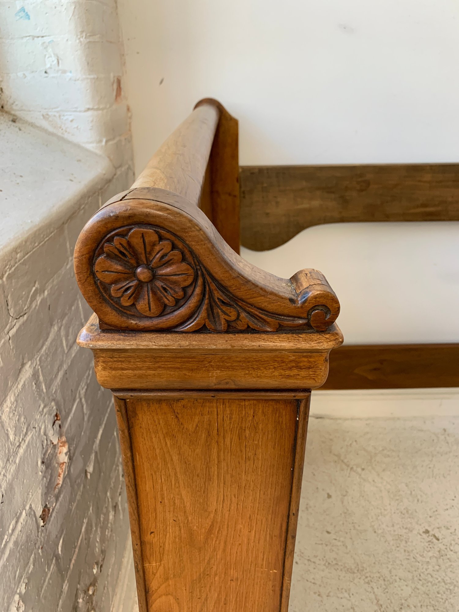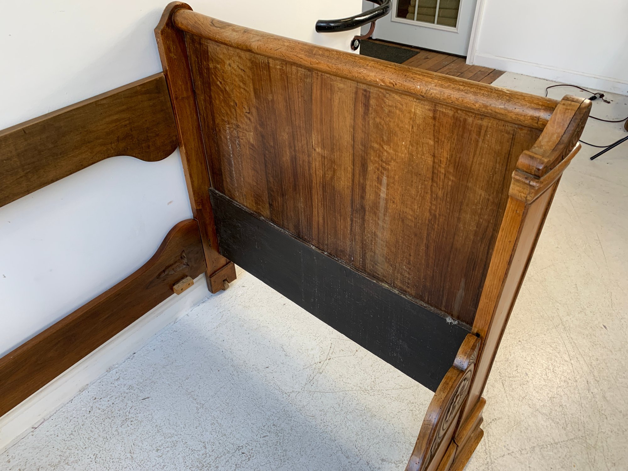 A walnut daybed in the Louis Philippe taste with scrolled rails, carved rosette and acanthus volutes at the corners, paneled sides, and block feet. Original iron bed bolt hardware intact.