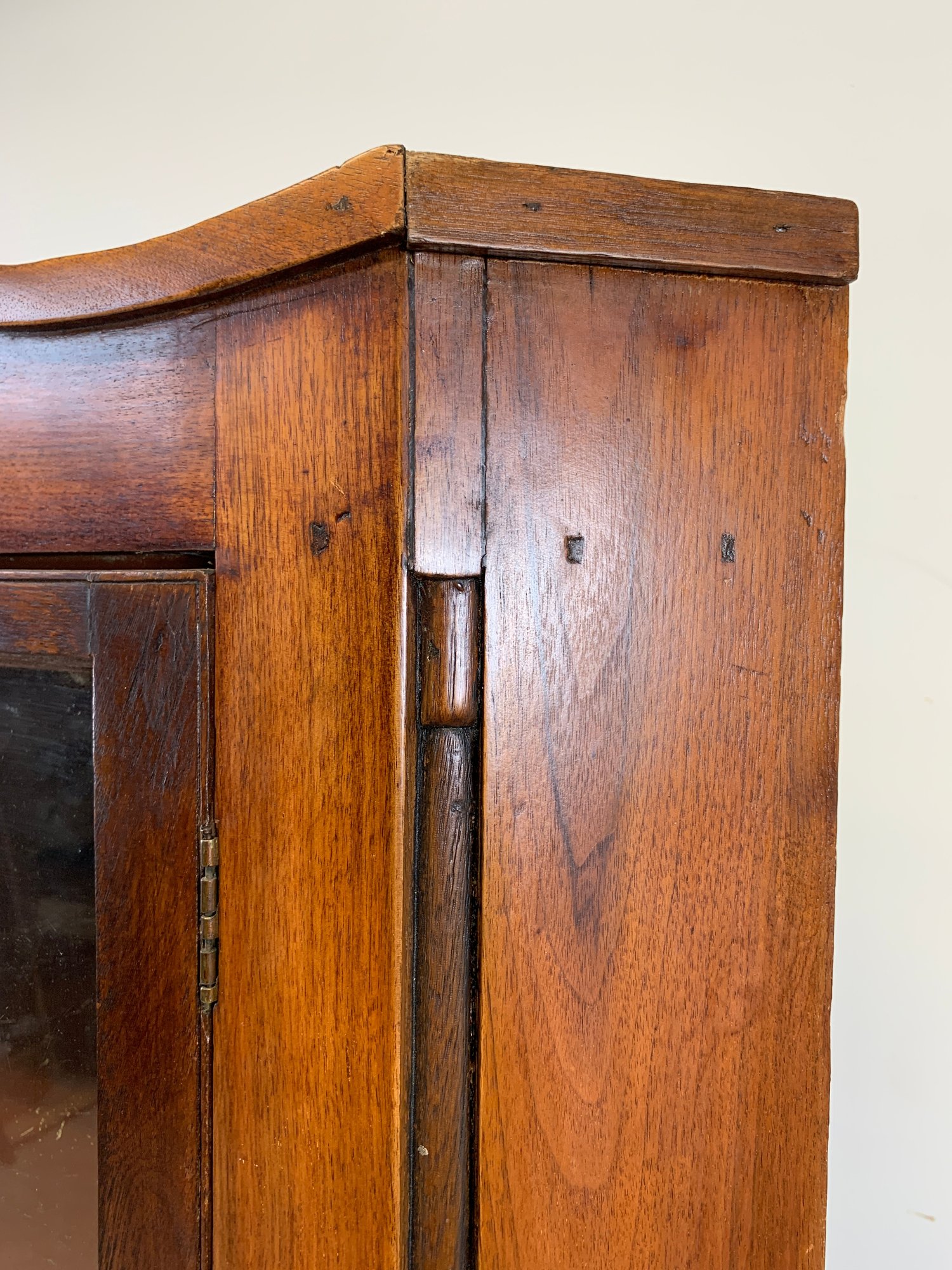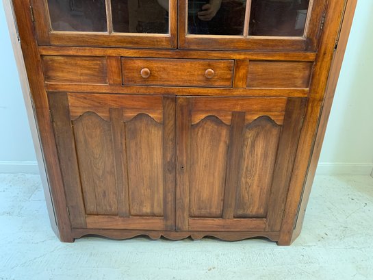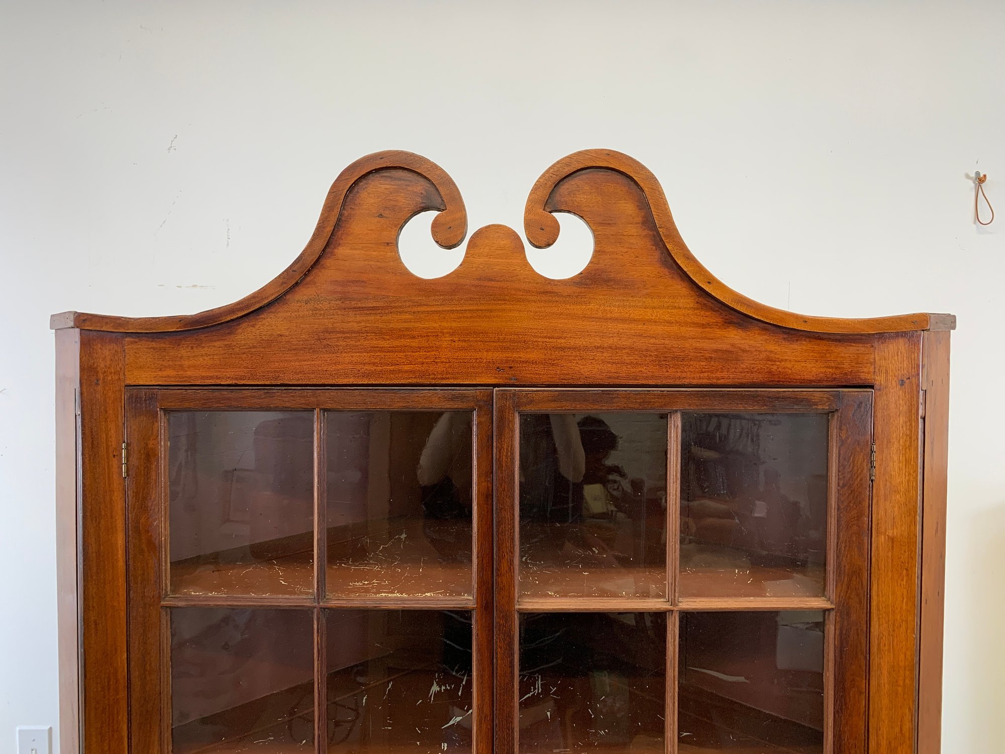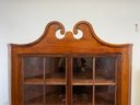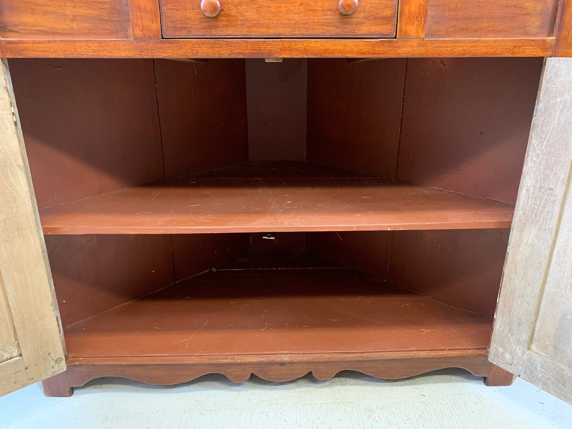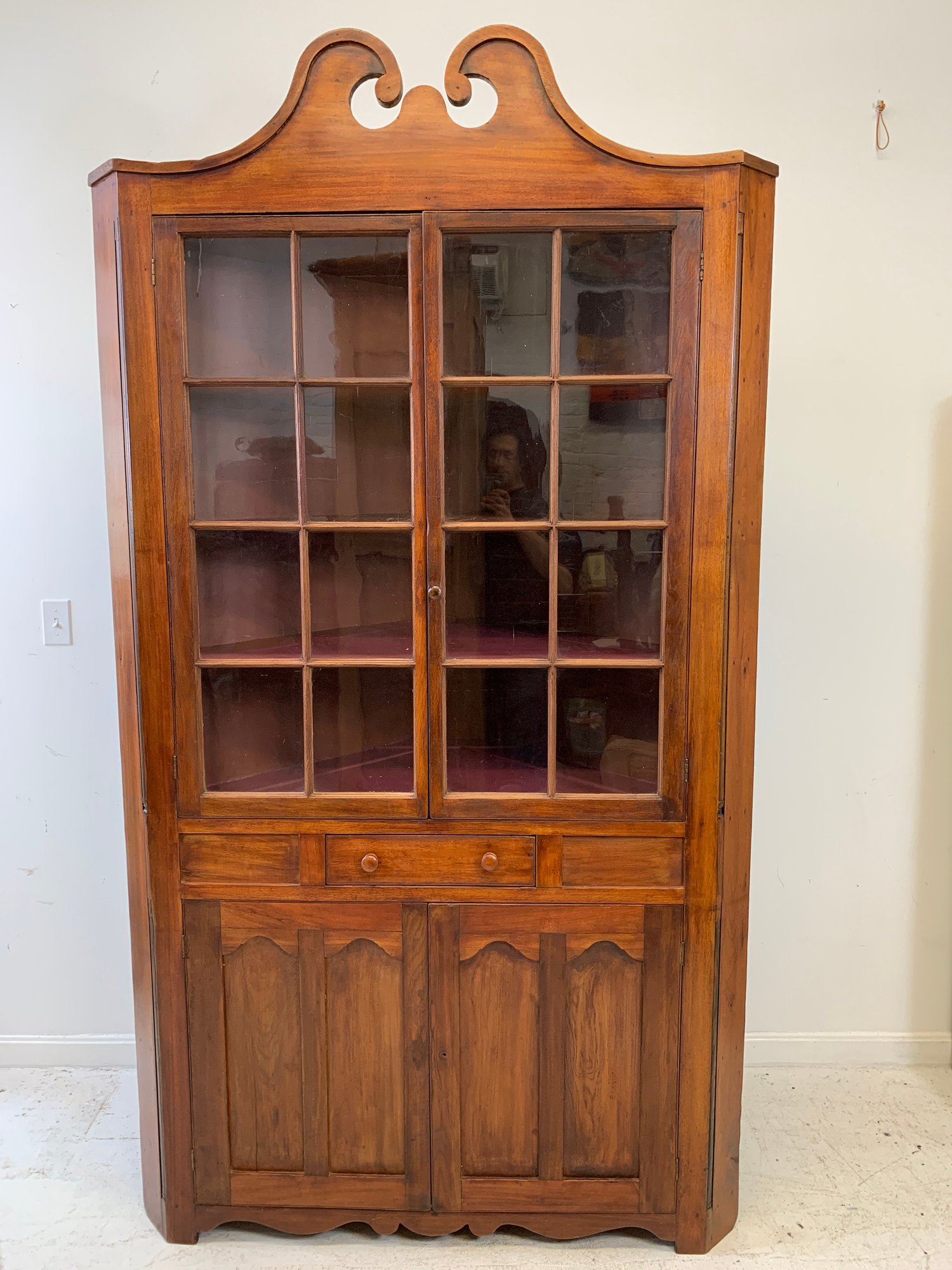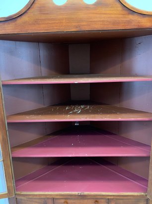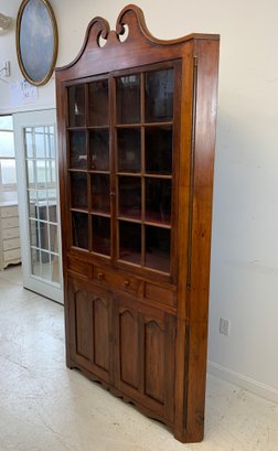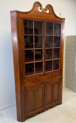 One-piece corner cupboard with broken arch pediment, upper section with two 8-pane glazed doors and four interior shelves with painted interior, single drawer with turned wood knobs and hand-cut dovetail construction, lower section with two paneled doors and scalloped apron. Original pine back boards. Circa 1800-1830.