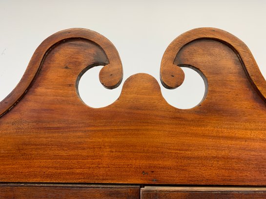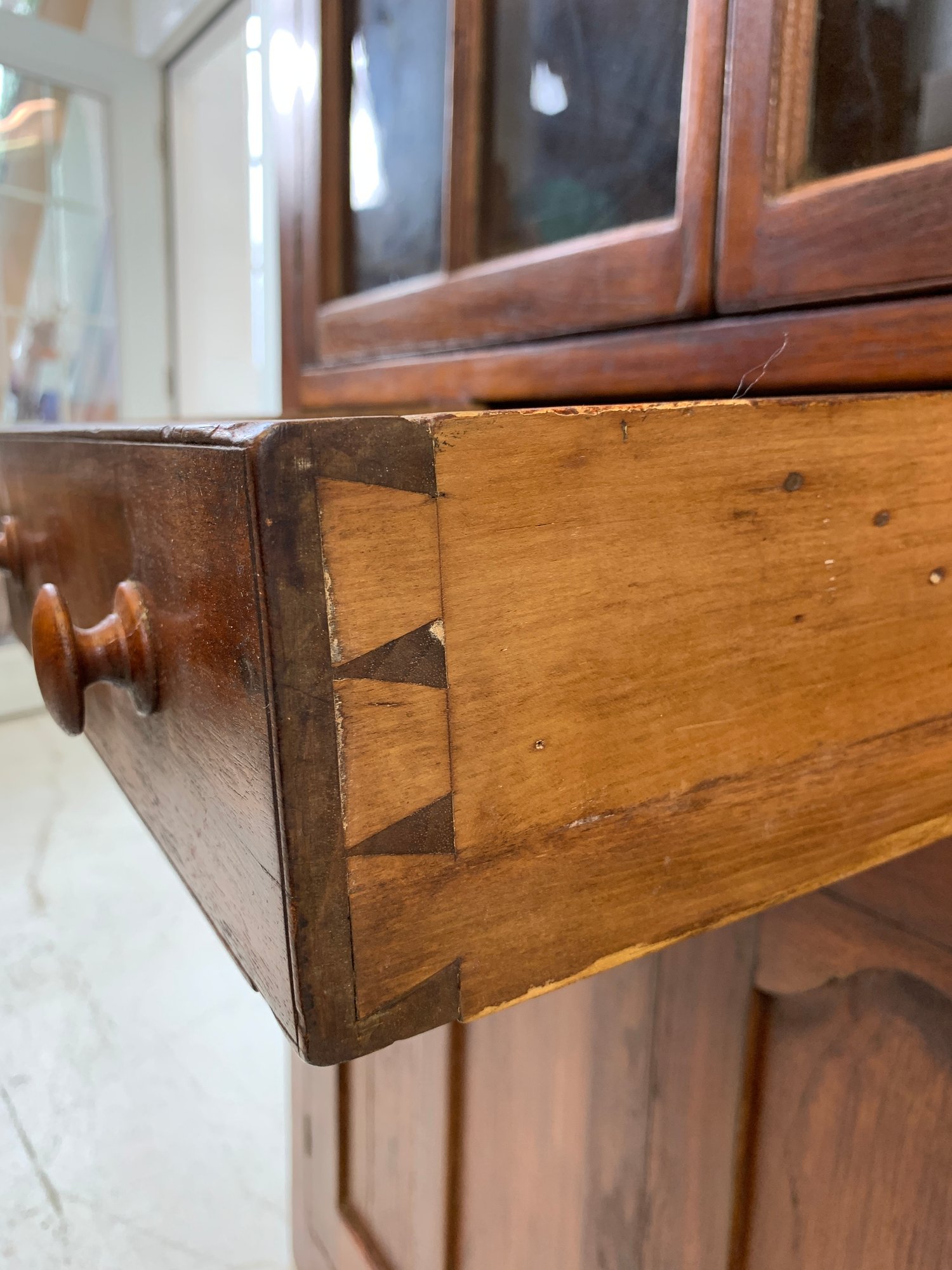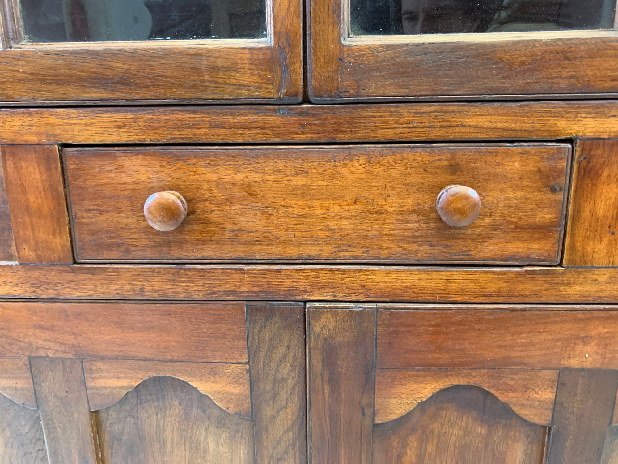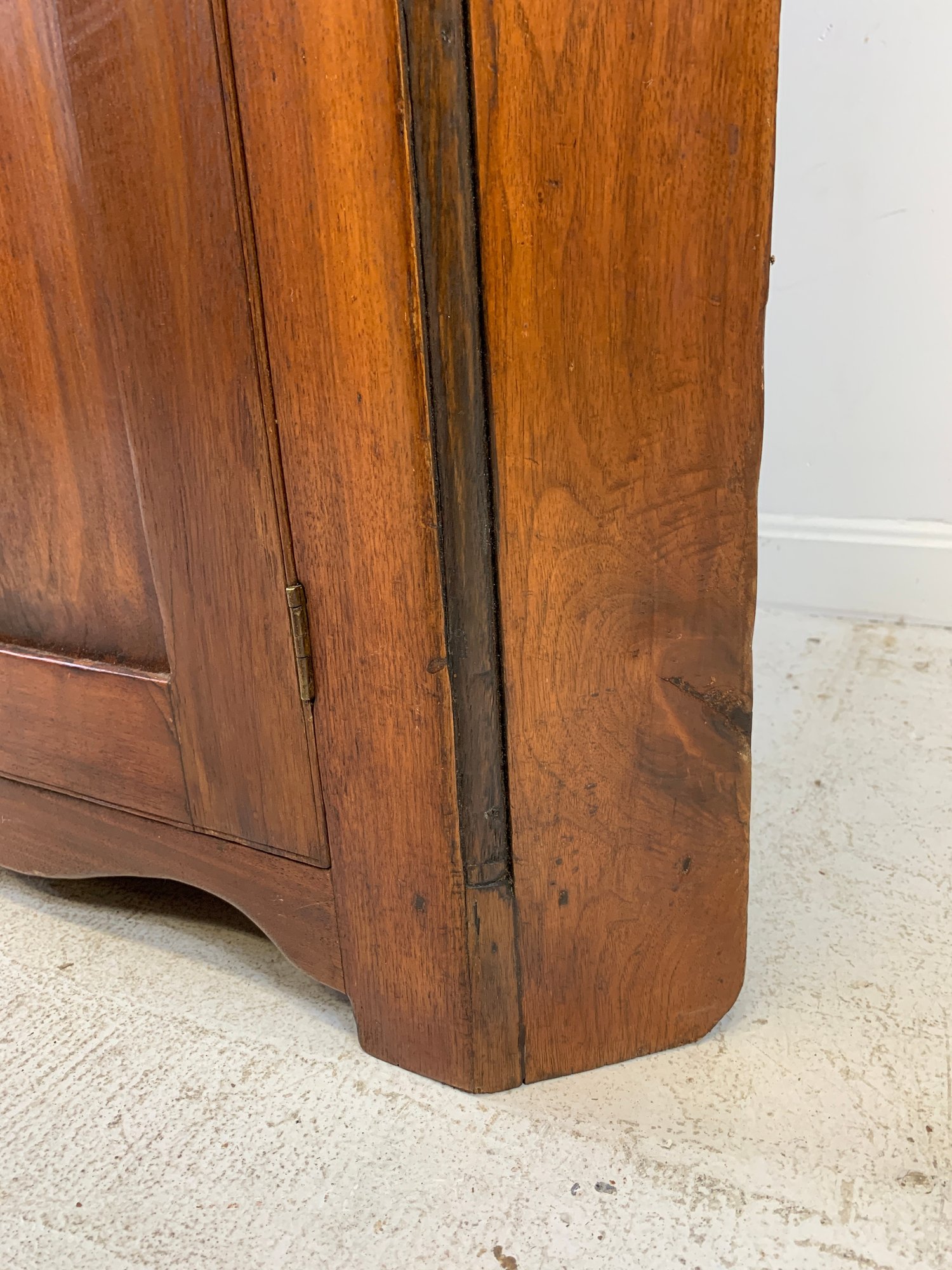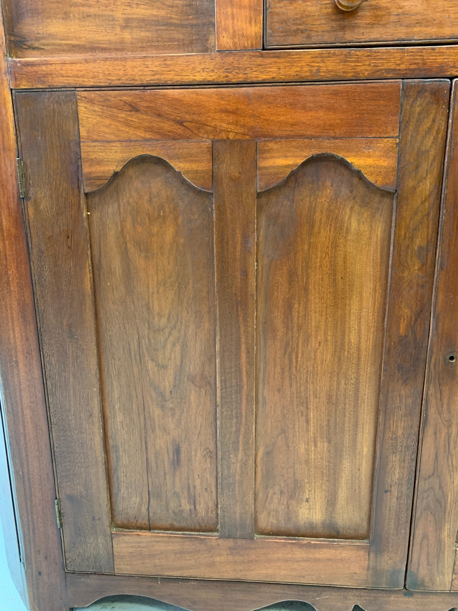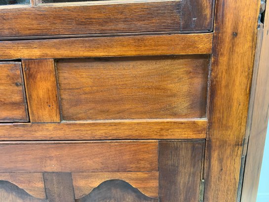 One-piece corner cupboard with broken arch pediment, upper section with two 8-pane glazed doors and four interior shelves with painted interior, single drawer with turned wood knobs and hand-cut dovetail construction, lower section with two paneled doors and scalloped apron. Original pine back boards. Circa 1800-1830.