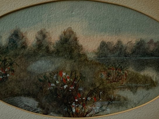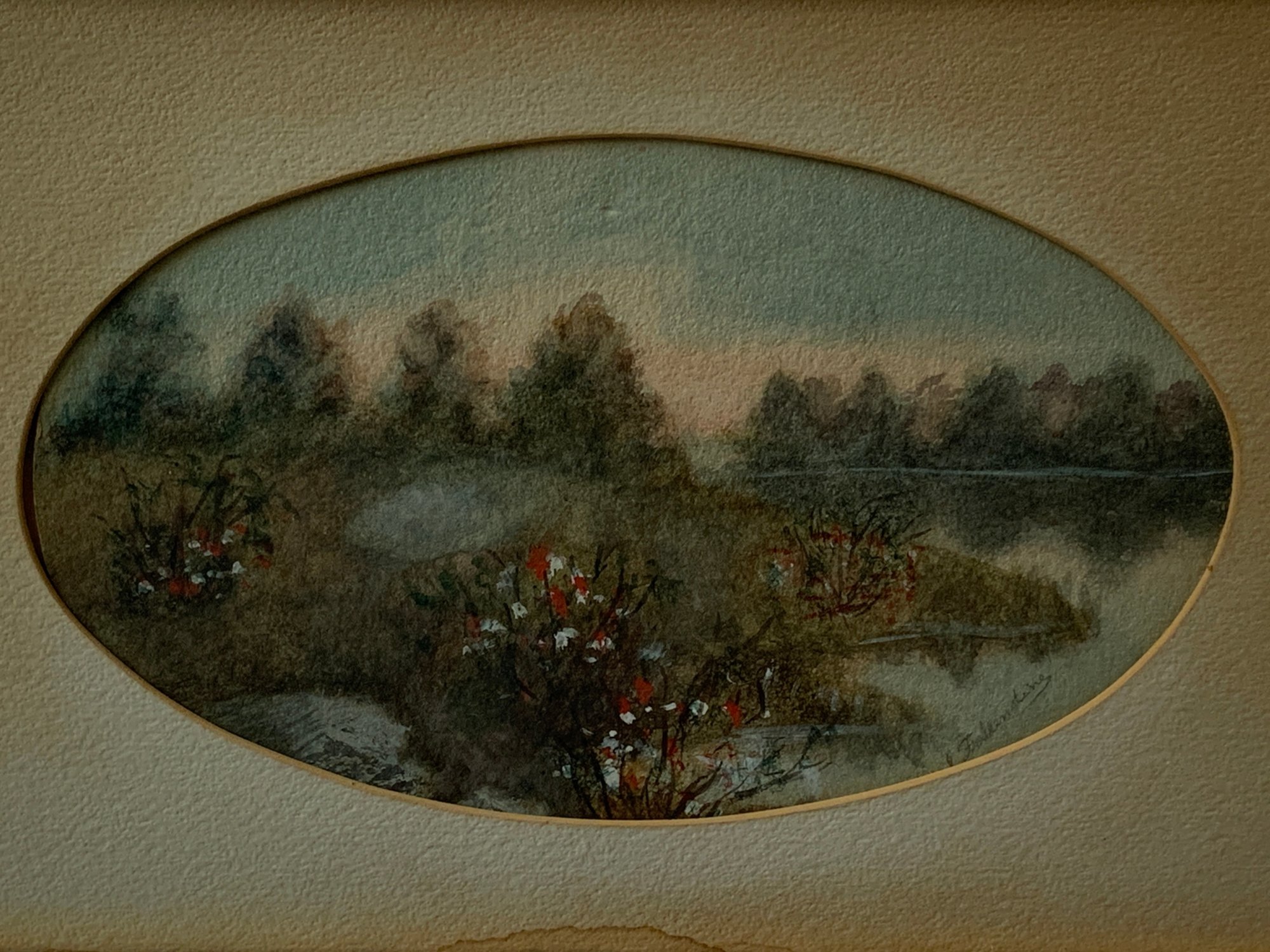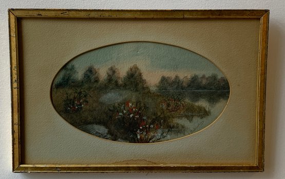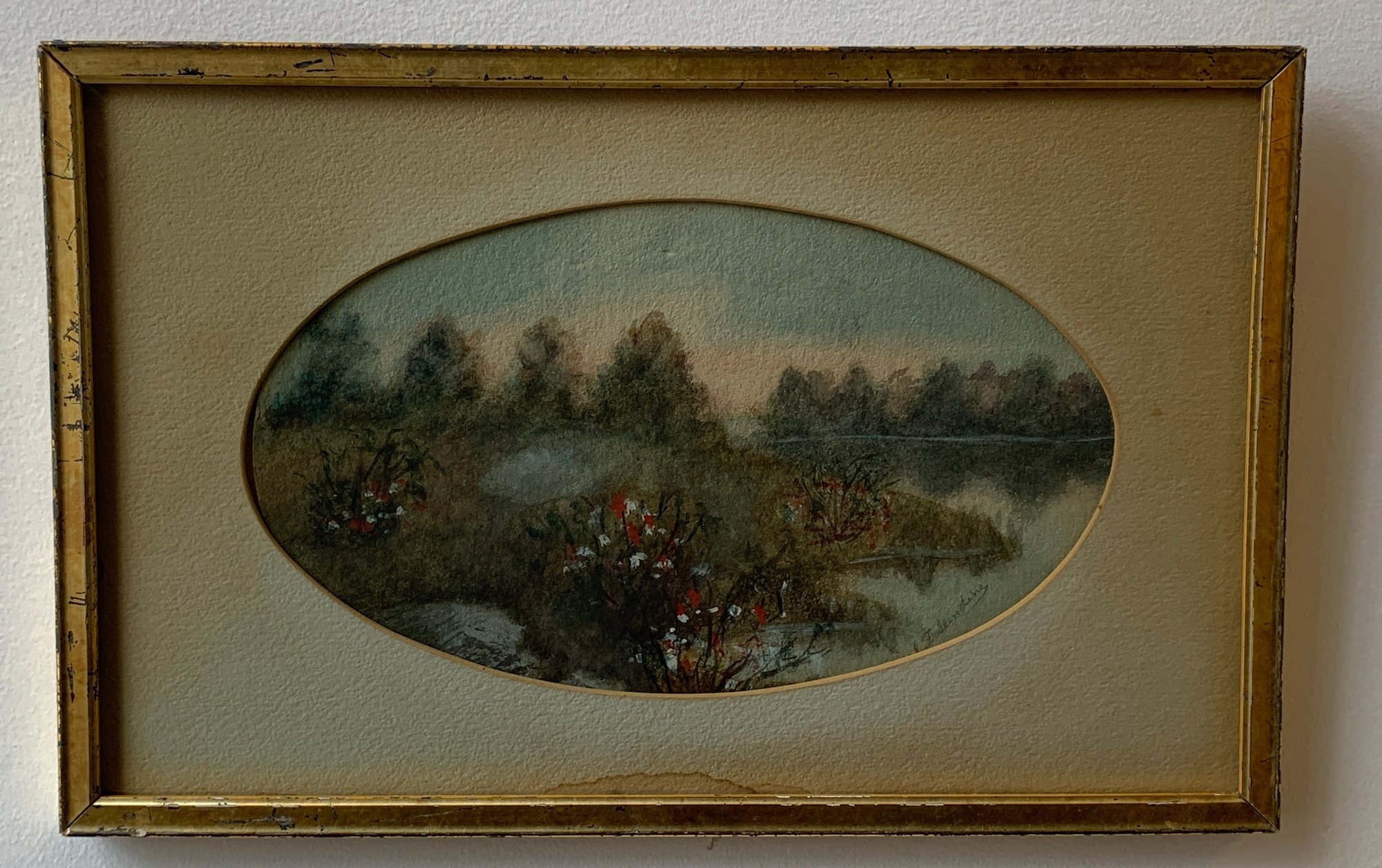 A riverside scene with flowering red and white shrubs in the foreground, calm reflective water, and a soft treeline fading into a pink and grey sky. Executed in a style reminiscent of American Tonalist watercolorist William Chandler.