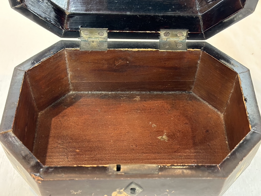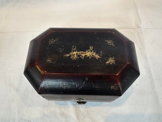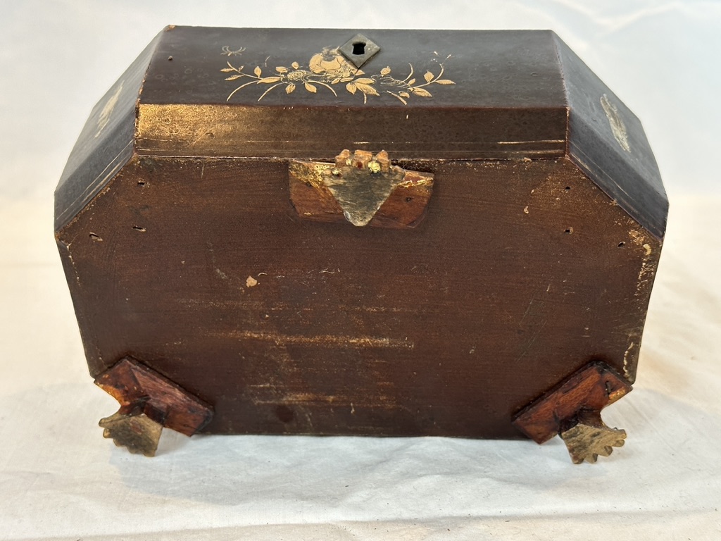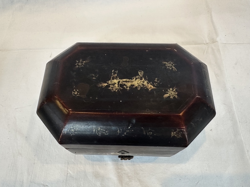 A lacquered box featuring gilt decorated figures and elements. Tripod footed with lift top and pewter key lock. Early 19th century.