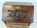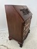 Selling a antique Chippendale style mahogany slant front desk with carved shell decoration on the front. Featuring 4 drawers with brass hardware, fluted column corners, carved ball and claw feet, and carved skirt. All the drawers are dovetailed and the top is dovetailed as well. Comes with 2 keys, one for the drawers and one for the slant front. A great narrow size.
