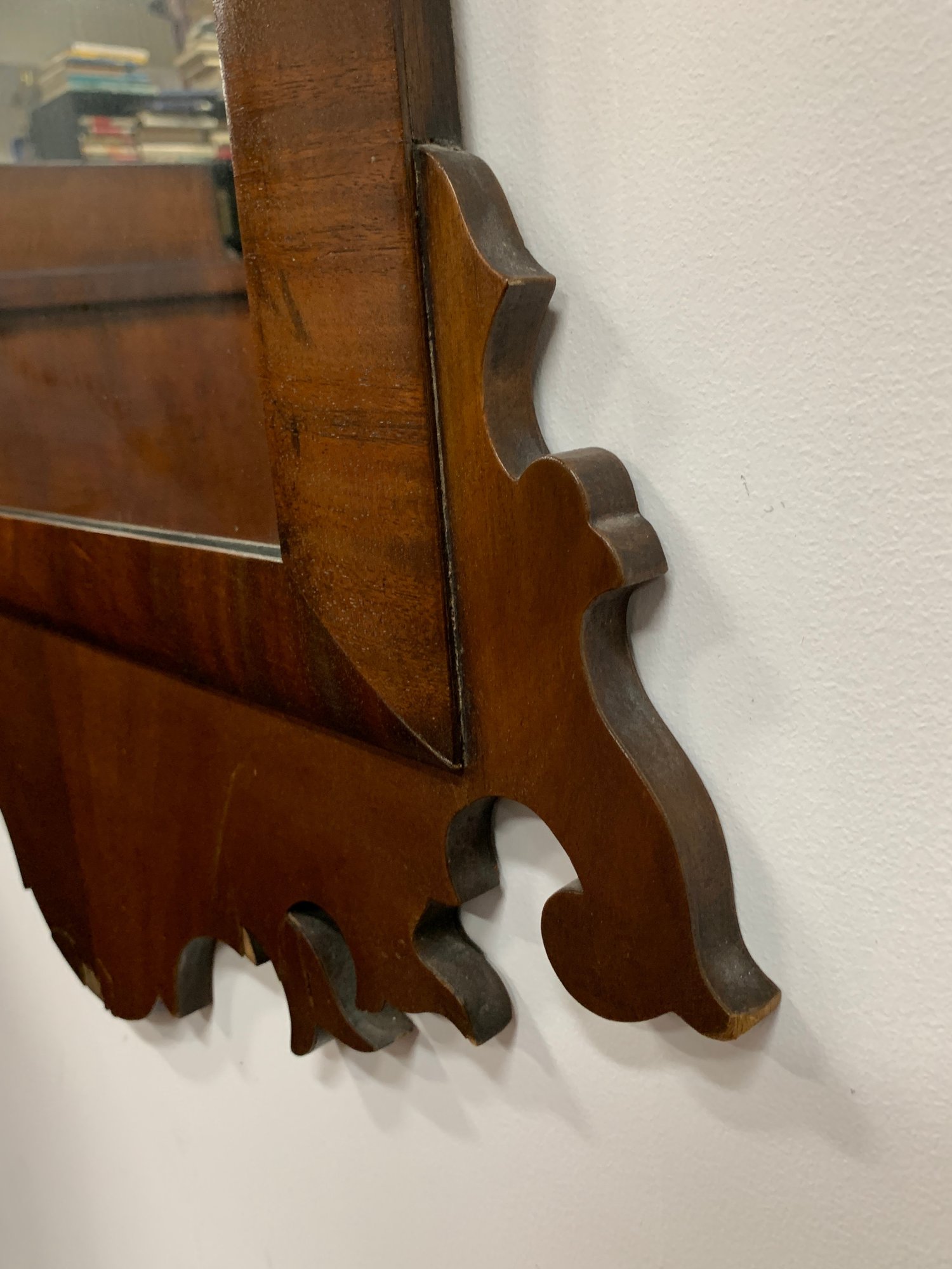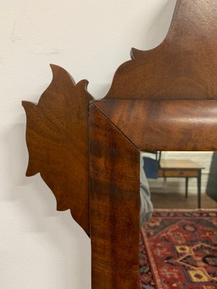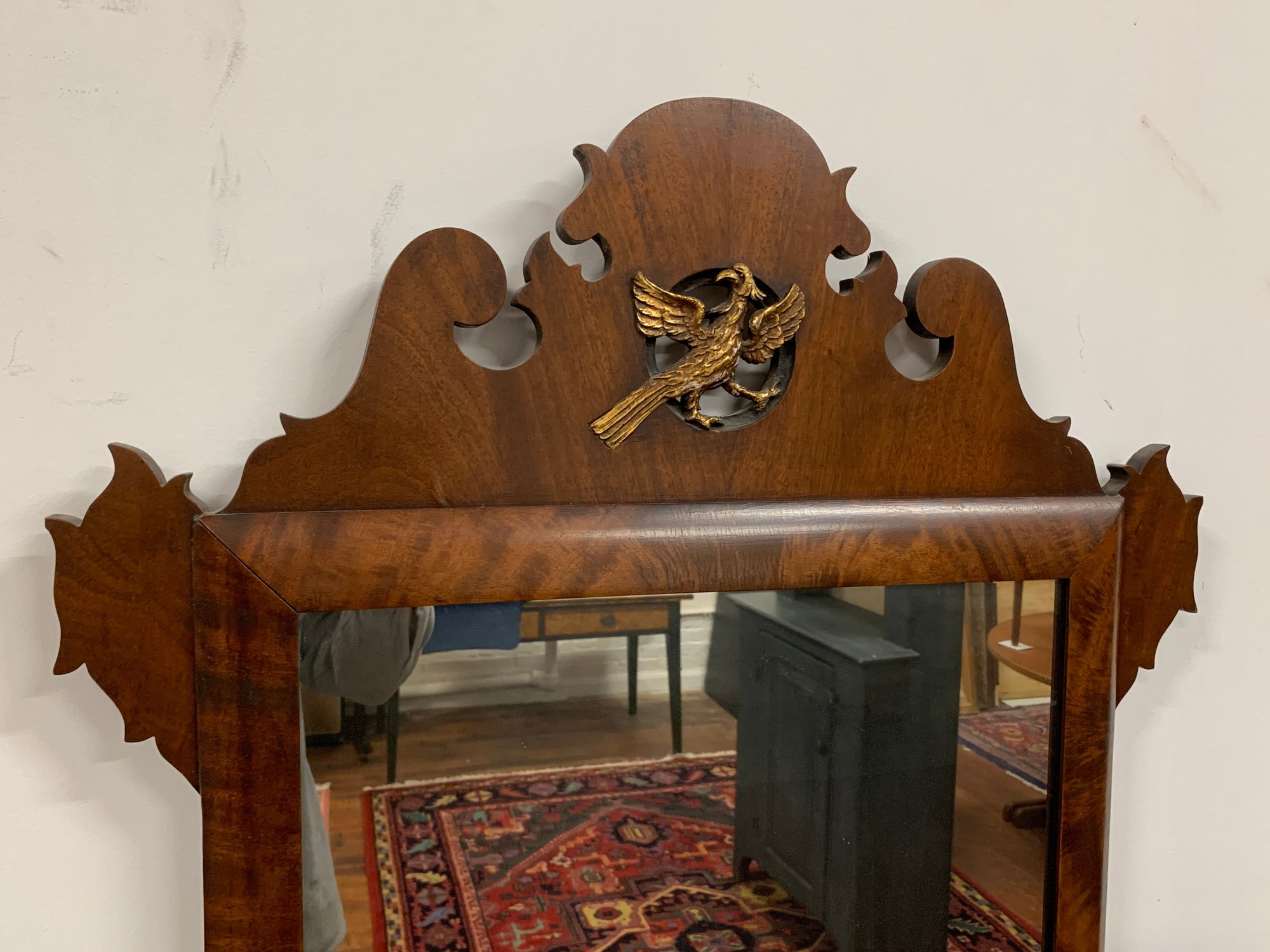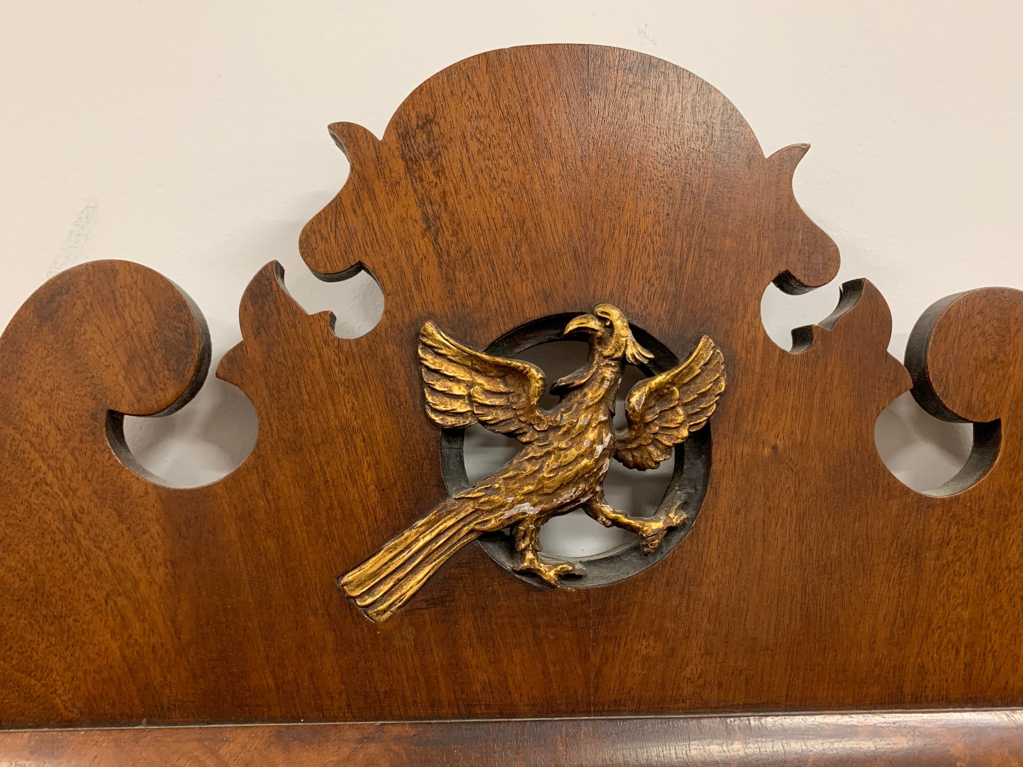 Figured mahogany with shaped and scrolled fretwork crest centering a gilt eagle applique. Shaped apron below. Glass replaced later. A classic American Federal/Chippendale form. 19th century.