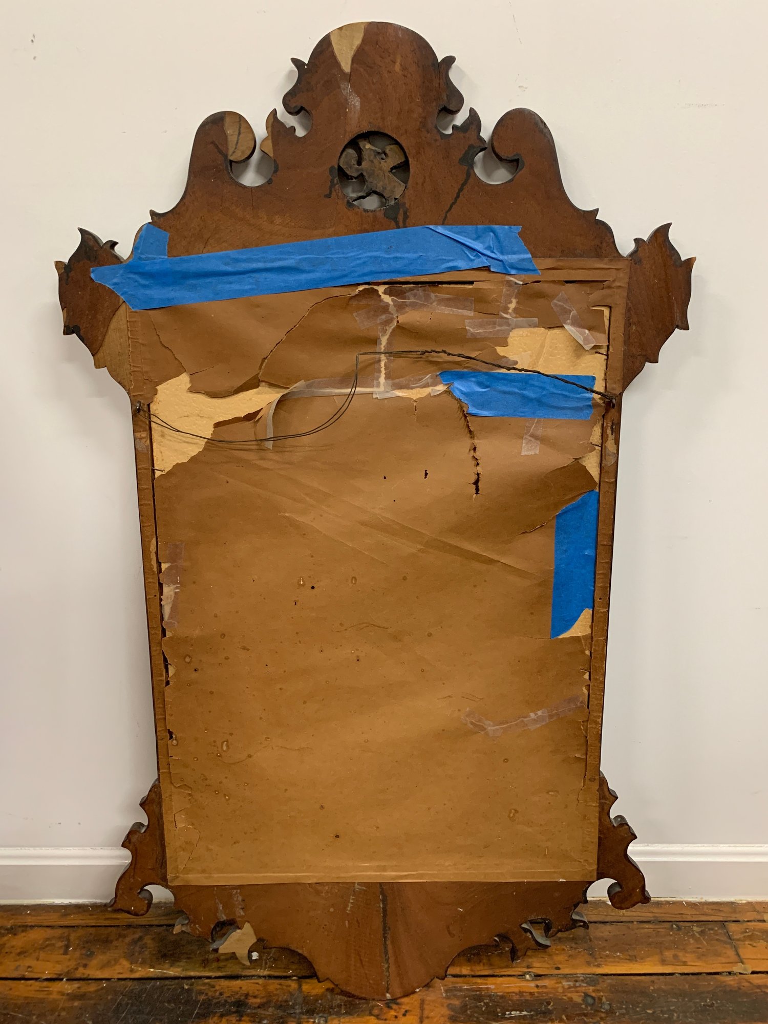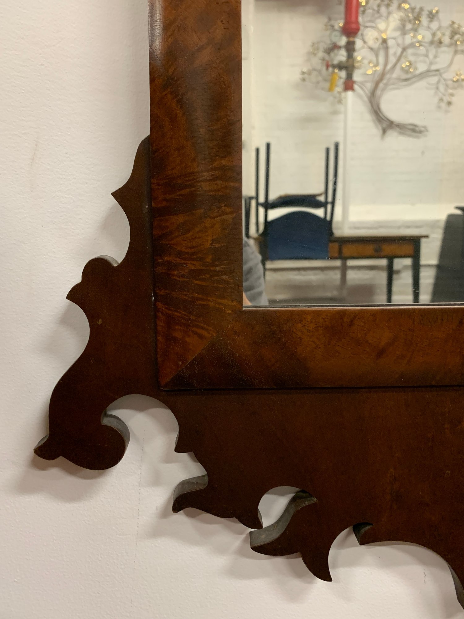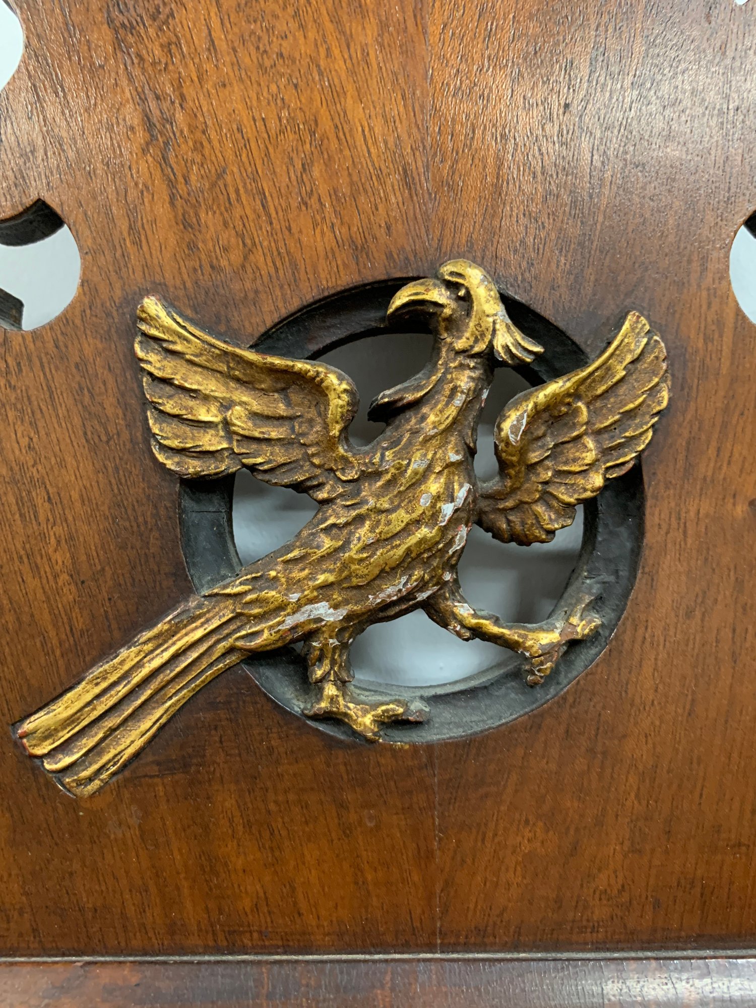 Figured mahogany with shaped and scrolled fretwork crest centering a gilt eagle applique. Shaped apron below. Glass replaced later. A classic American Federal/Chippendale form. 19th century.