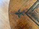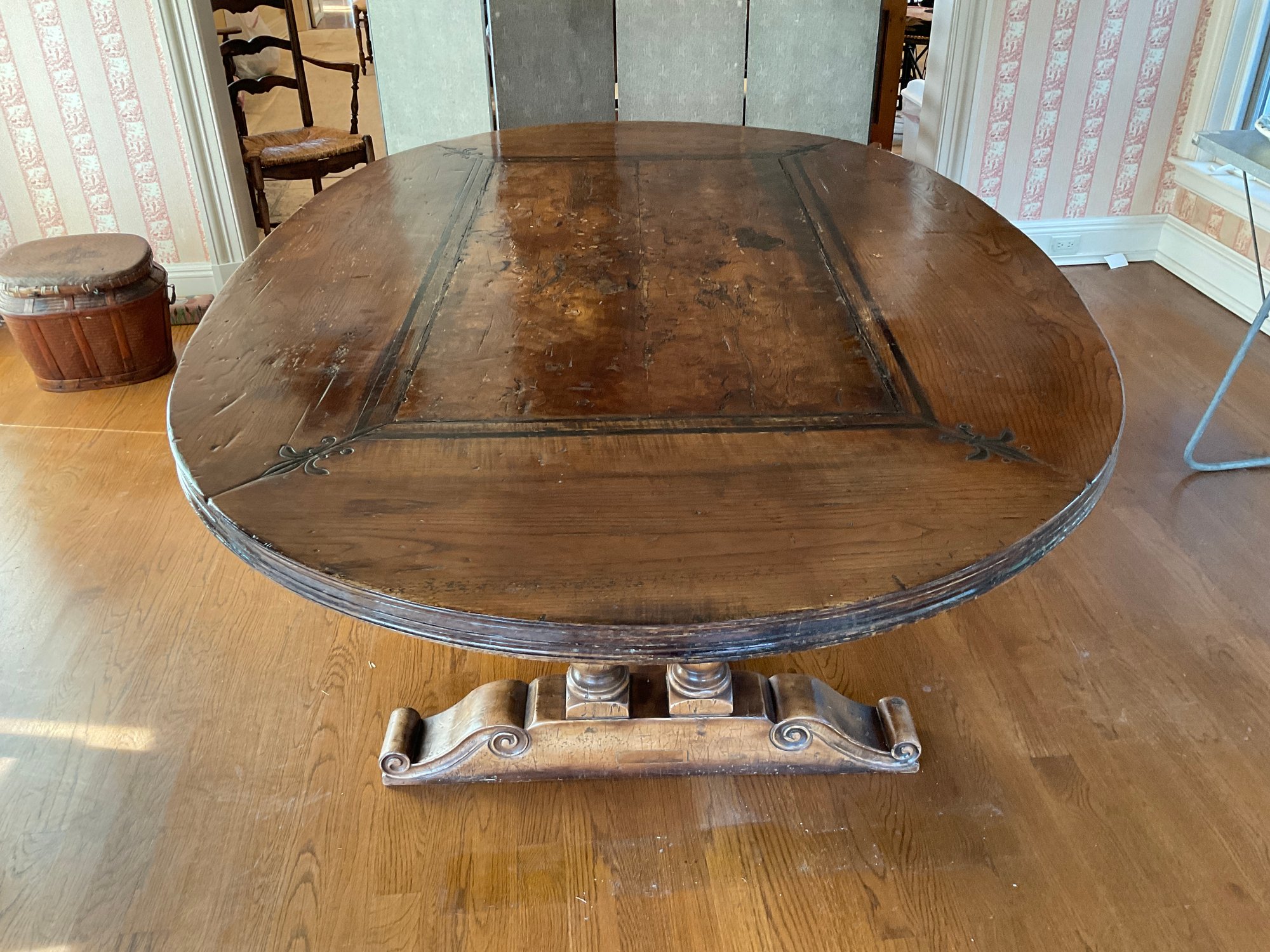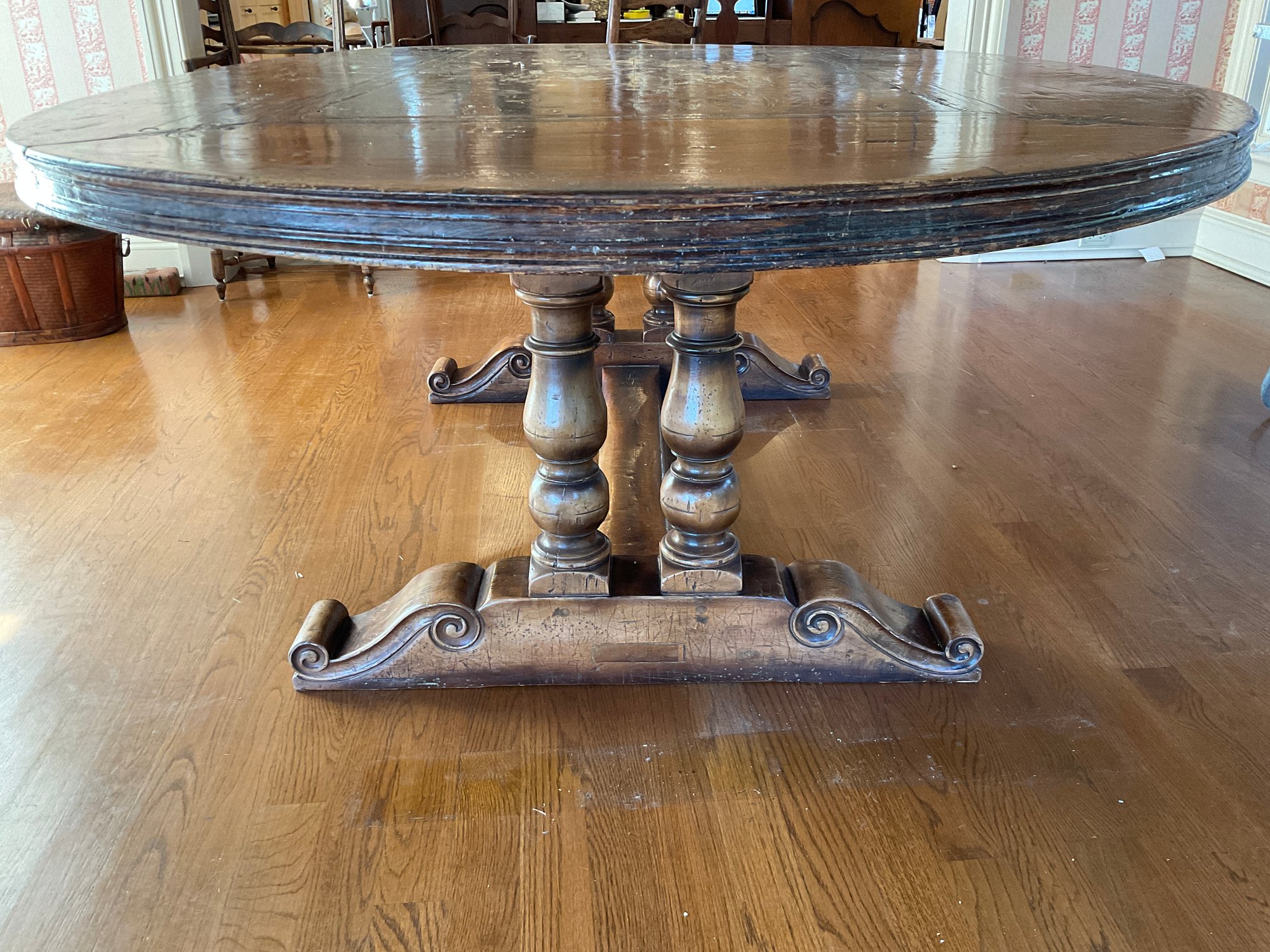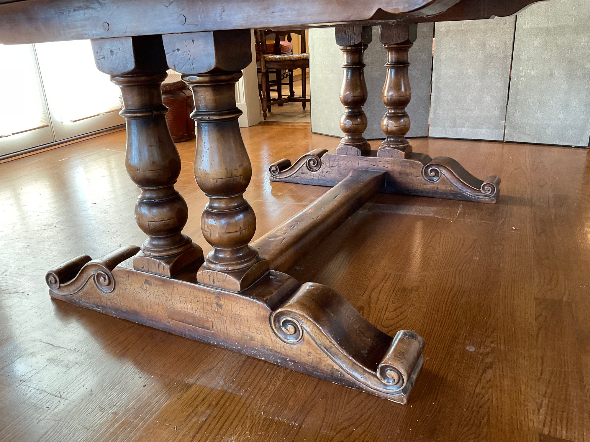Seated on a trestle base with four columns and a scroll shoe foot.