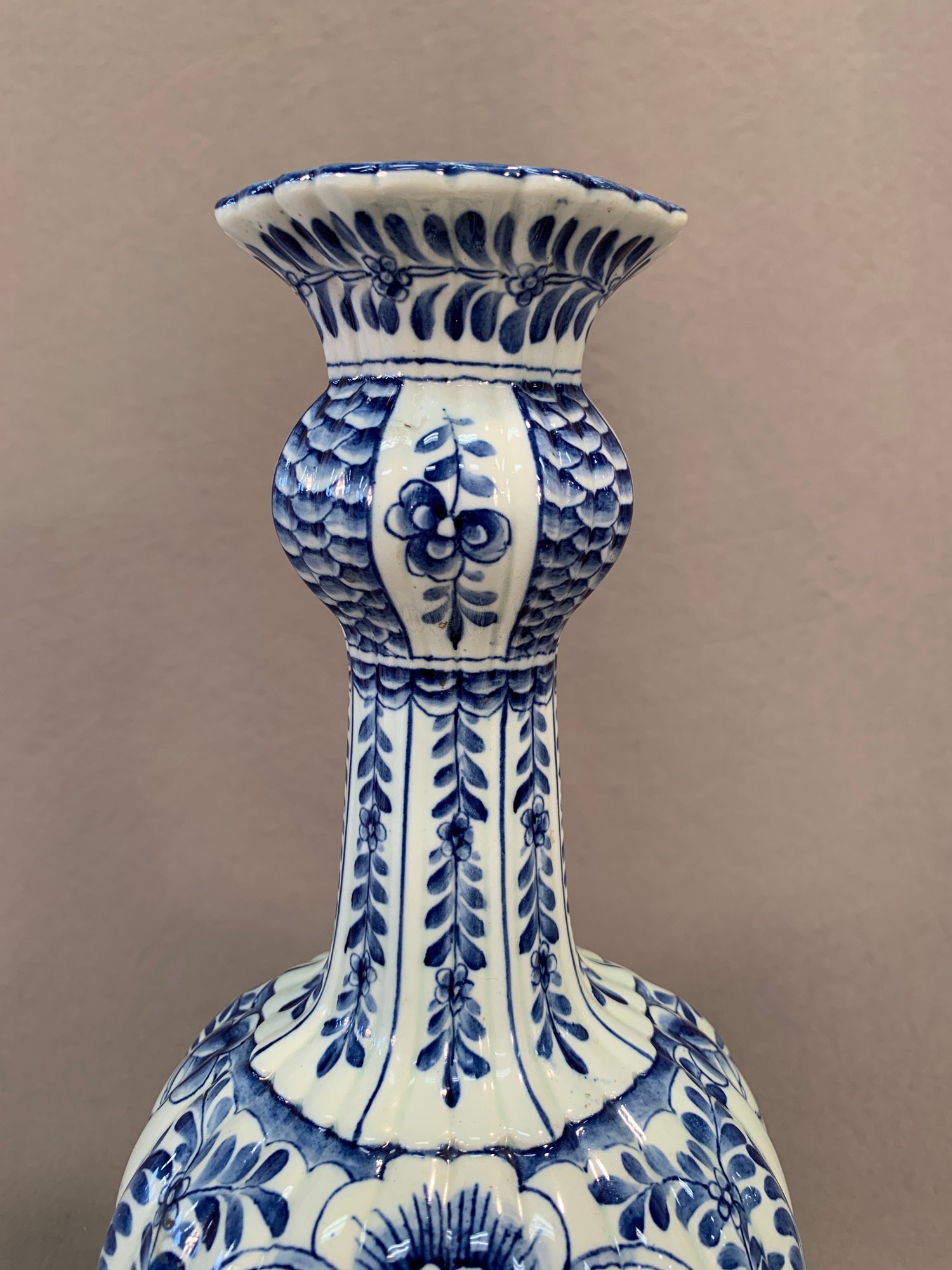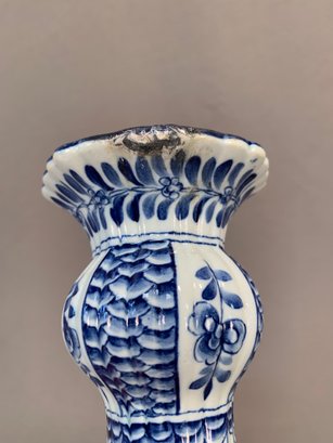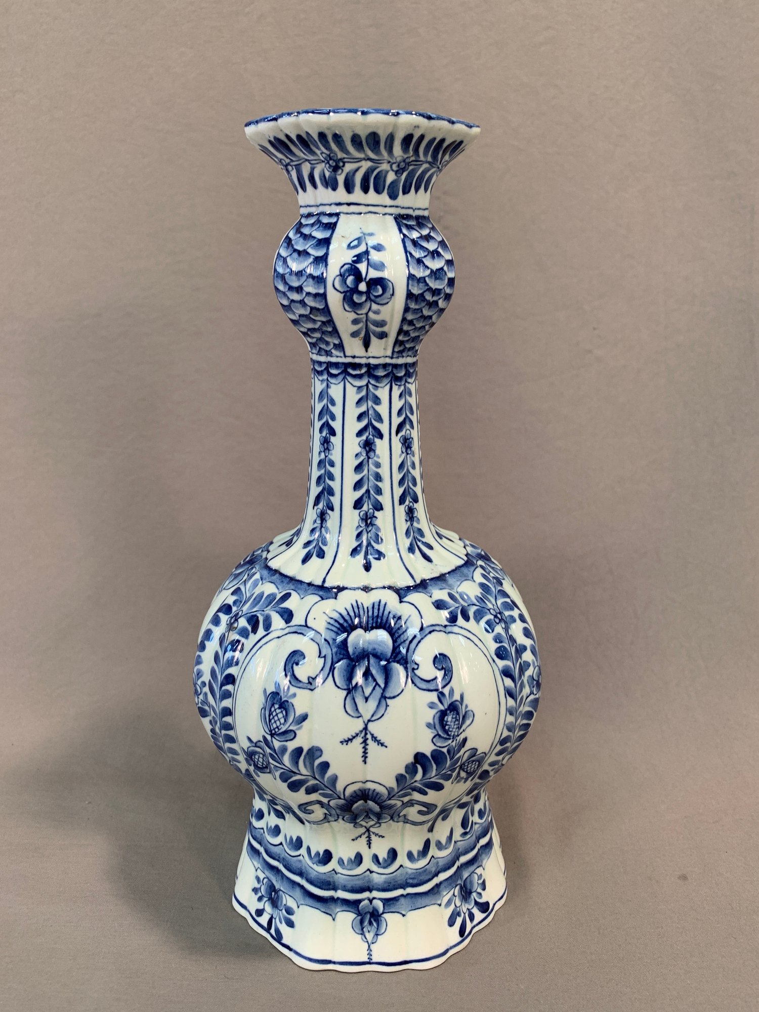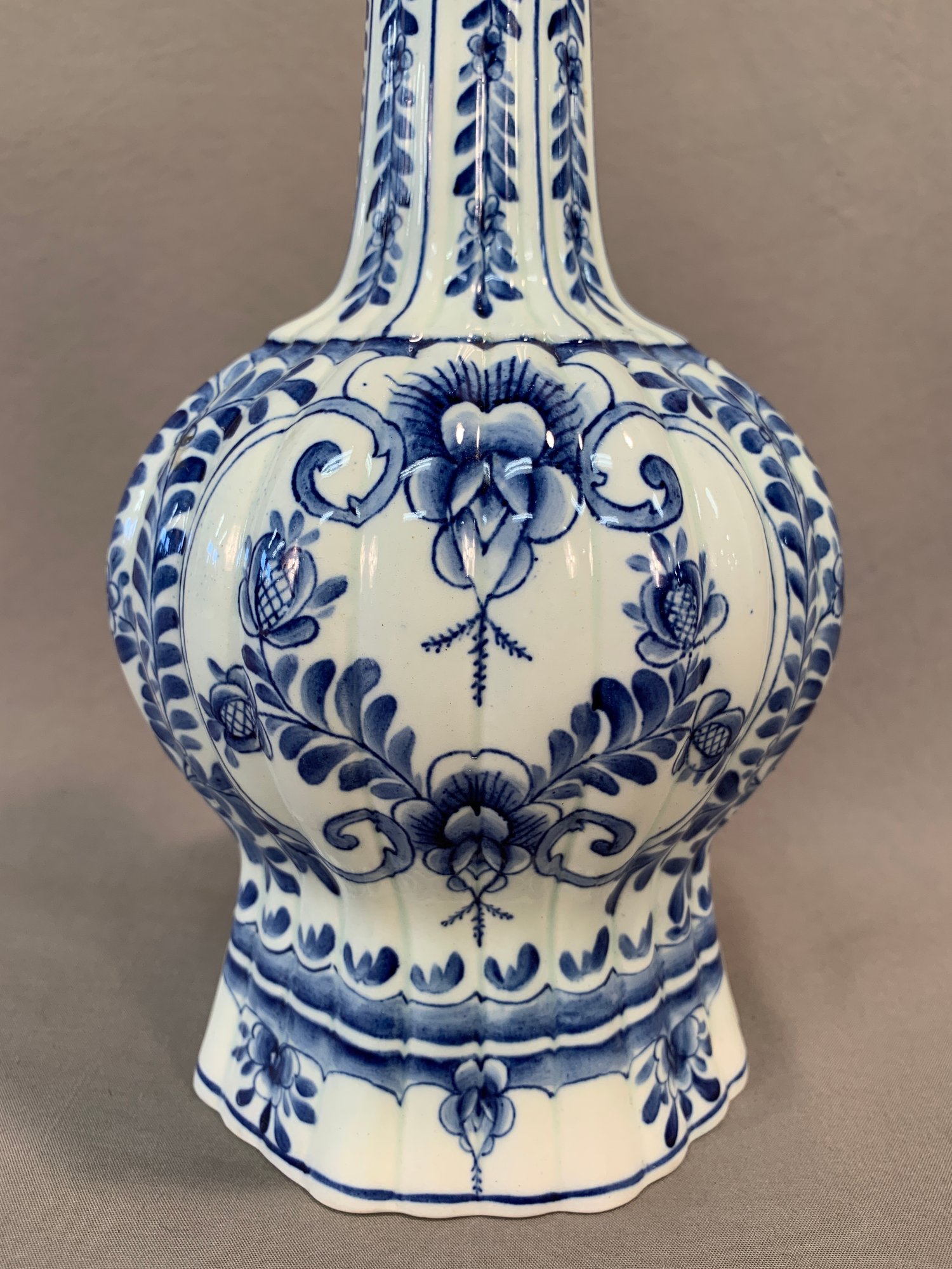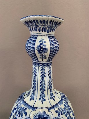 Antique 18th/19th century Dutch Delftware blue and white knob form vase with laurel leaf design, marked on bottom with initials HR, JB and bird mark, and number 891.