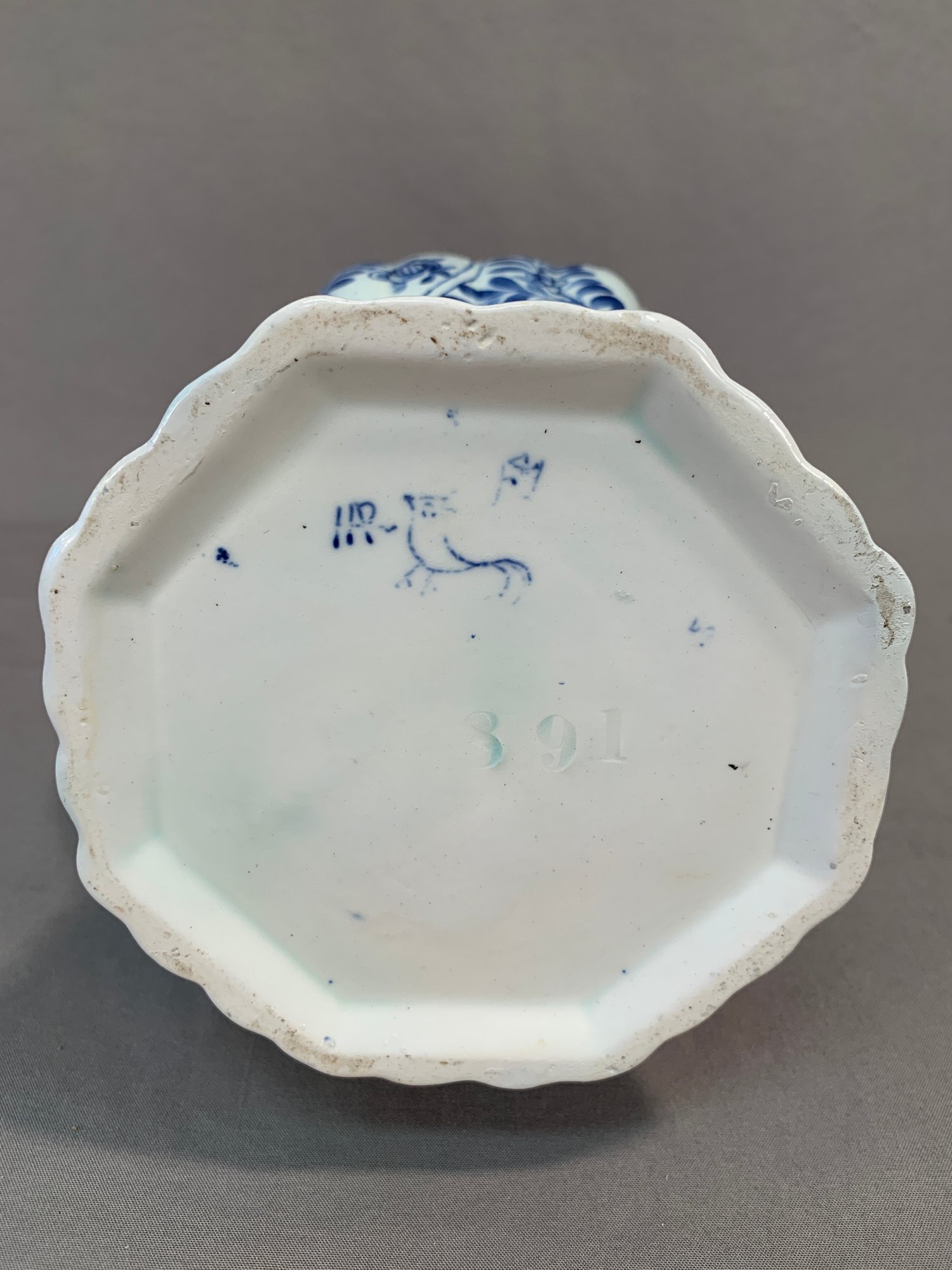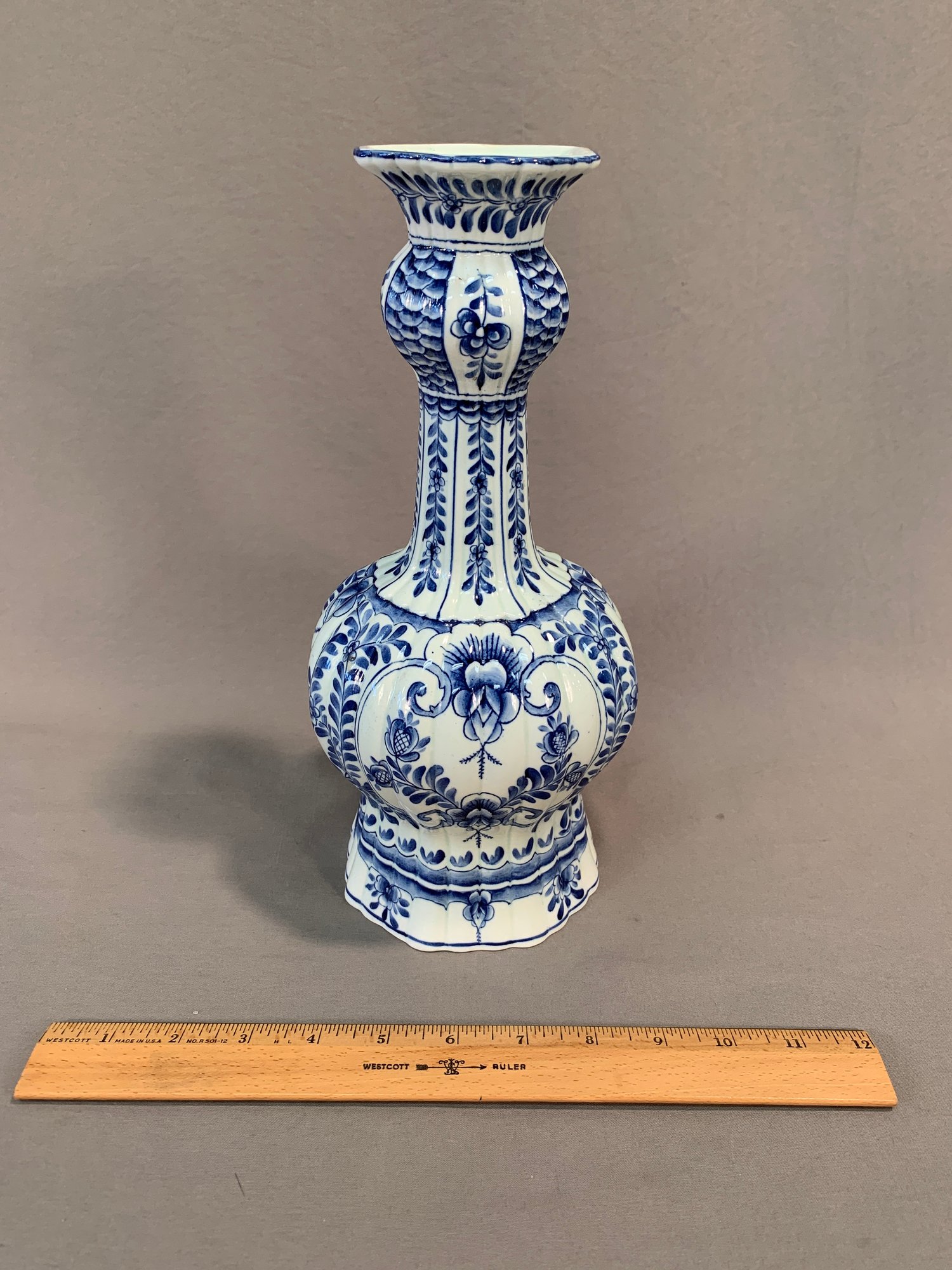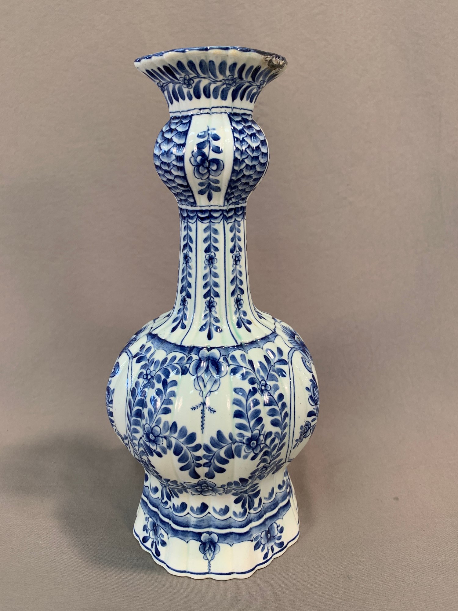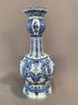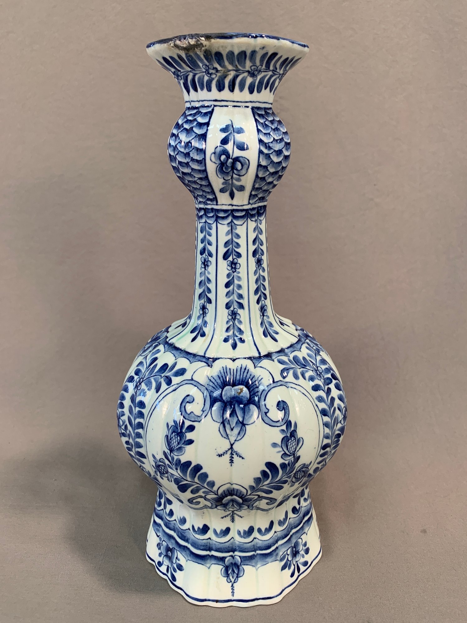 Antique 18th/19th century Dutch Delftware blue and white knob form vase with laurel leaf design, marked on bottom with initials HR, JB and bird mark, and number 891.