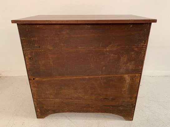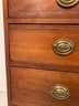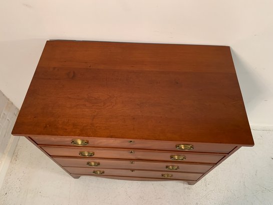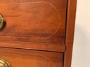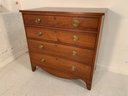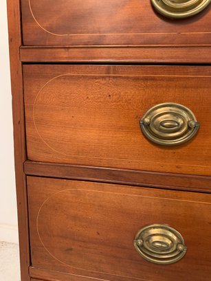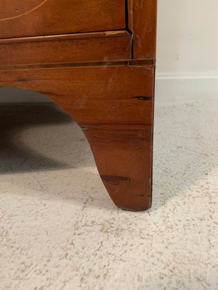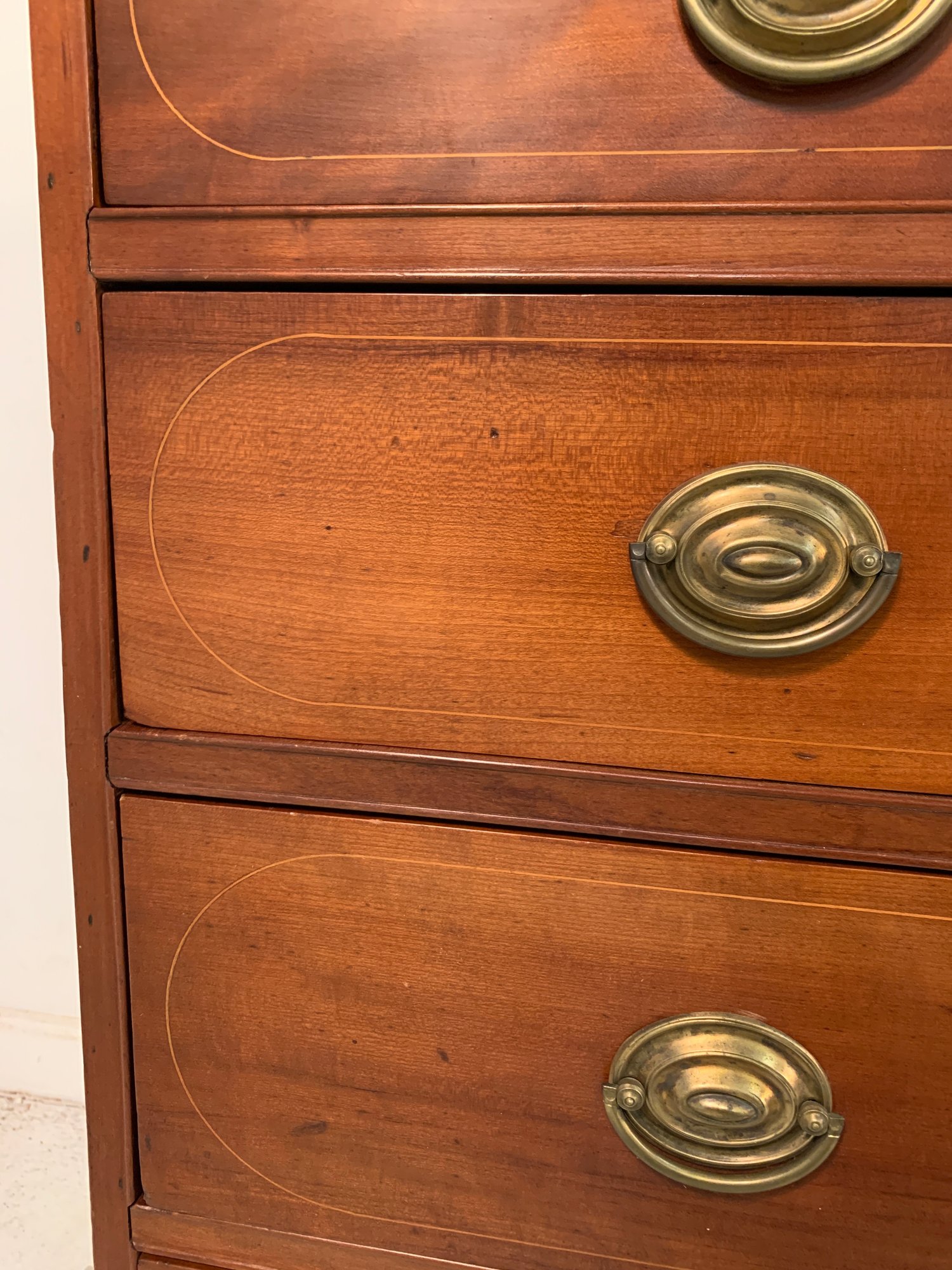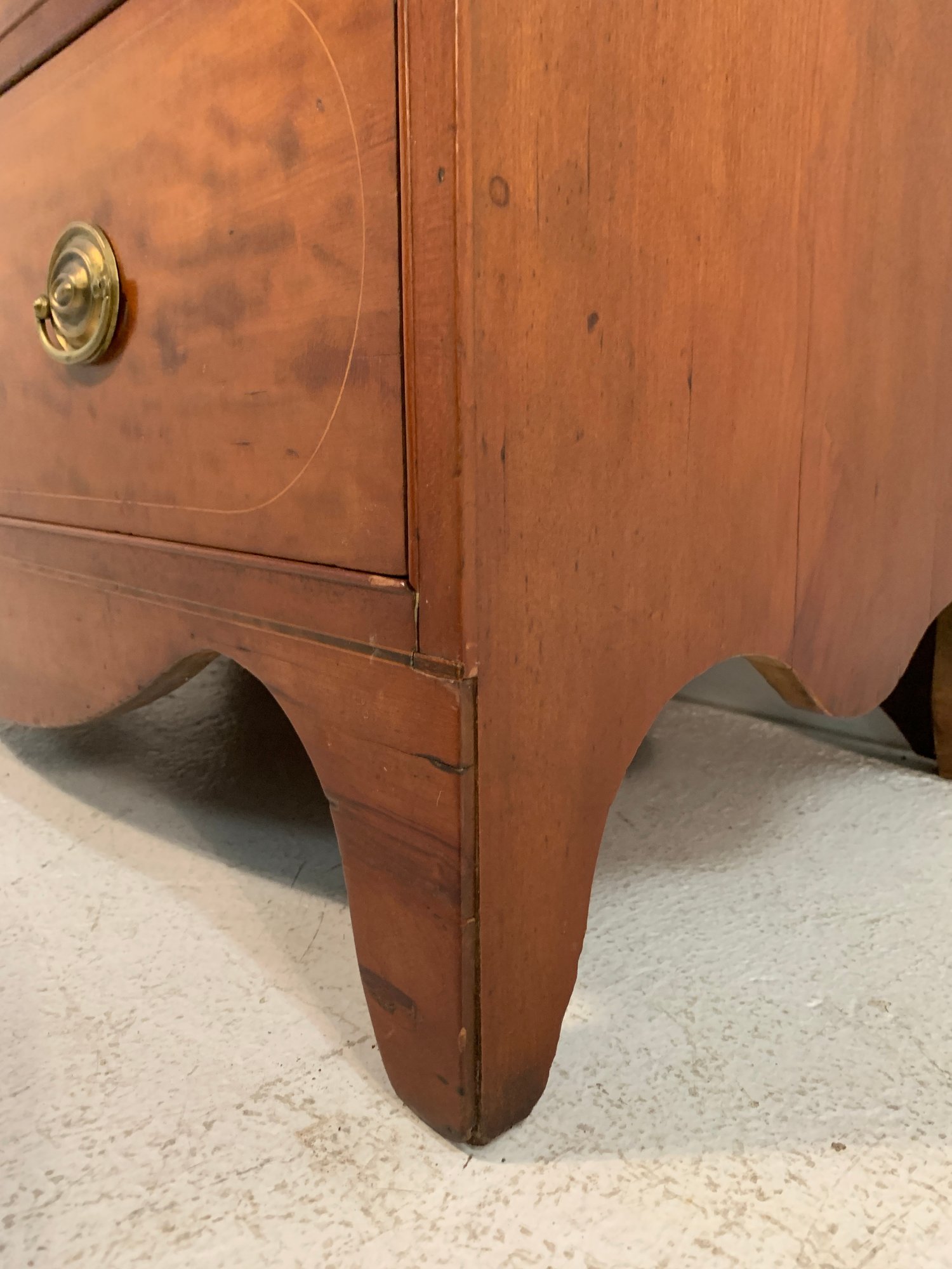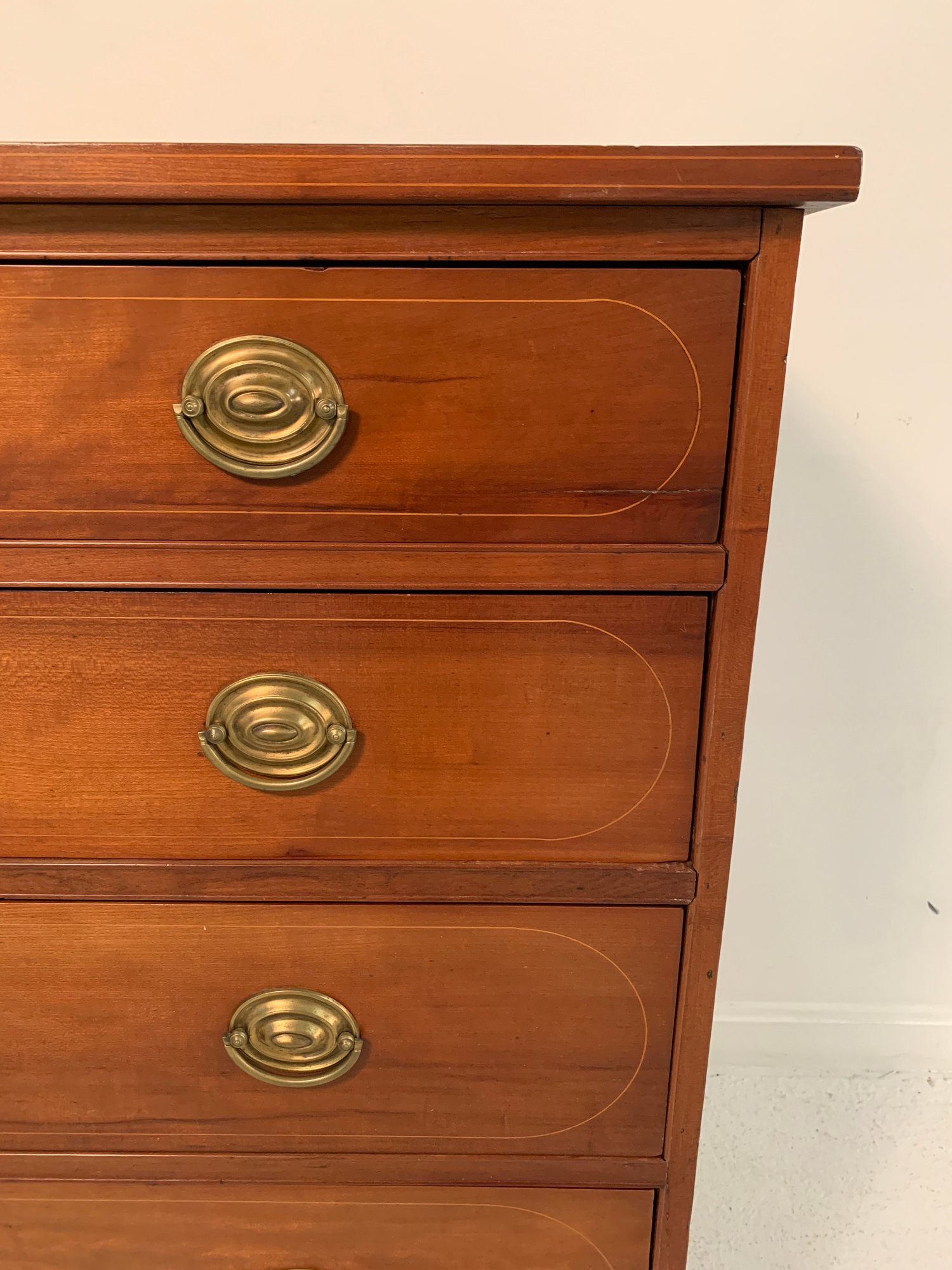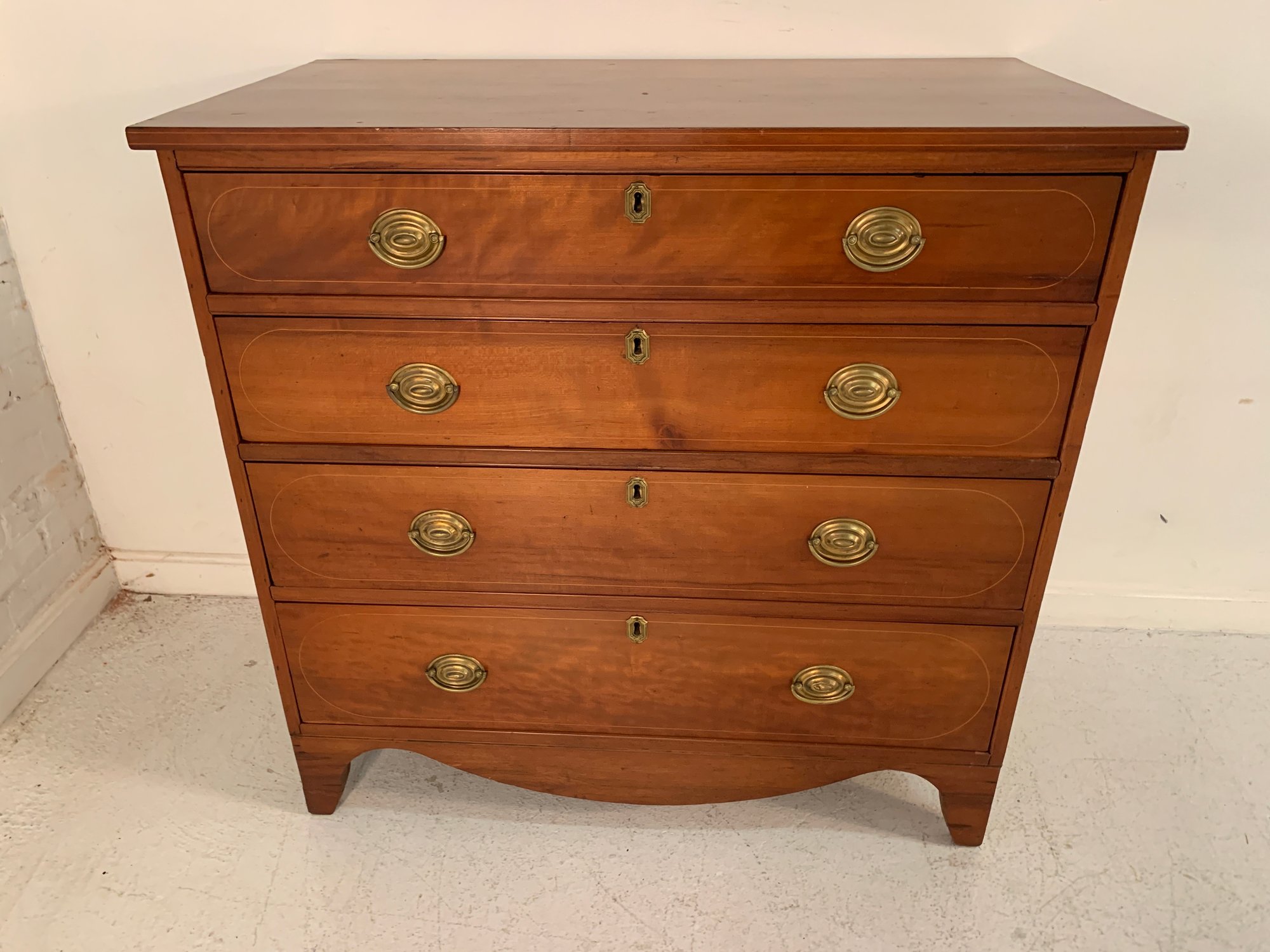 Early American Federal period Hepplewhite 4 drawer chest, likely made in Connecticut. This cherry chest features four graduated drawers with delicate banded inlay and a drop (petticoat) skirt.