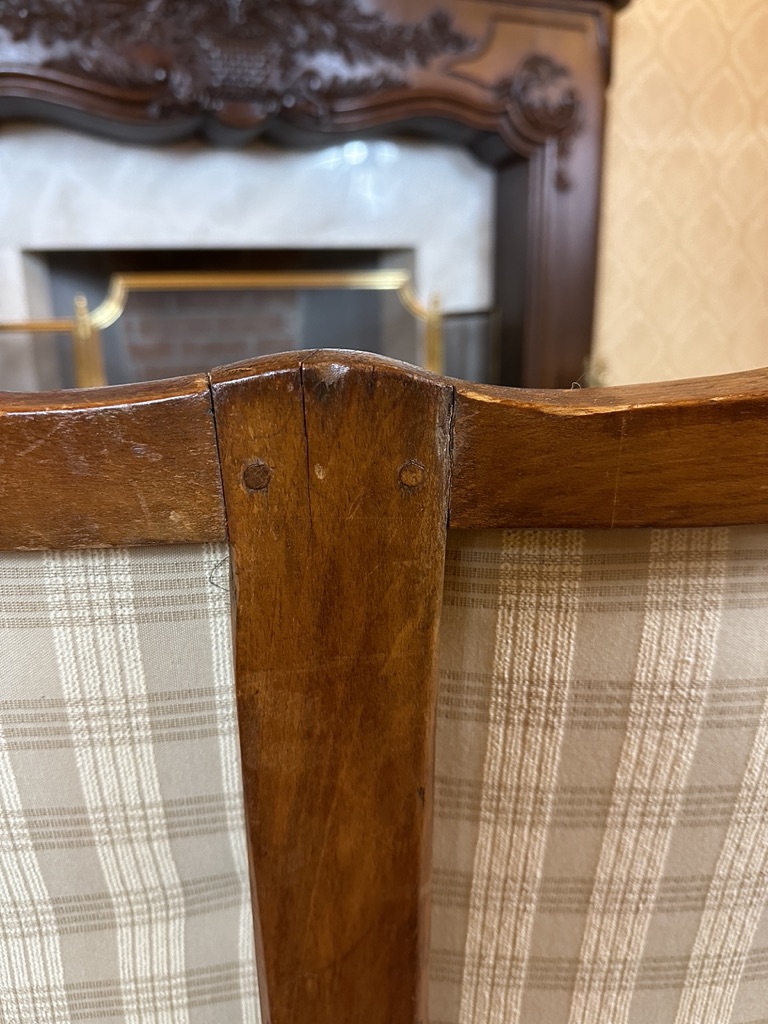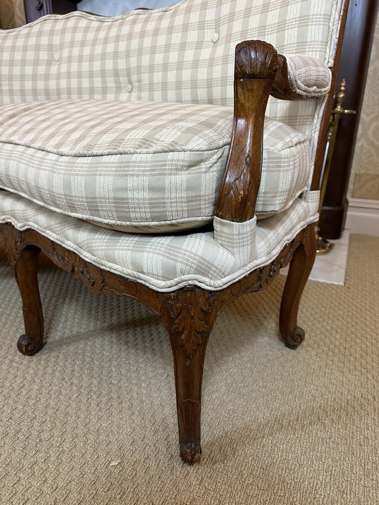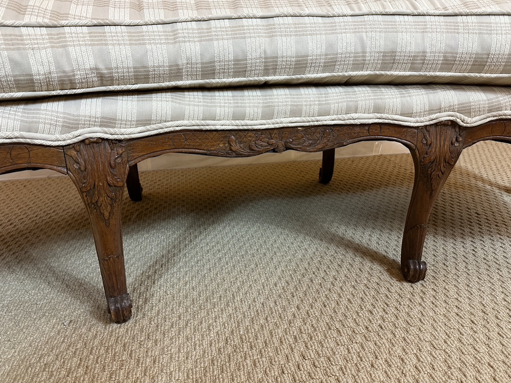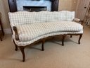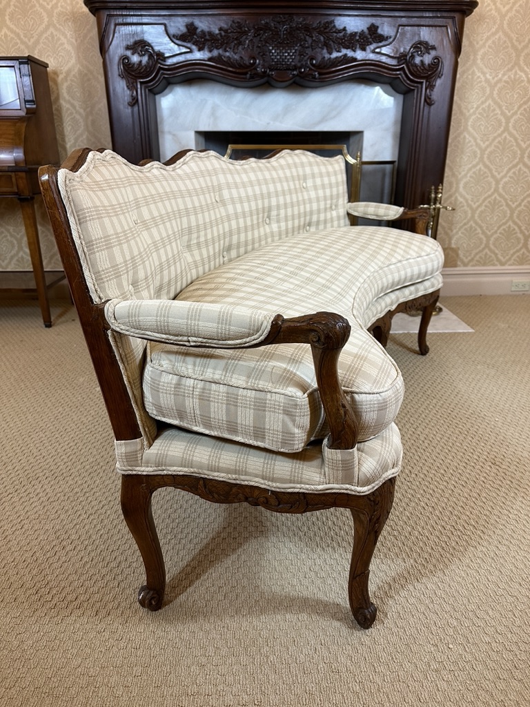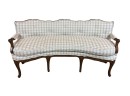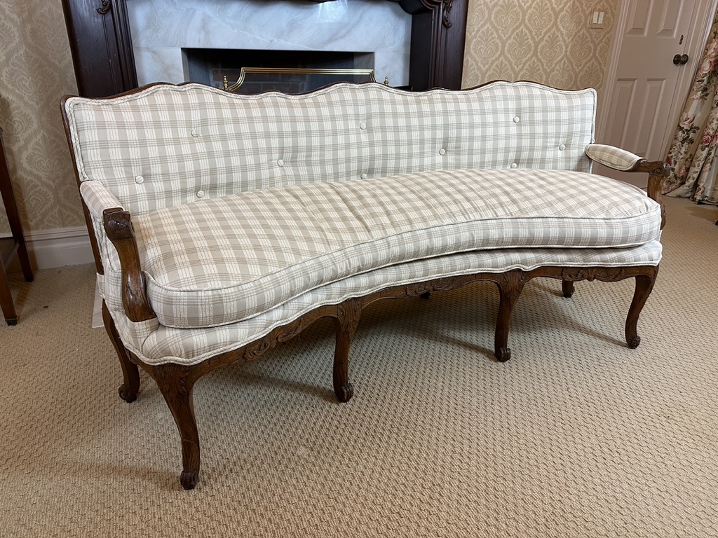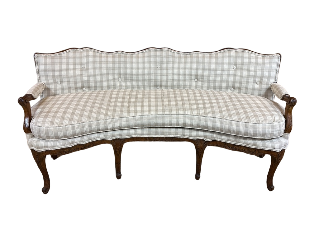 An elegant curved French Louis XV settee with beige gingham upholstery on a carved fruitwood base. Unusual design with a curved frame. 19th century.