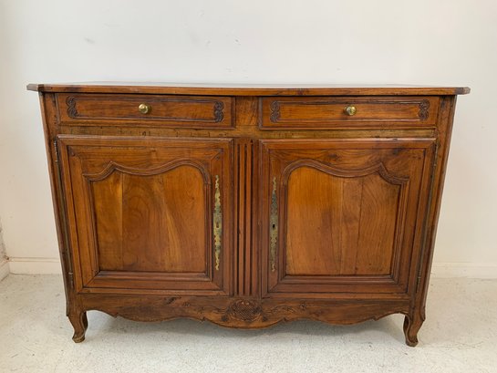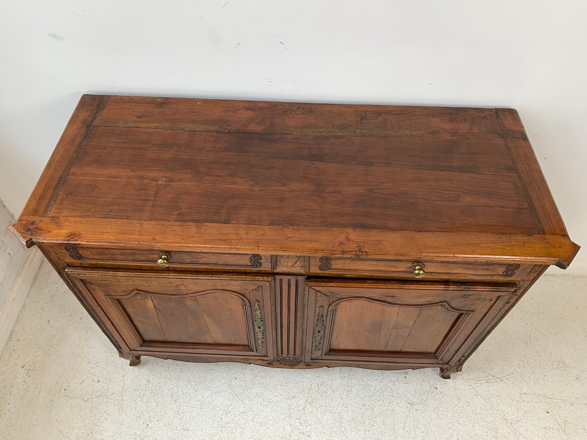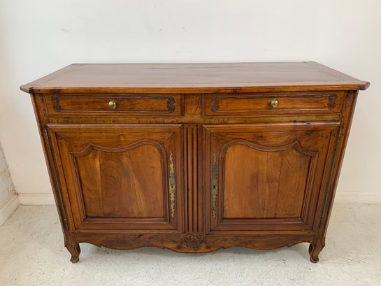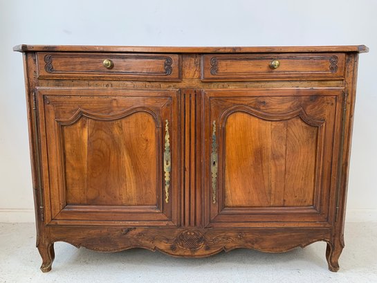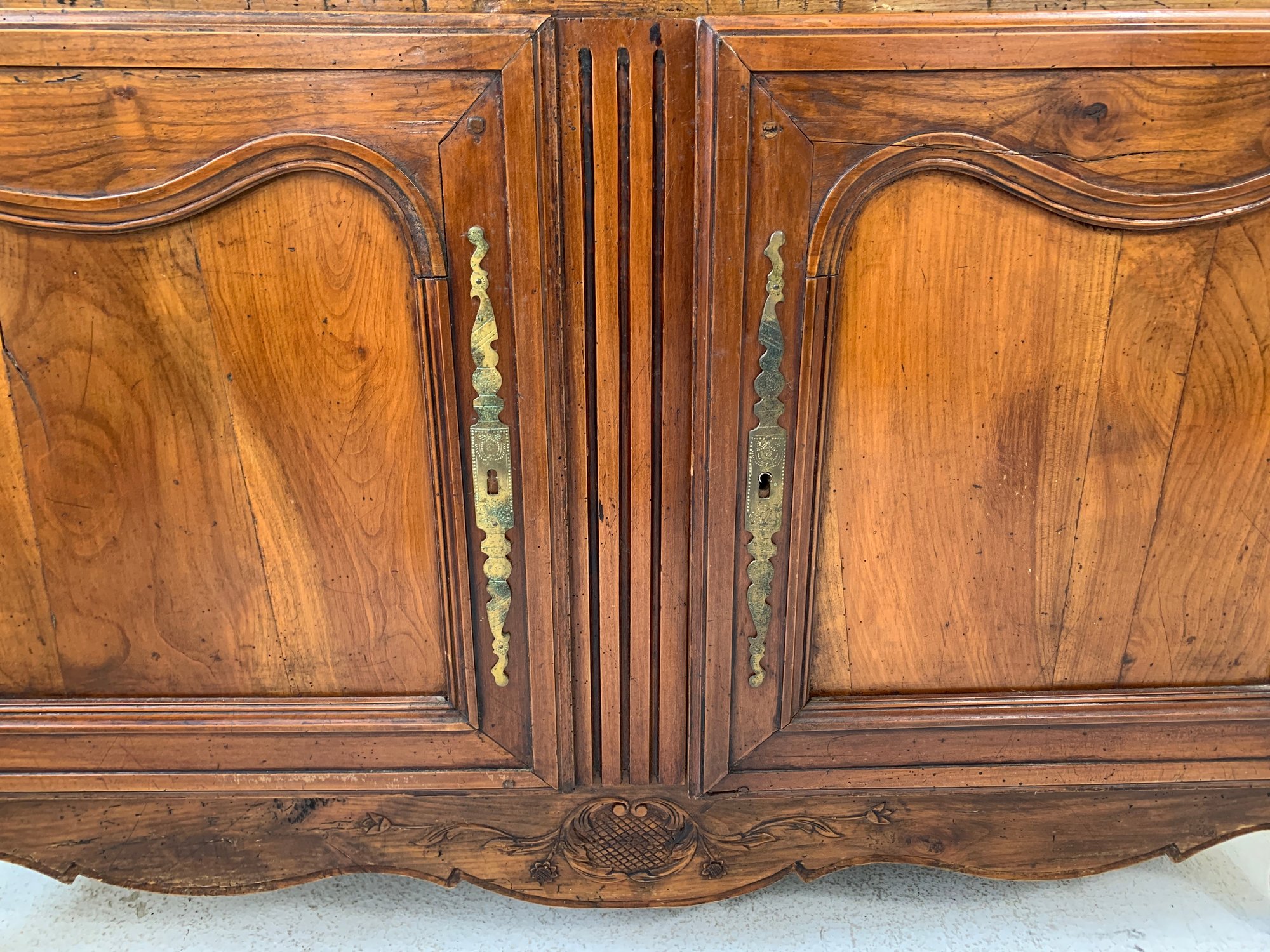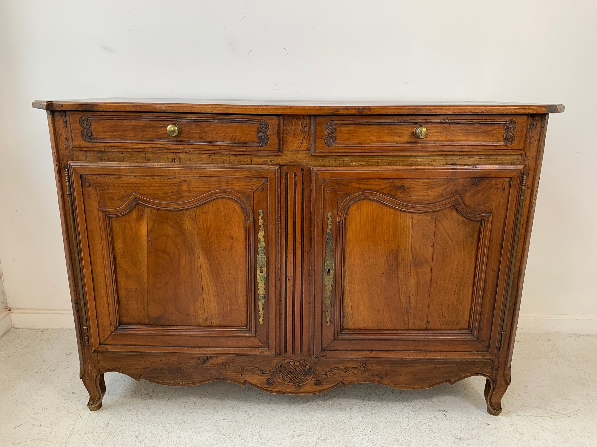 Antique French Provincial Louis XV style carved walnut buffet, late 18th to early 19th century. Features two drawers with brass knob pulls above two arched raised-panel doors separated by a fluted central stile. Original brass serpentine escutcheon plates with working keyholes. Carved floral basket and foliate motifs on the shaped apron, raised on cabriole legs with scrolled feet. Chamfered top corners. Interior opens to a single shelf. Unfinished plank back. A handsome and functional antique piece.