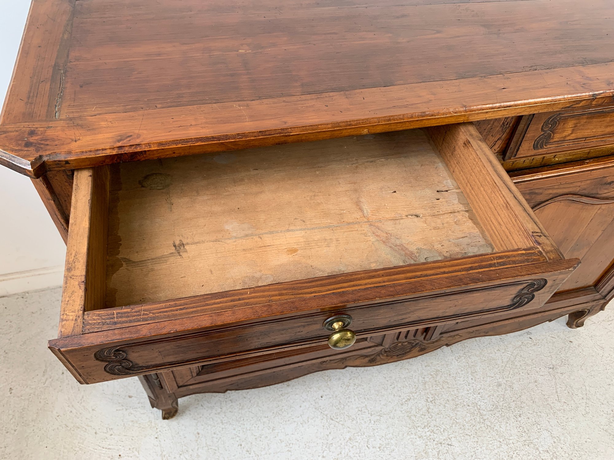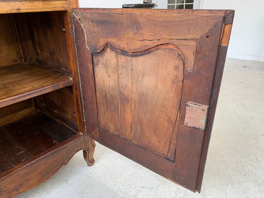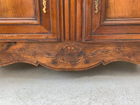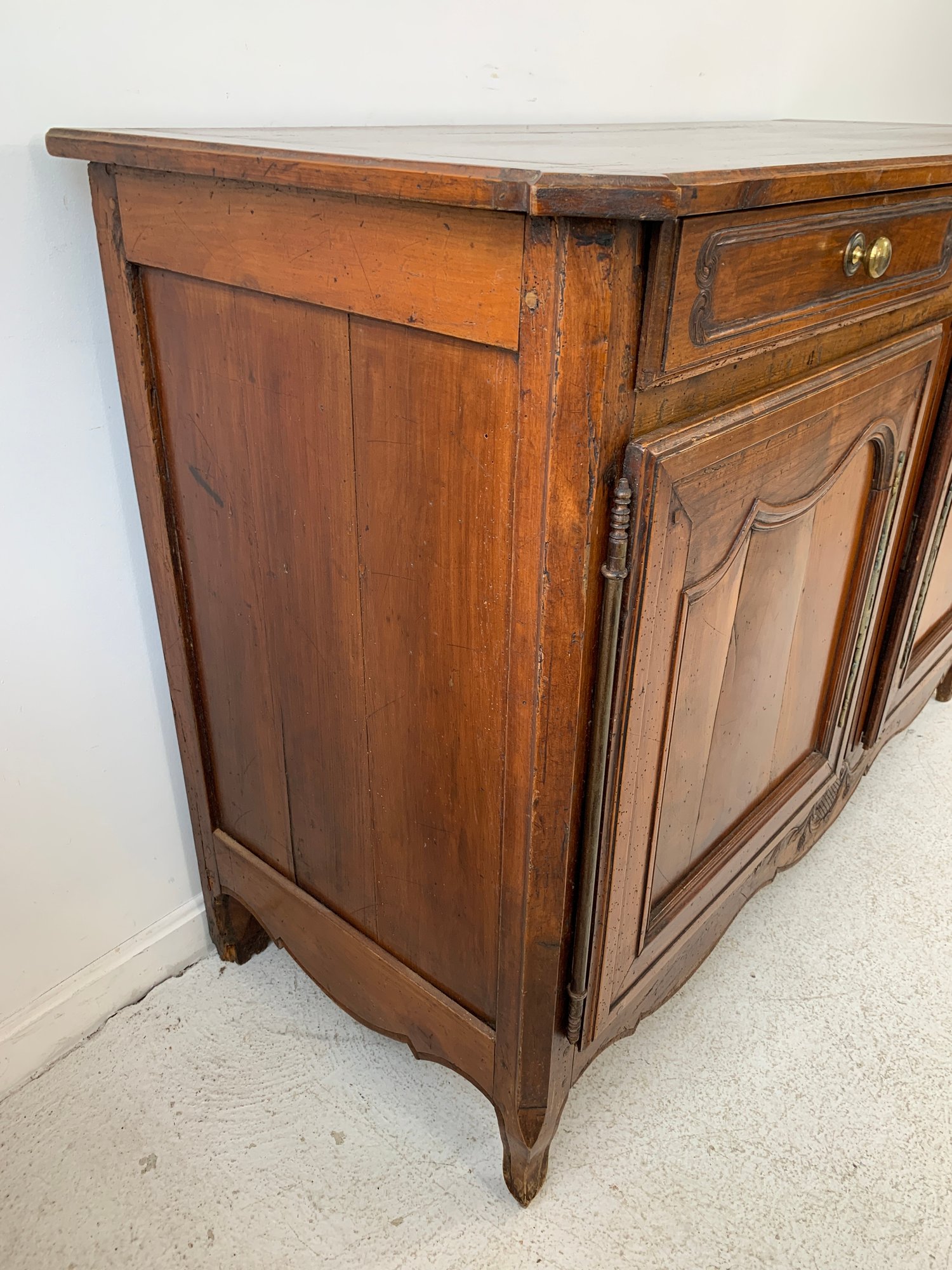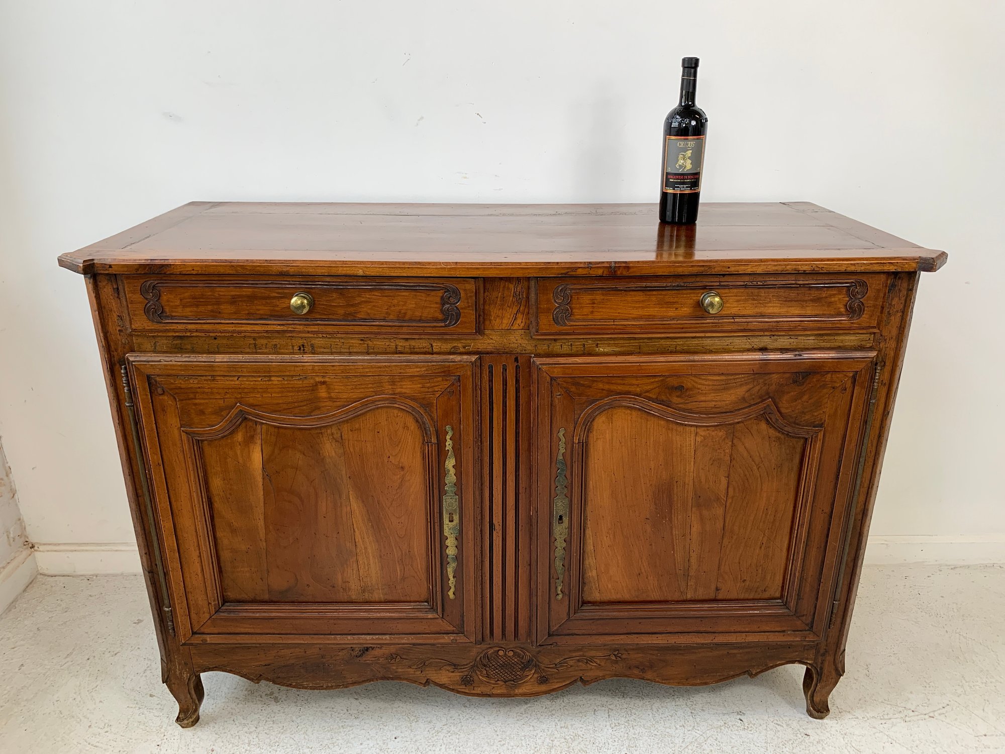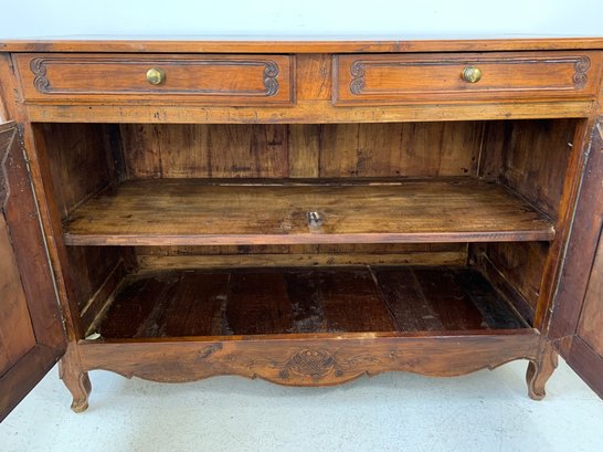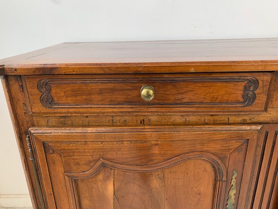 Antique French Provincial Louis XV style carved walnut buffet, late 18th to early 19th century. Features two drawers with brass knob pulls above two arched raised-panel doors separated by a fluted central stile. Original brass serpentine escutcheon plates with working keyholes. Carved floral basket and foliate motifs on the shaped apron, raised on cabriole legs with scrolled feet. Chamfered top corners. Interior opens to a single shelf. Unfinished plank back. A handsome and functional antique piece.