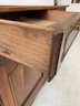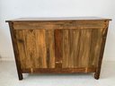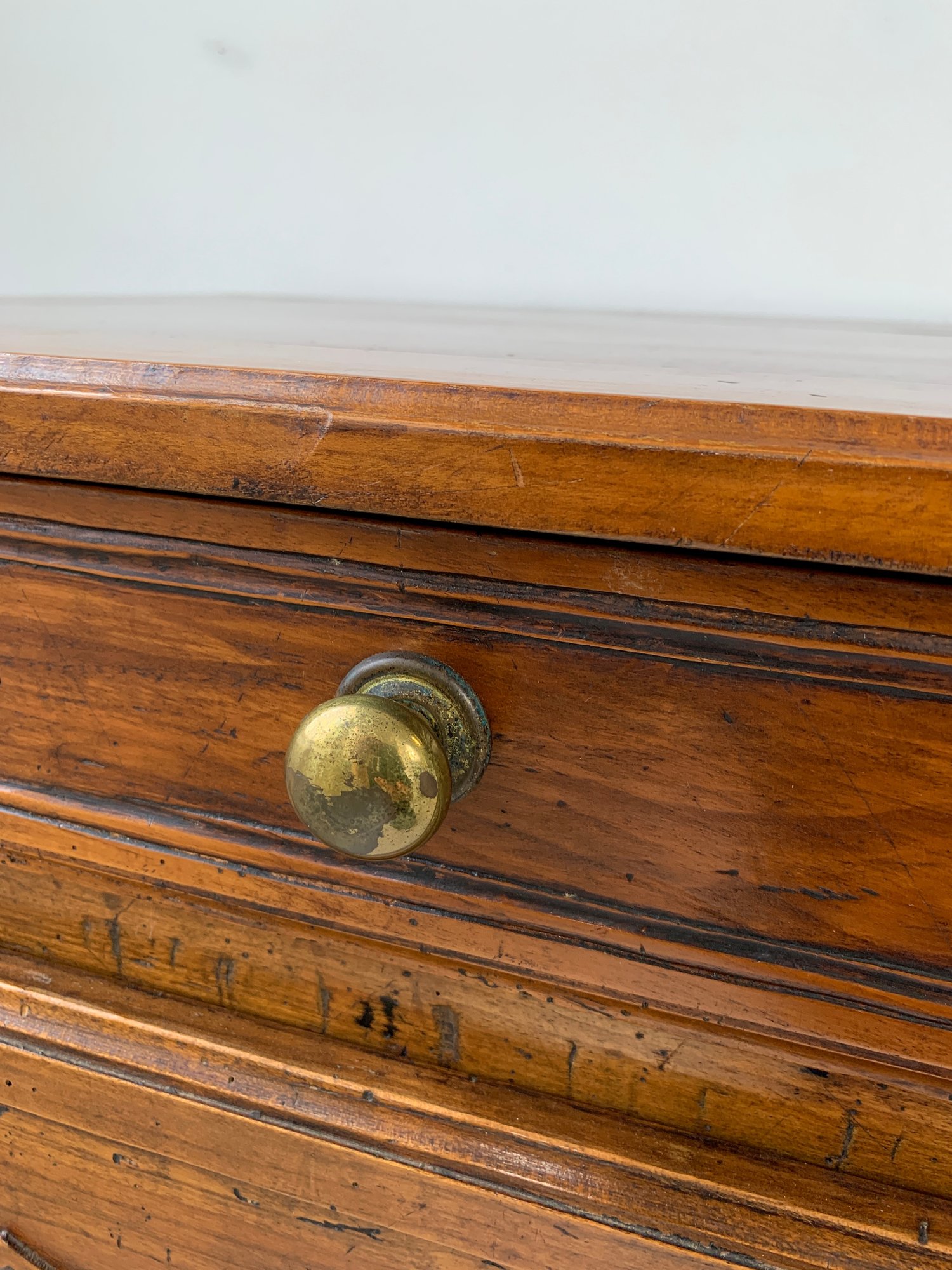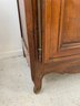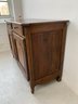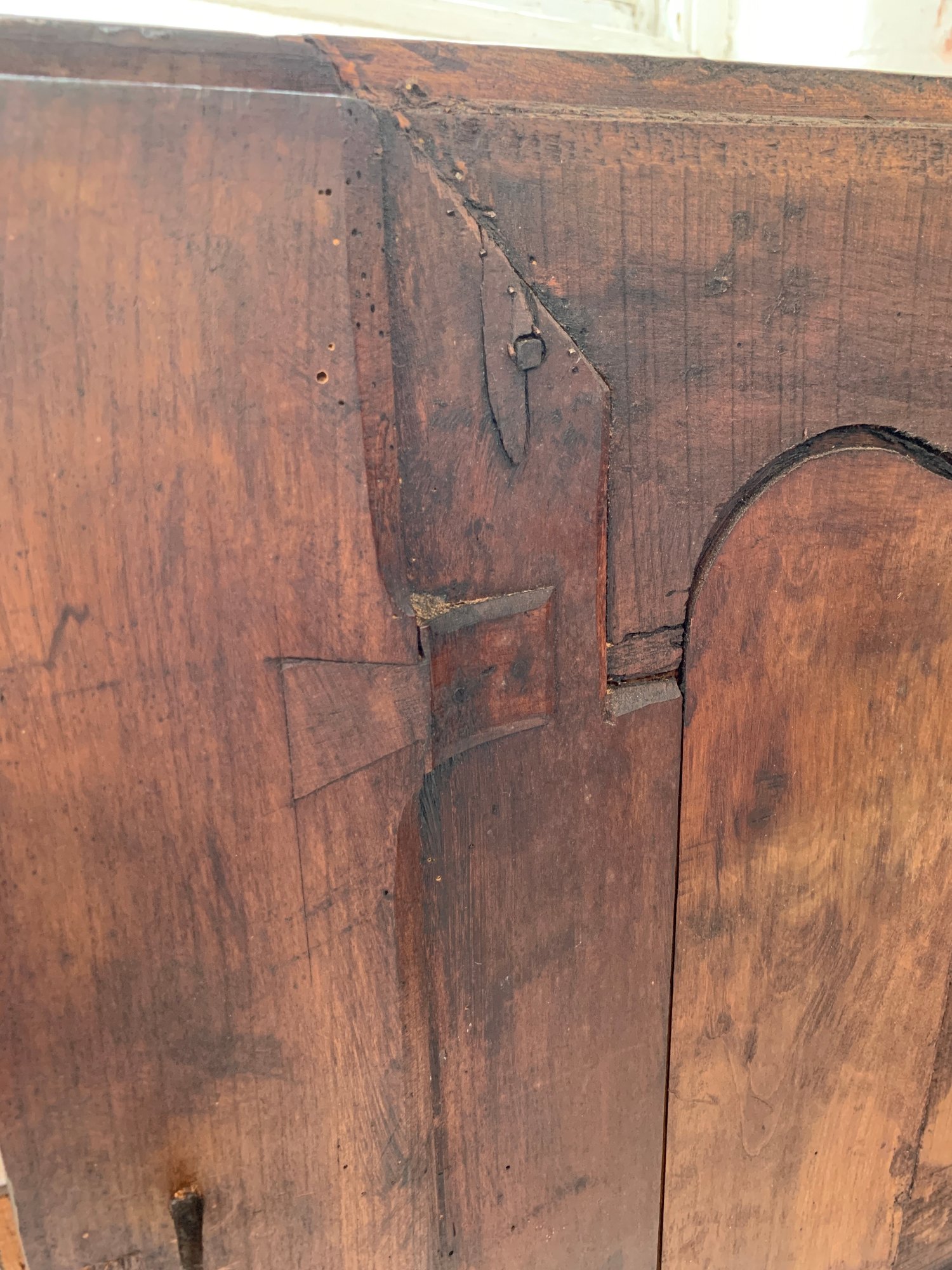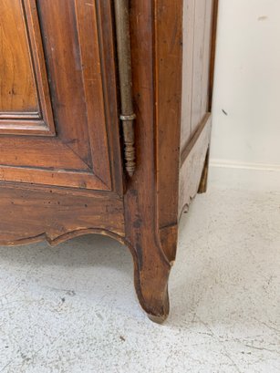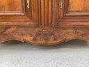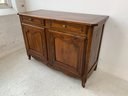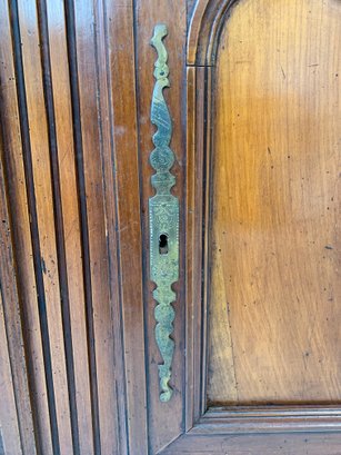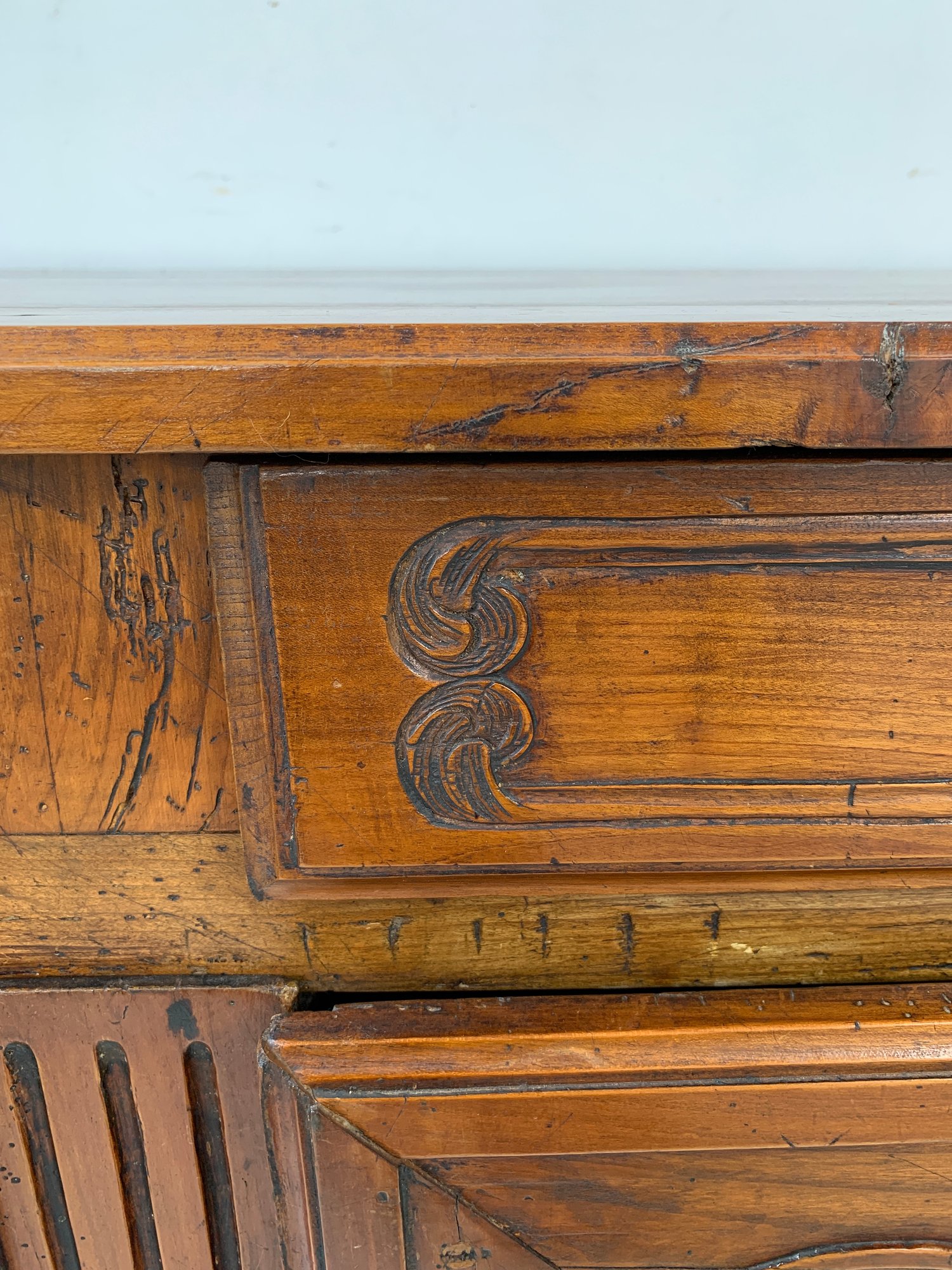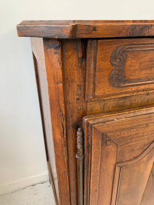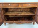Antique French Provincial Louis XV style carved walnut buffet, late 18th to early 19th century. Features two drawers with brass knob pulls above two arched raised-panel doors separated by a fluted central stile. Original brass serpentine escutcheon plates with working keyholes. Carved floral basket and foliate motifs on the shaped apron, raised on cabriole legs with scrolled feet. Chamfered top corners. Interior opens to a single shelf. Unfinished plank back. A handsome and functional antique piece.
