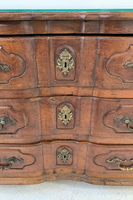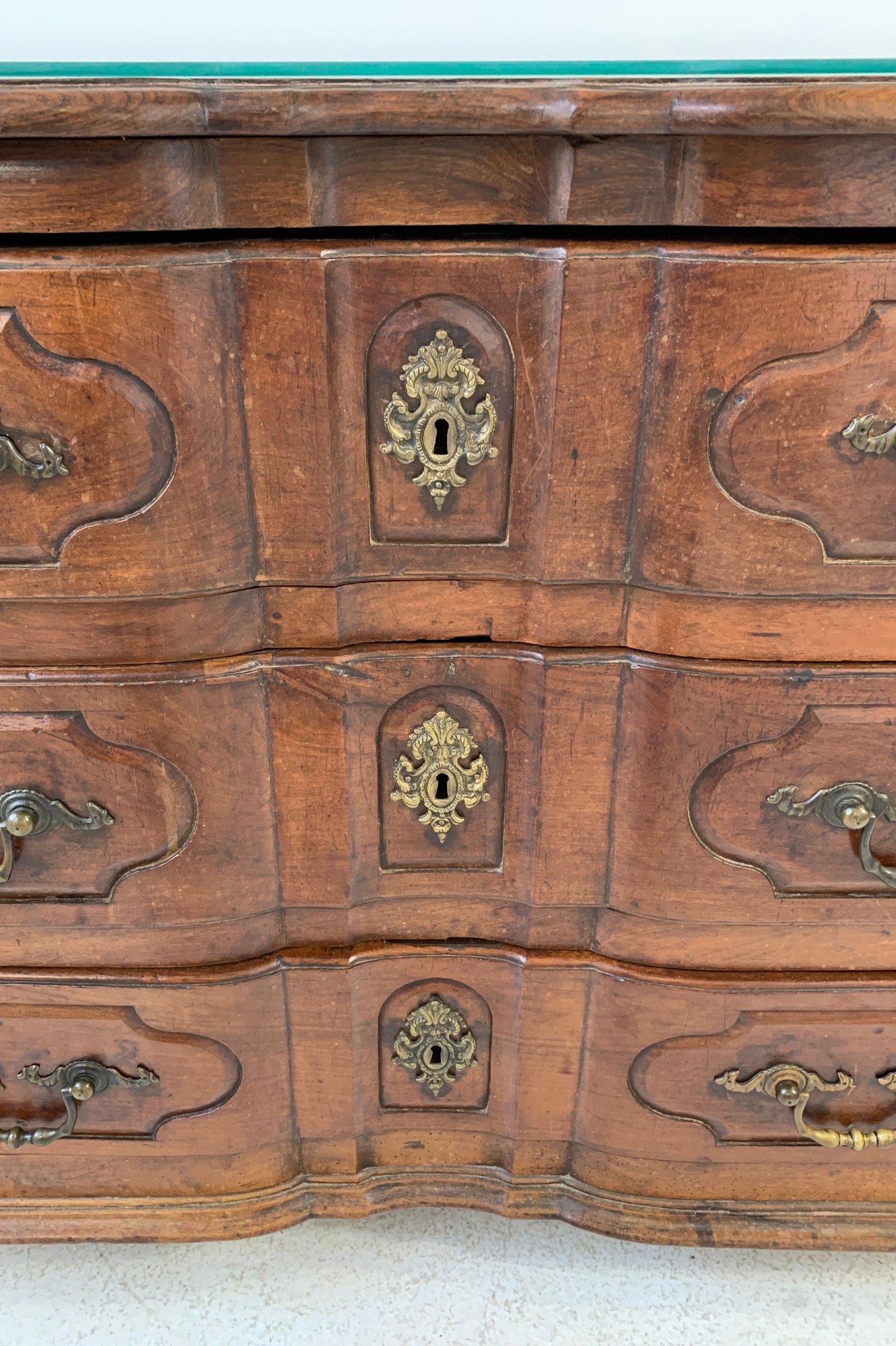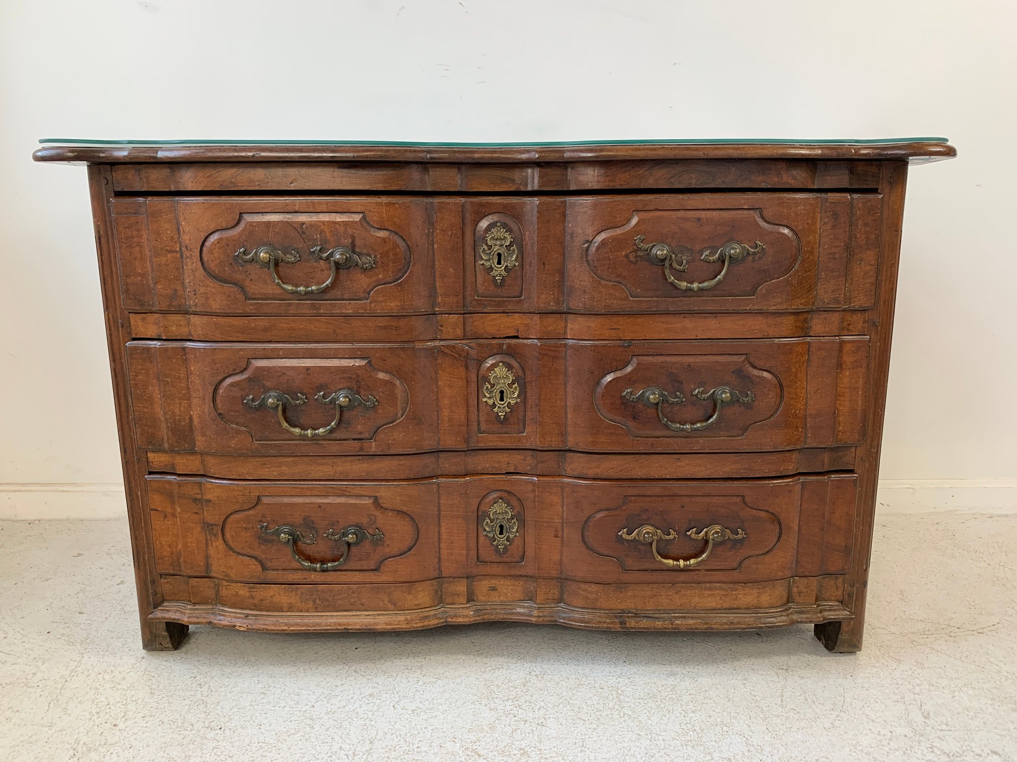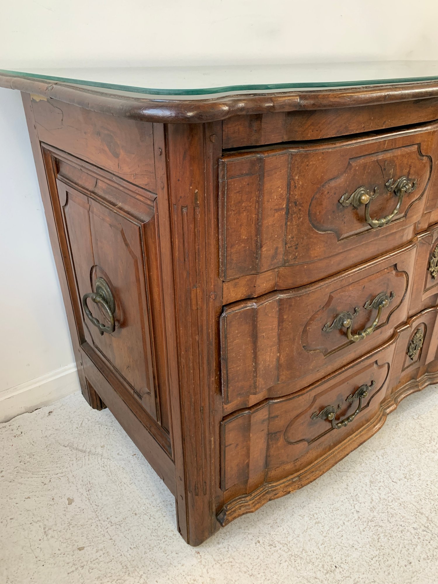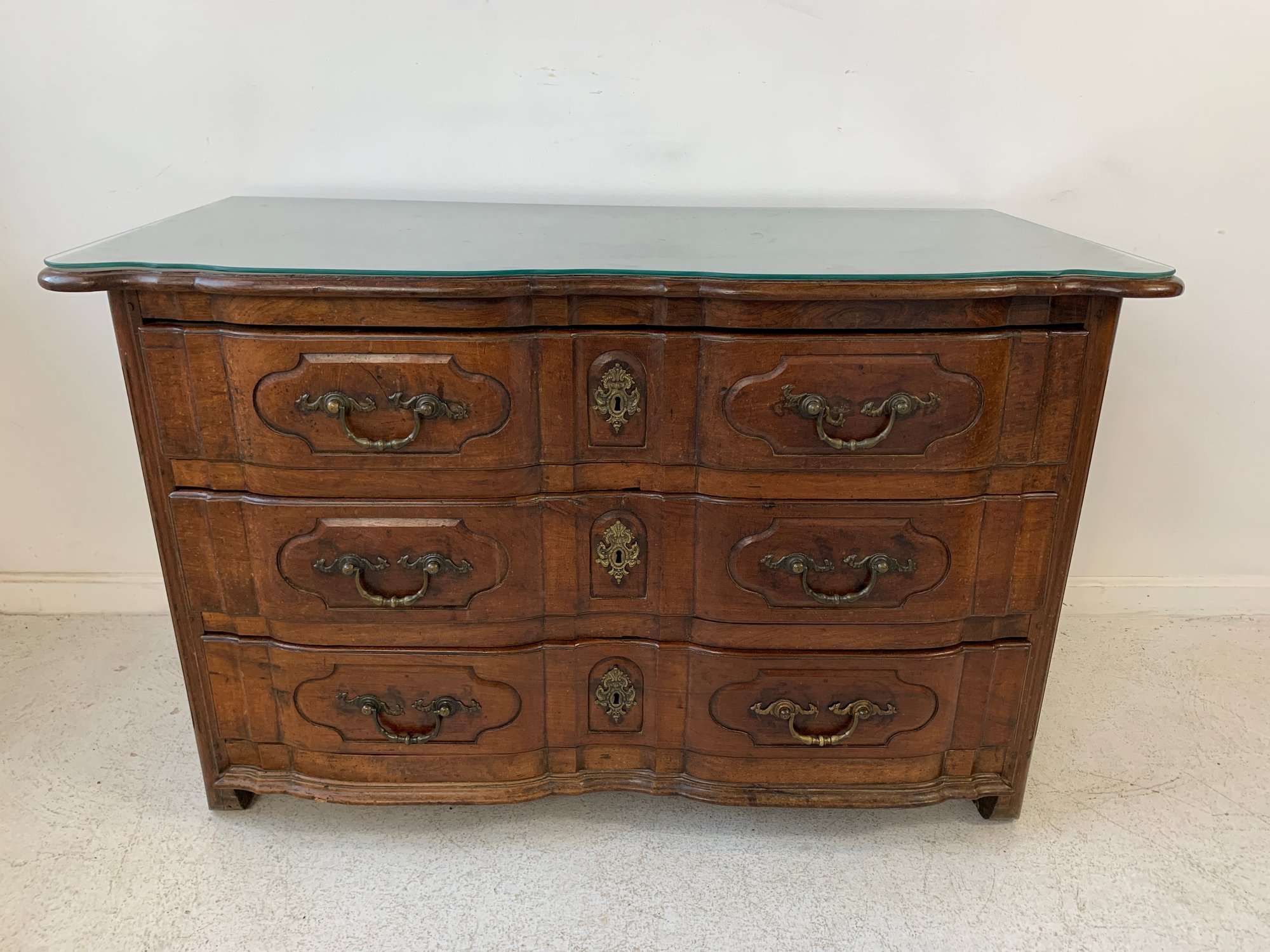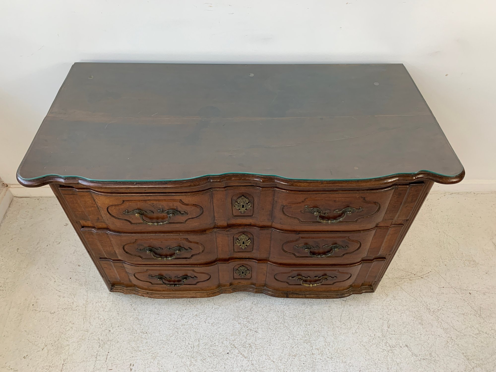 Antique French Provincial carved walnut three-drawer commode, late 18th to early 19th century. Serpentine front with shaped raised panel drawers, original cast brass drop bail handles, and ornate arched brass escutcheon plates. Fluted corners and shaped apron on block feet. Paneled sides each fitted with a ring pull. Shaped molded top with later fitted glass protector. Paneled back.