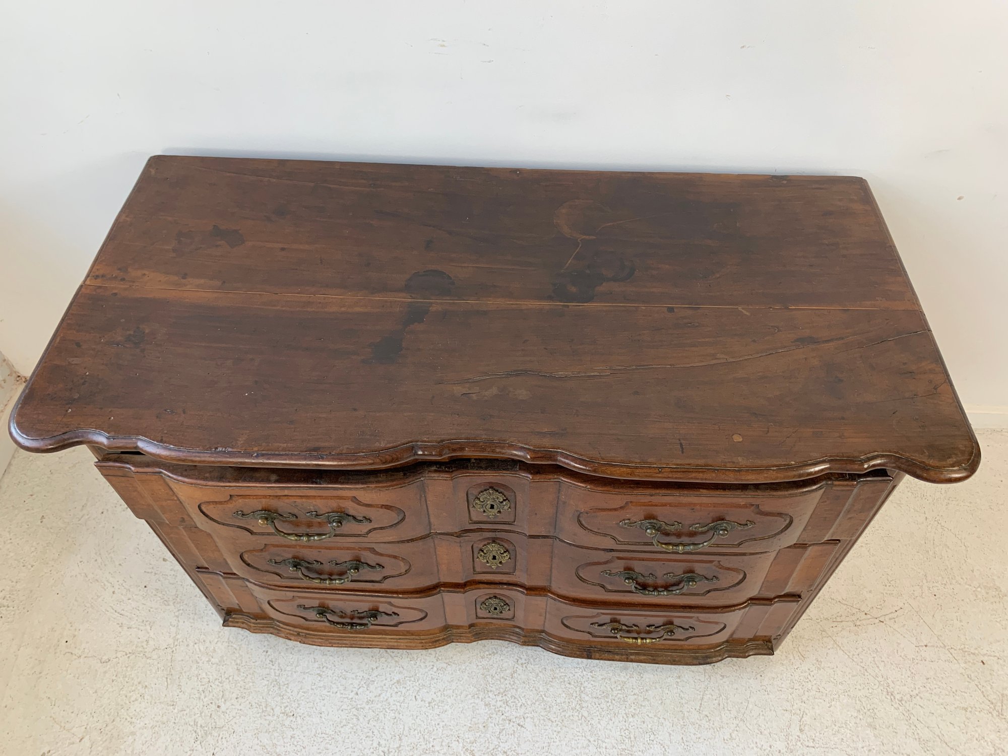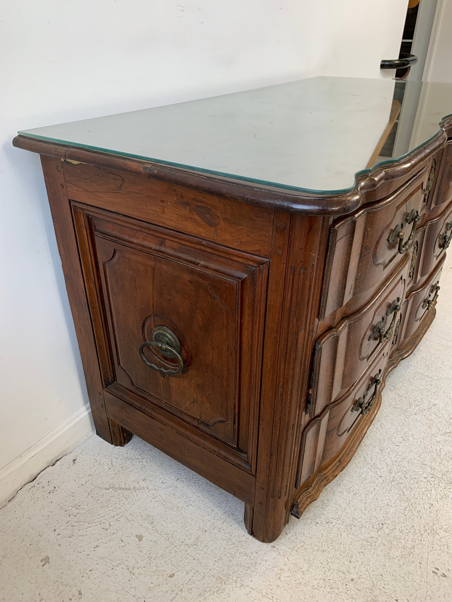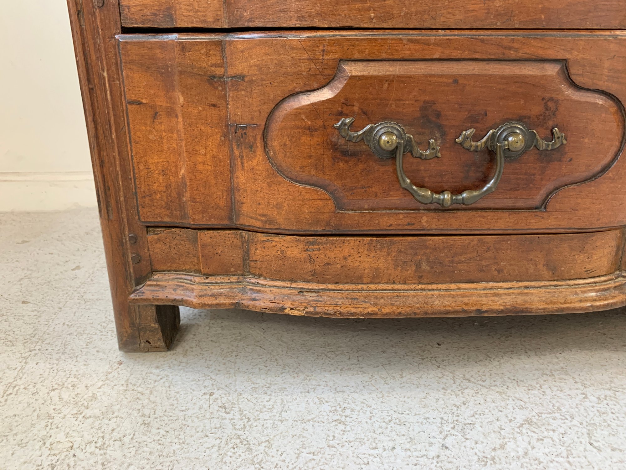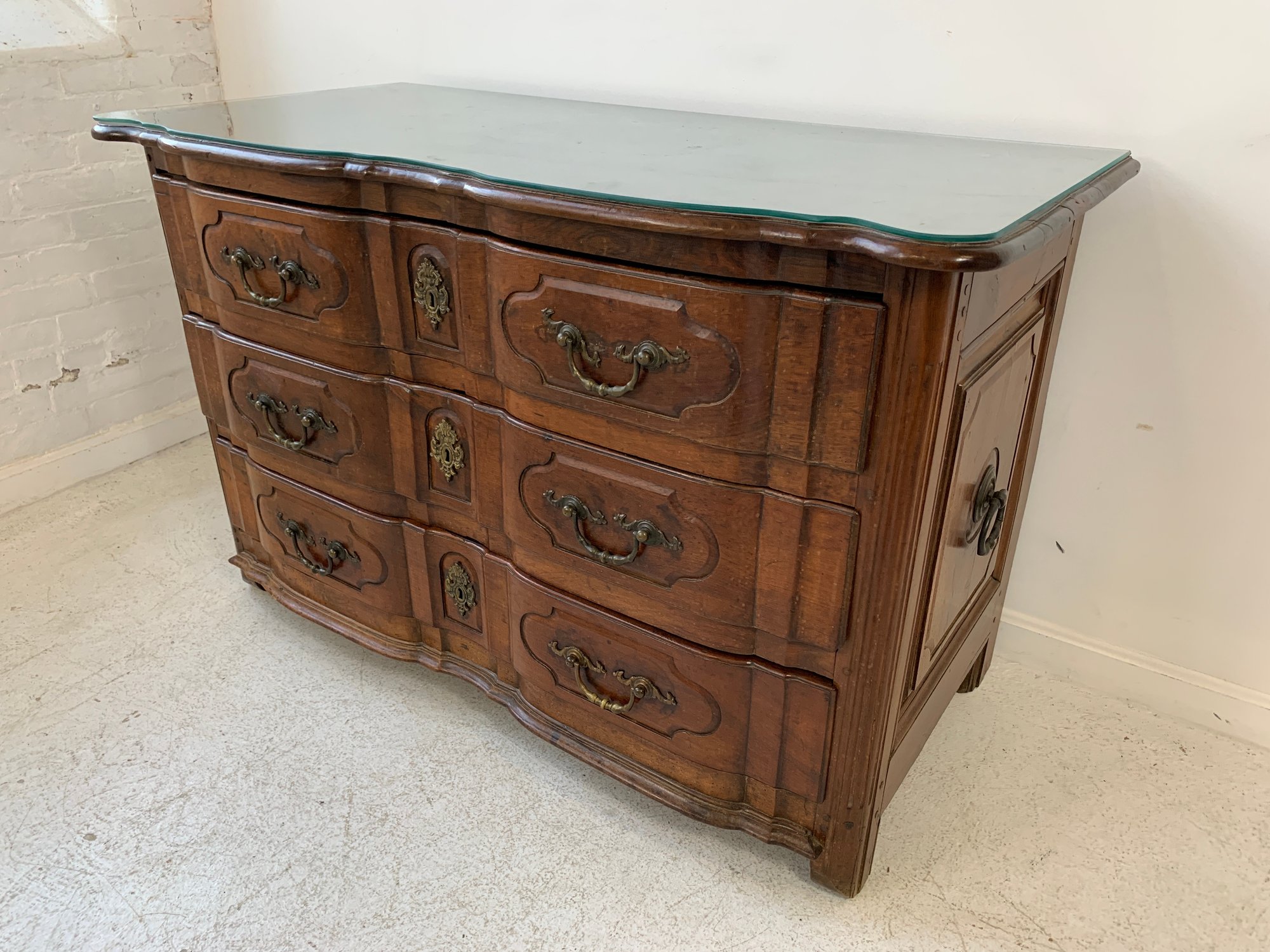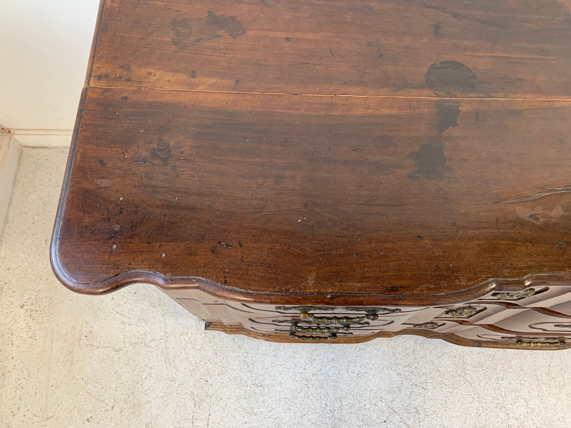 Antique French Provincial carved walnut three-drawer commode, late 18th to early 19th century. Serpentine front with shaped raised panel drawers, original cast brass drop bail handles, and ornate arched brass escutcheon plates. Fluted corners and shaped apron on block feet. Paneled sides each fitted with a ring pull. Shaped molded top with later fitted glass protector. Paneled back.