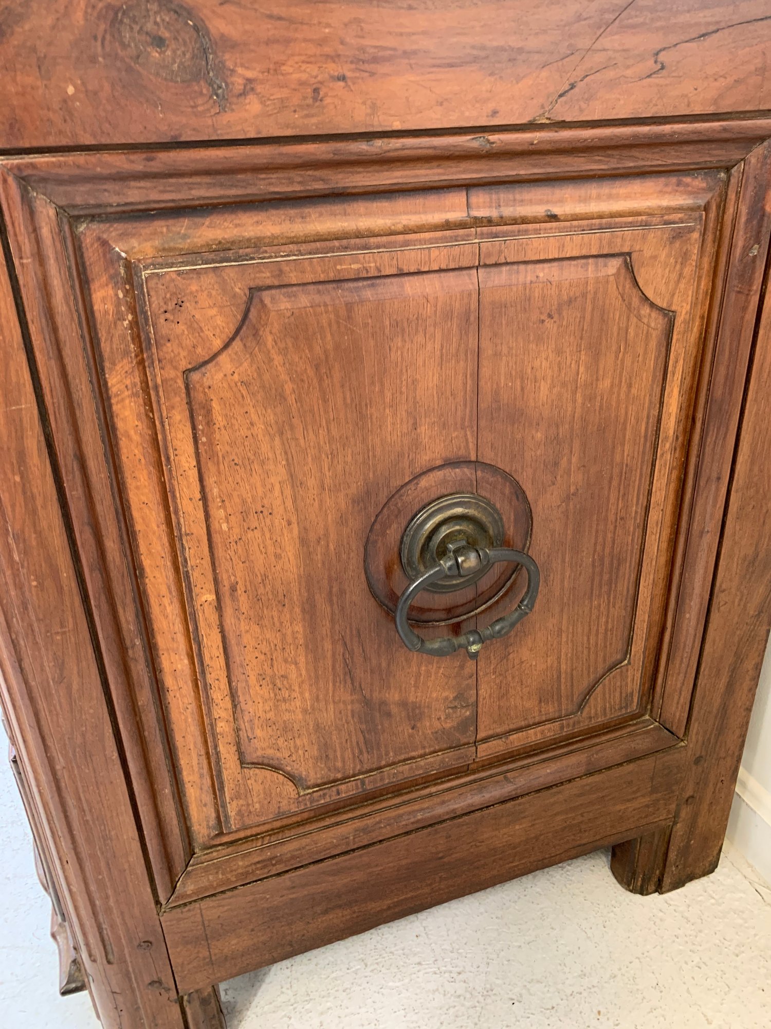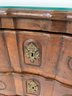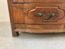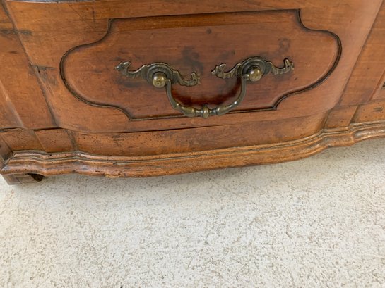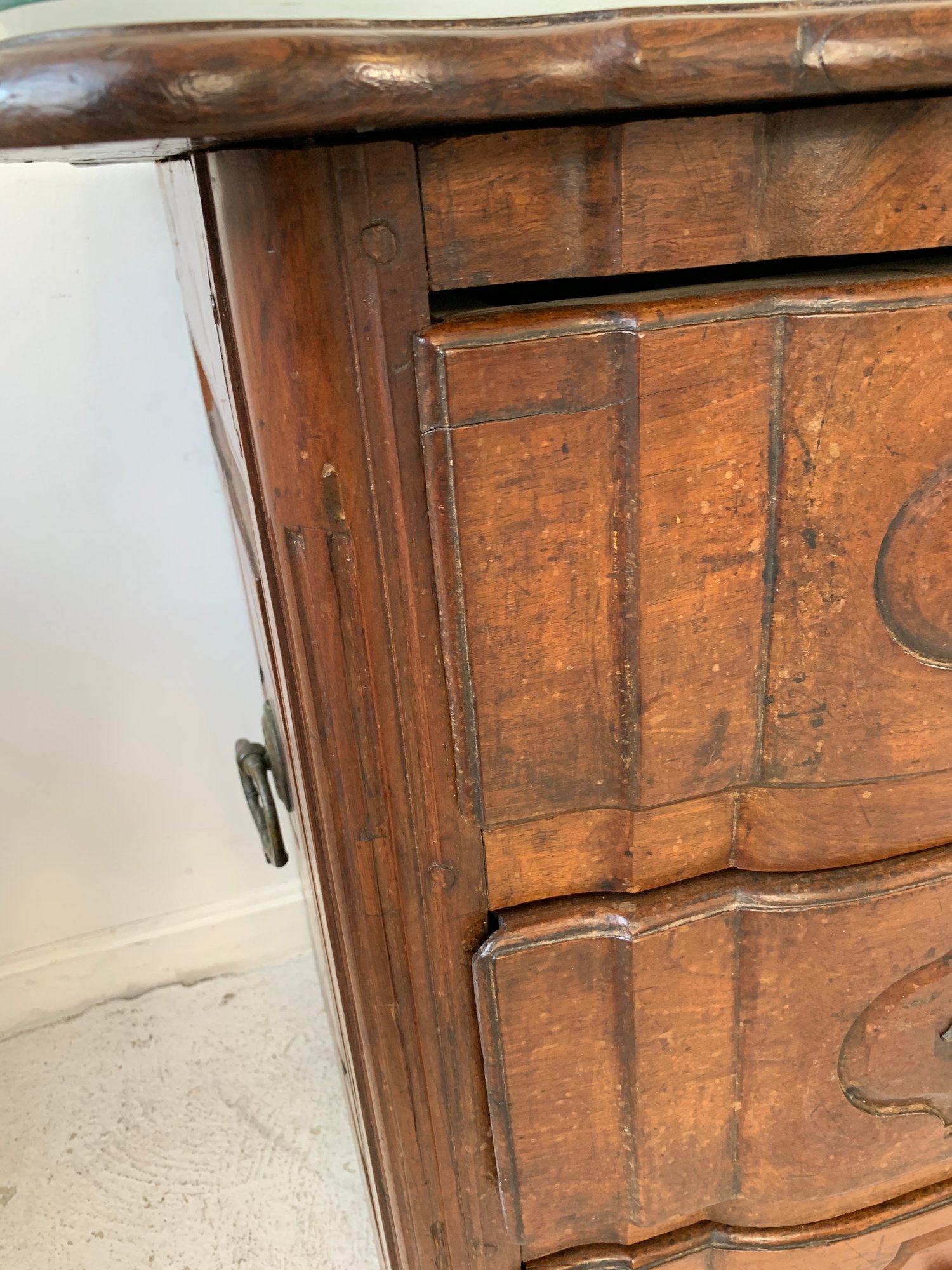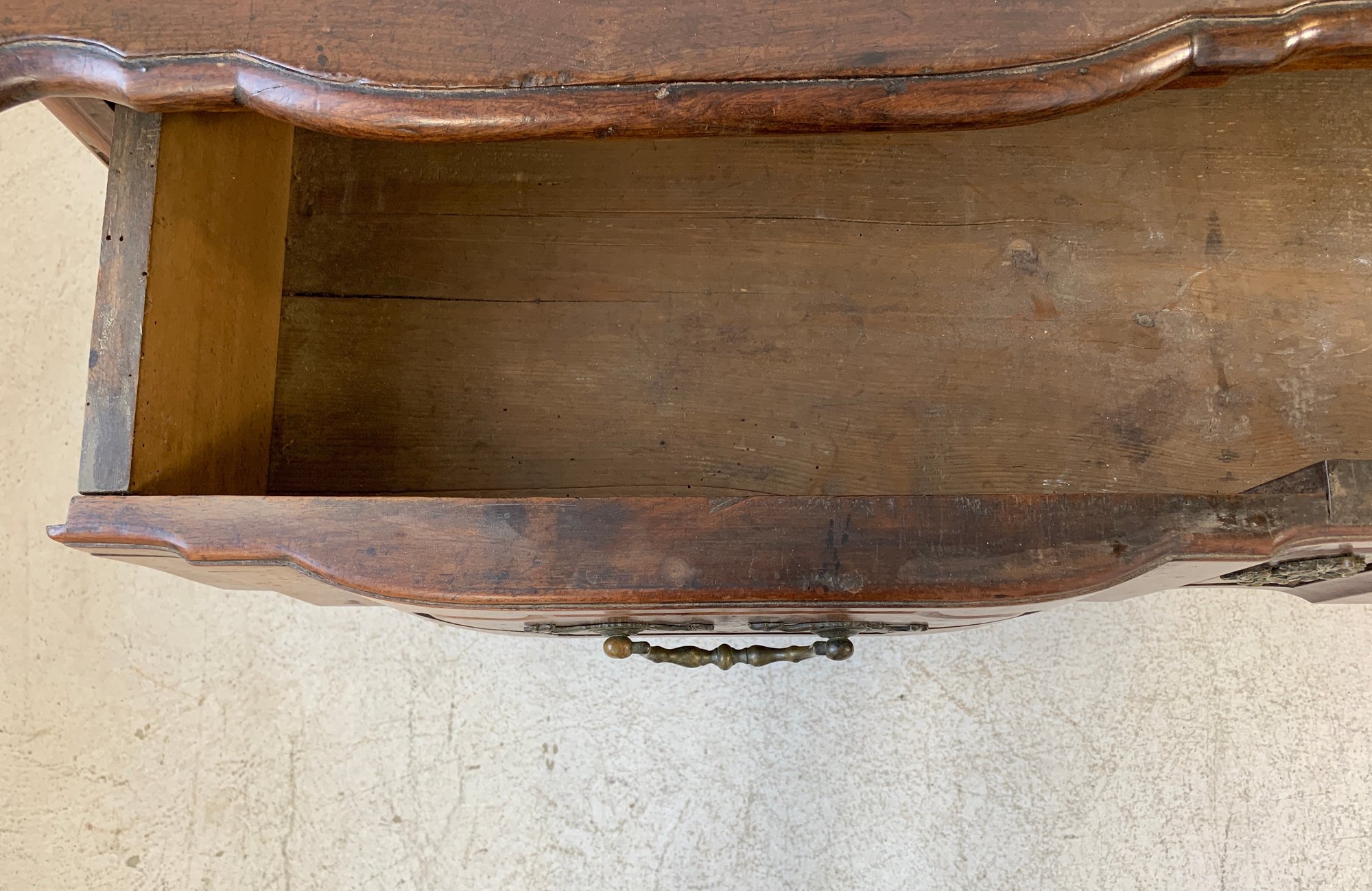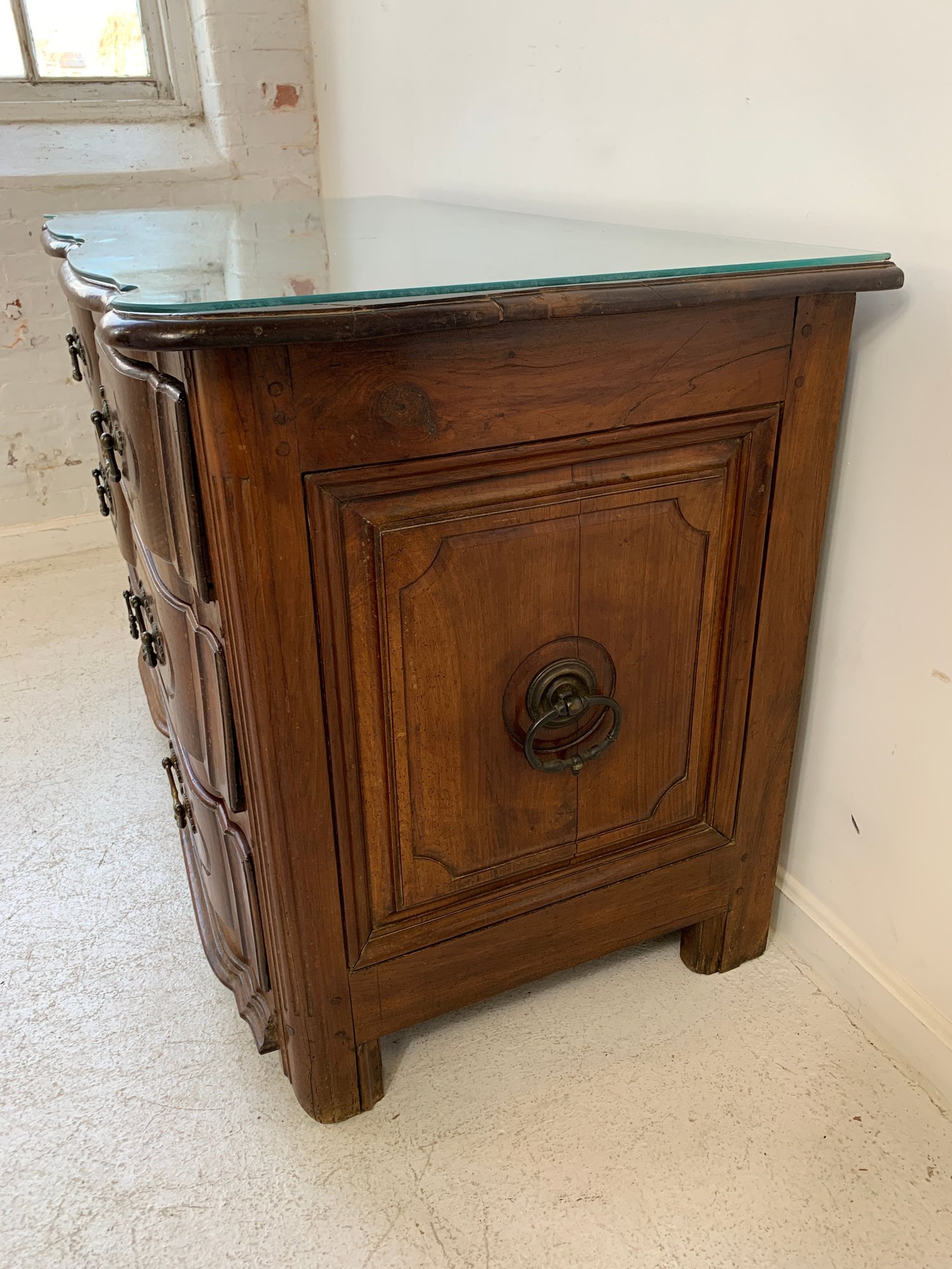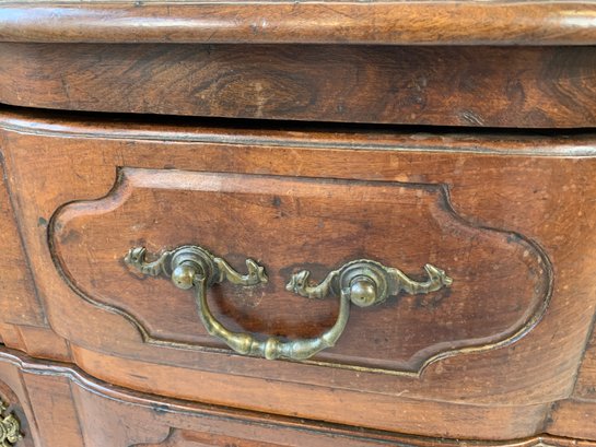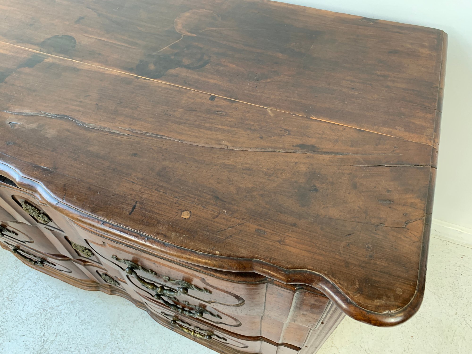 Antique French Provincial carved walnut three-drawer commode, late 18th to early 19th century. Serpentine front with shaped raised panel drawers, original cast brass drop bail handles, and ornate arched brass escutcheon plates. Fluted corners and shaped apron on block feet. Paneled sides each fitted with a ring pull. Shaped molded top with later fitted glass protector. Paneled back.