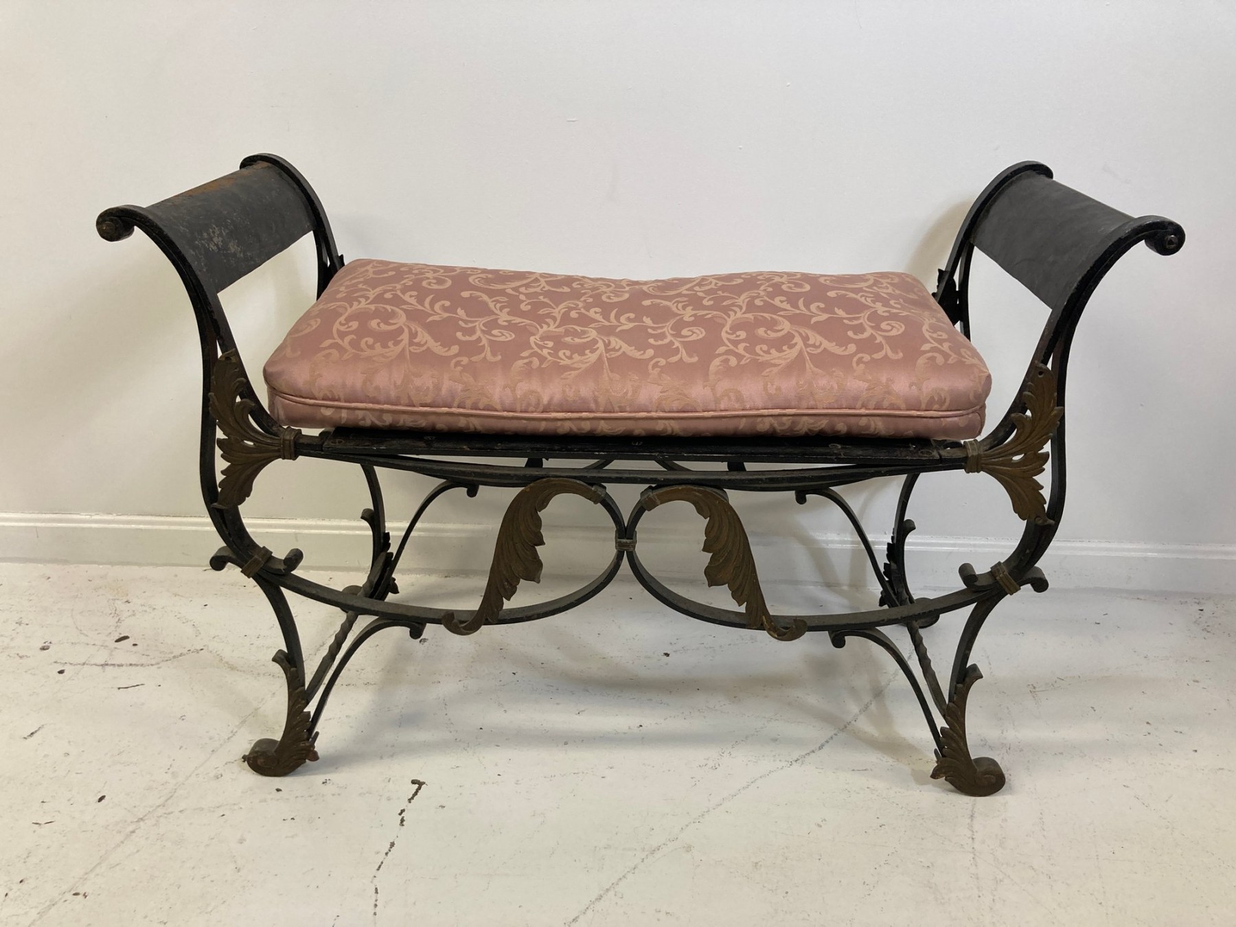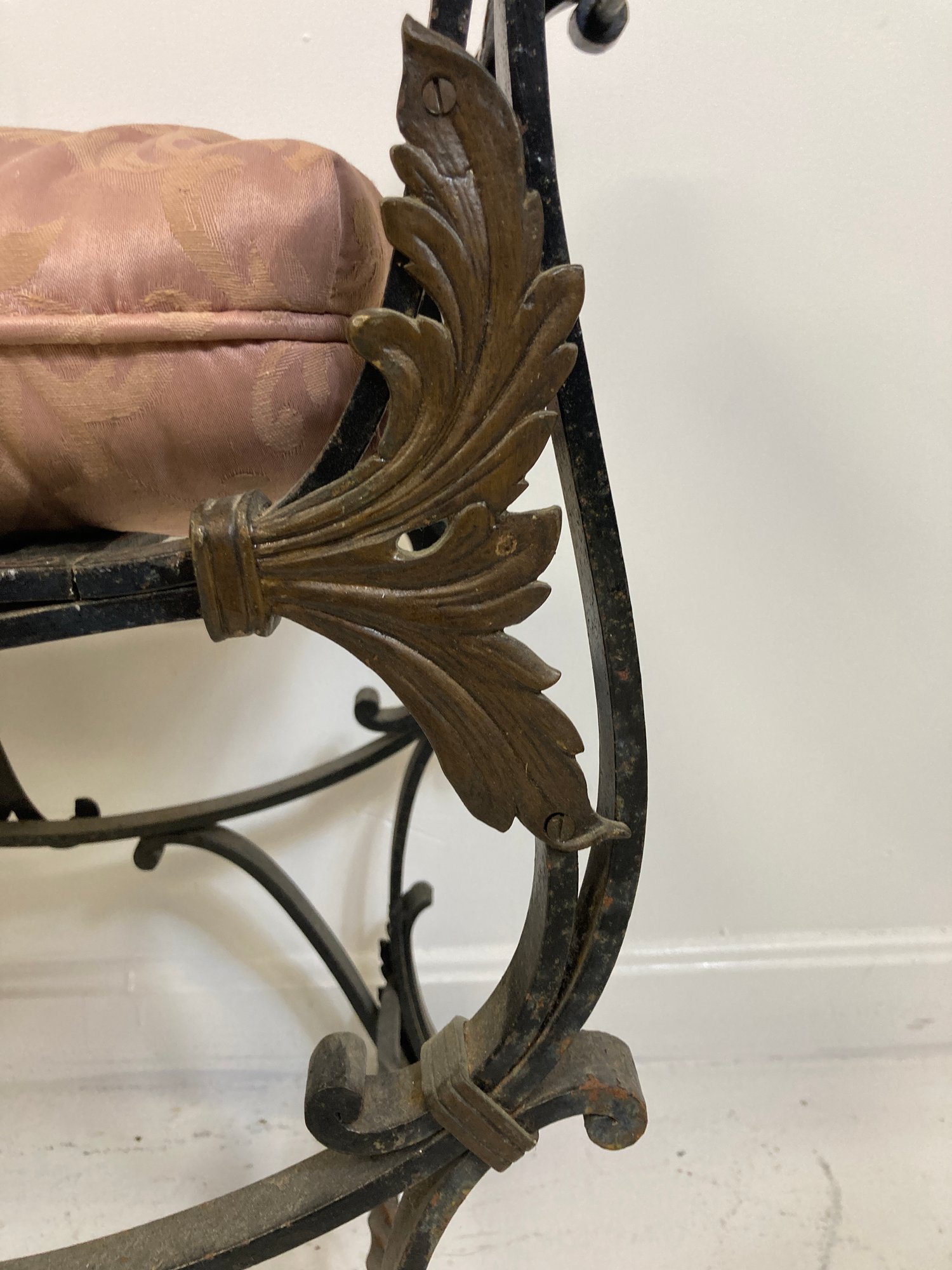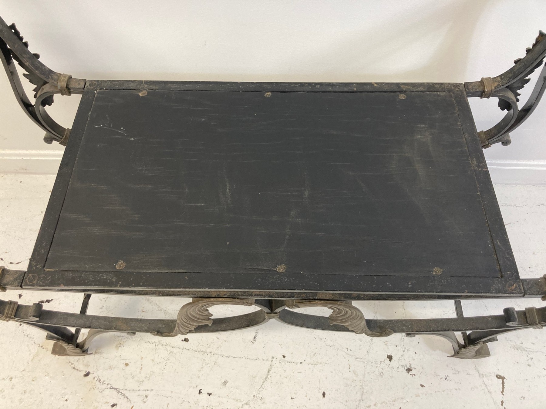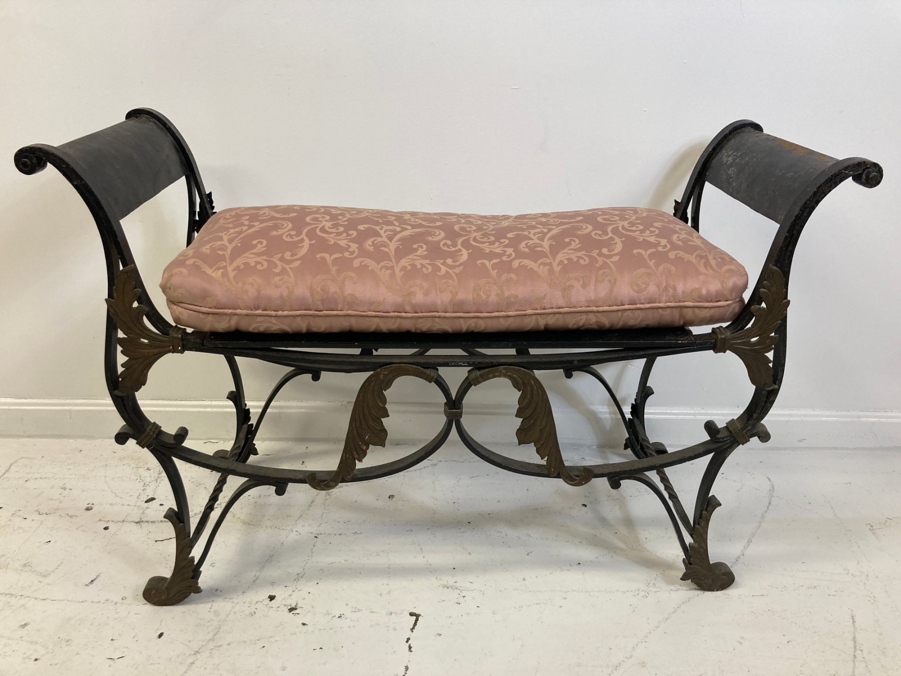 Selling a antique French wrought iron bench with brass accents. Circa late 19th-early 20th century.