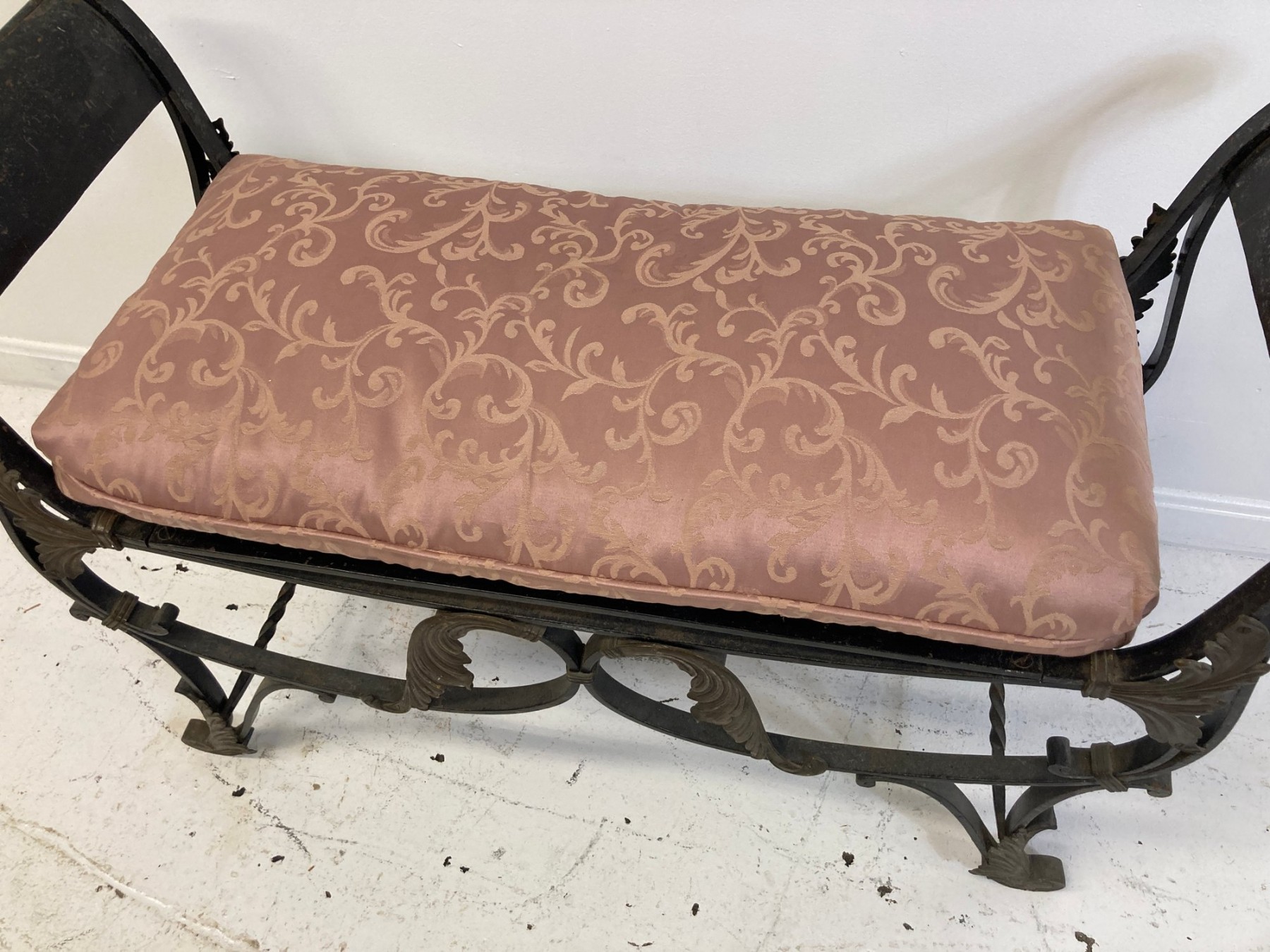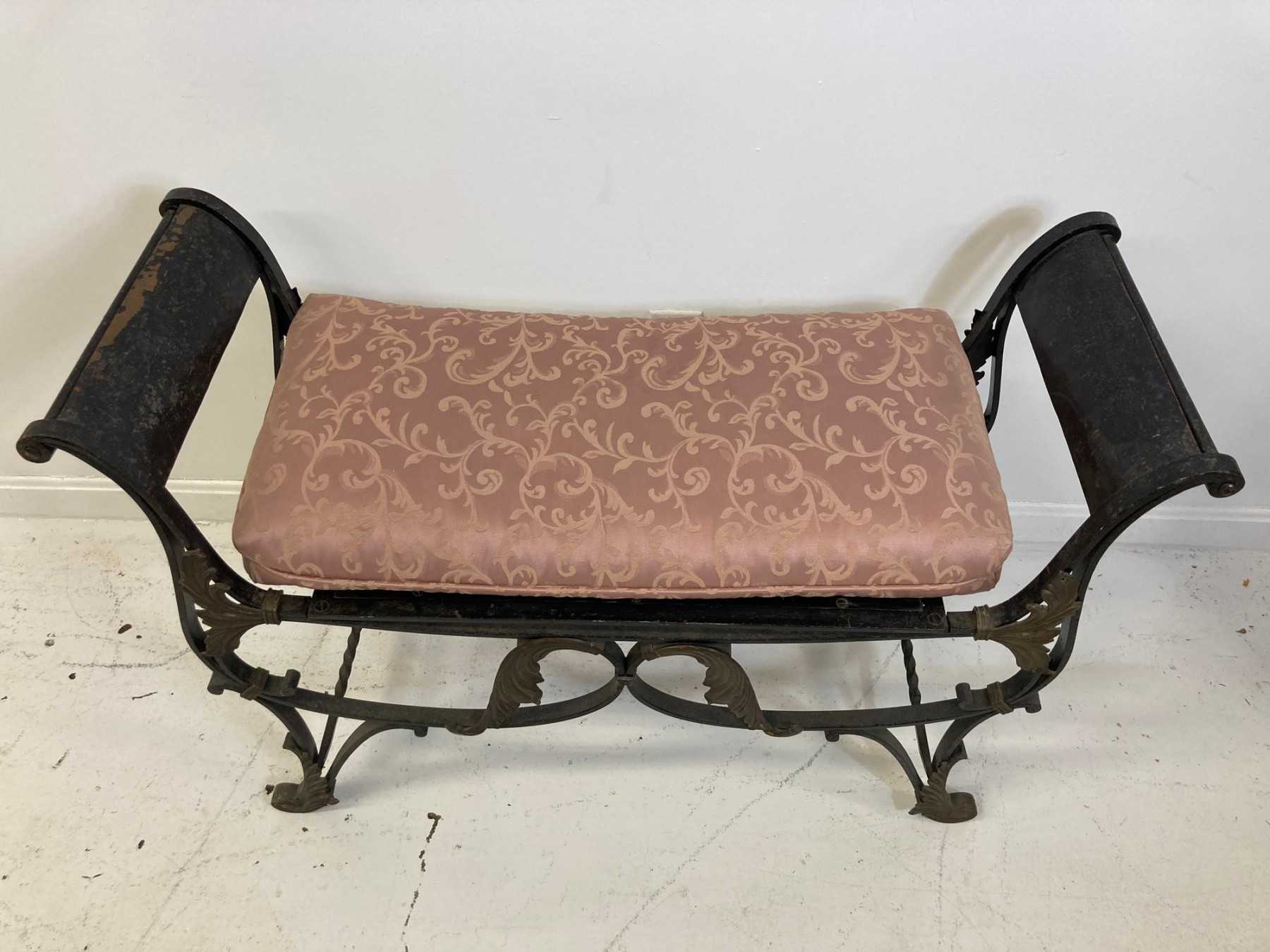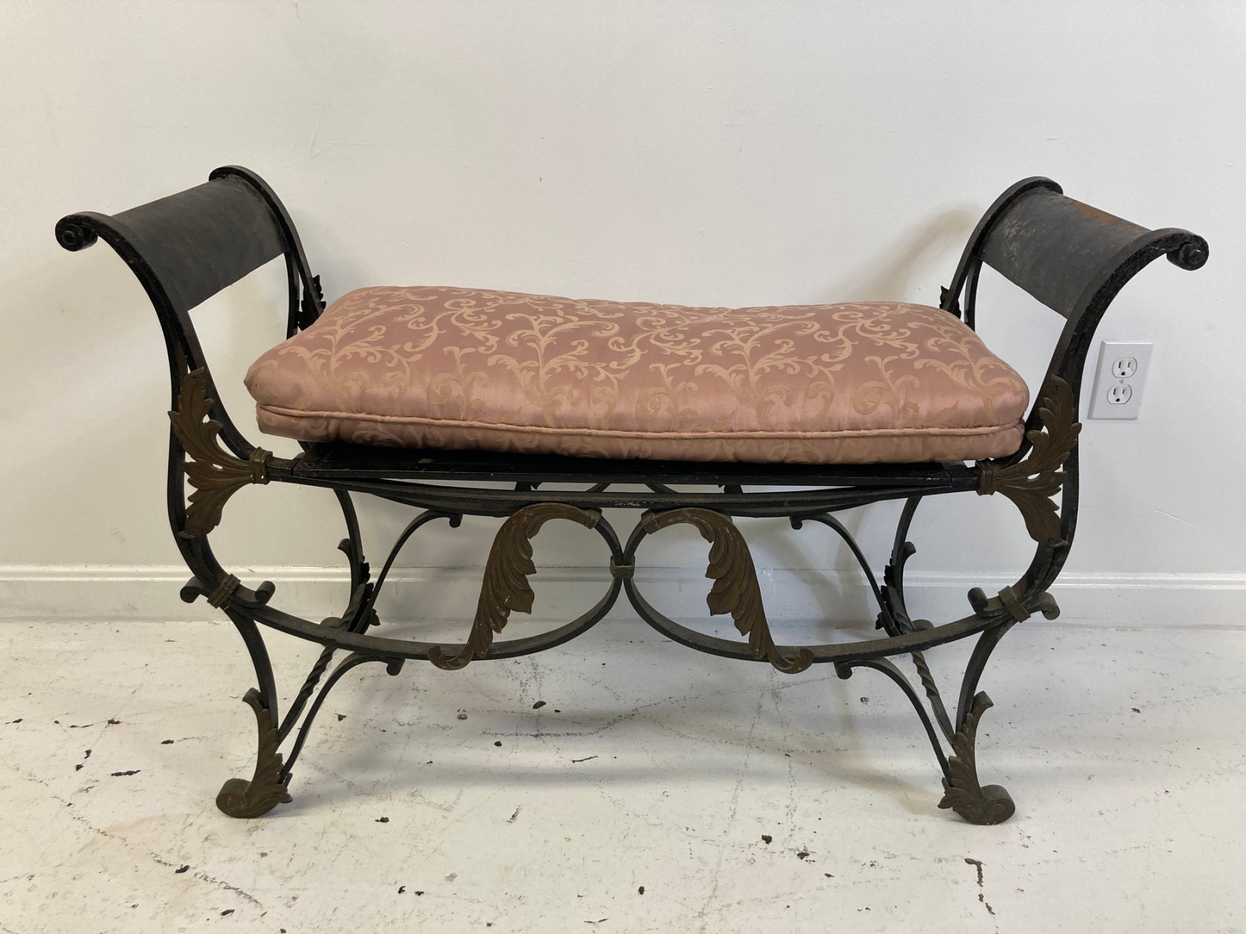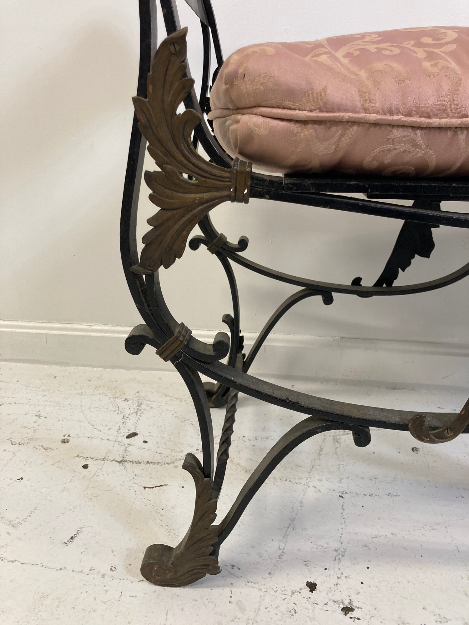 Selling a antique French wrought iron bench with brass accents. Circa late 19th-early 20th century.