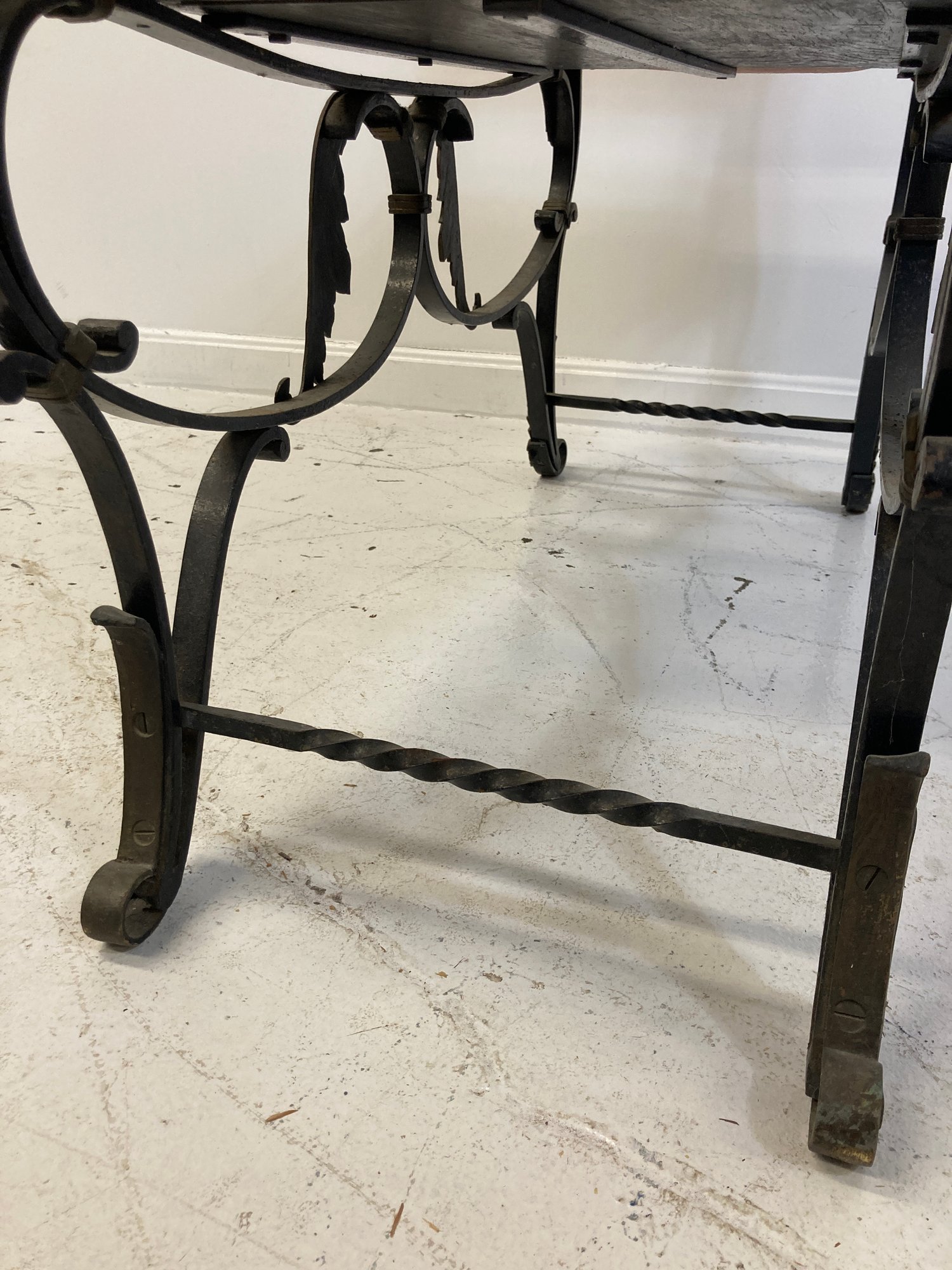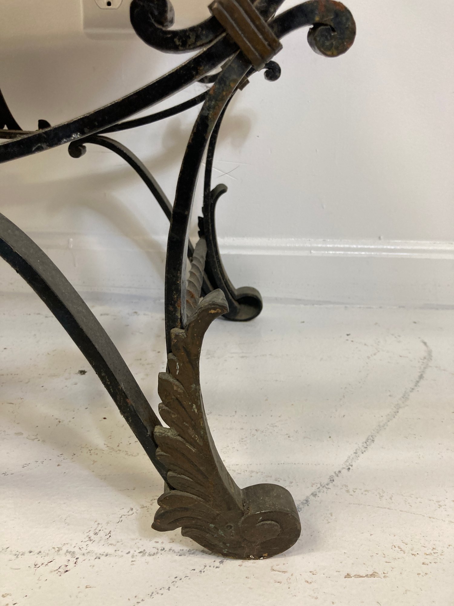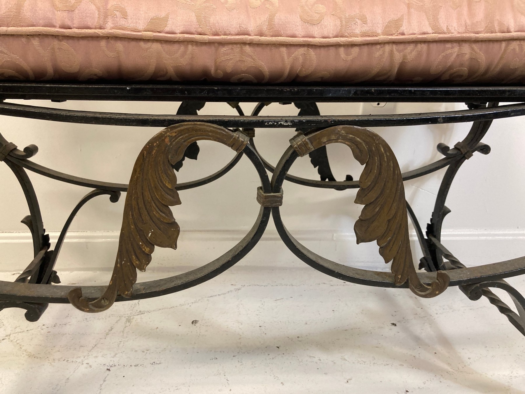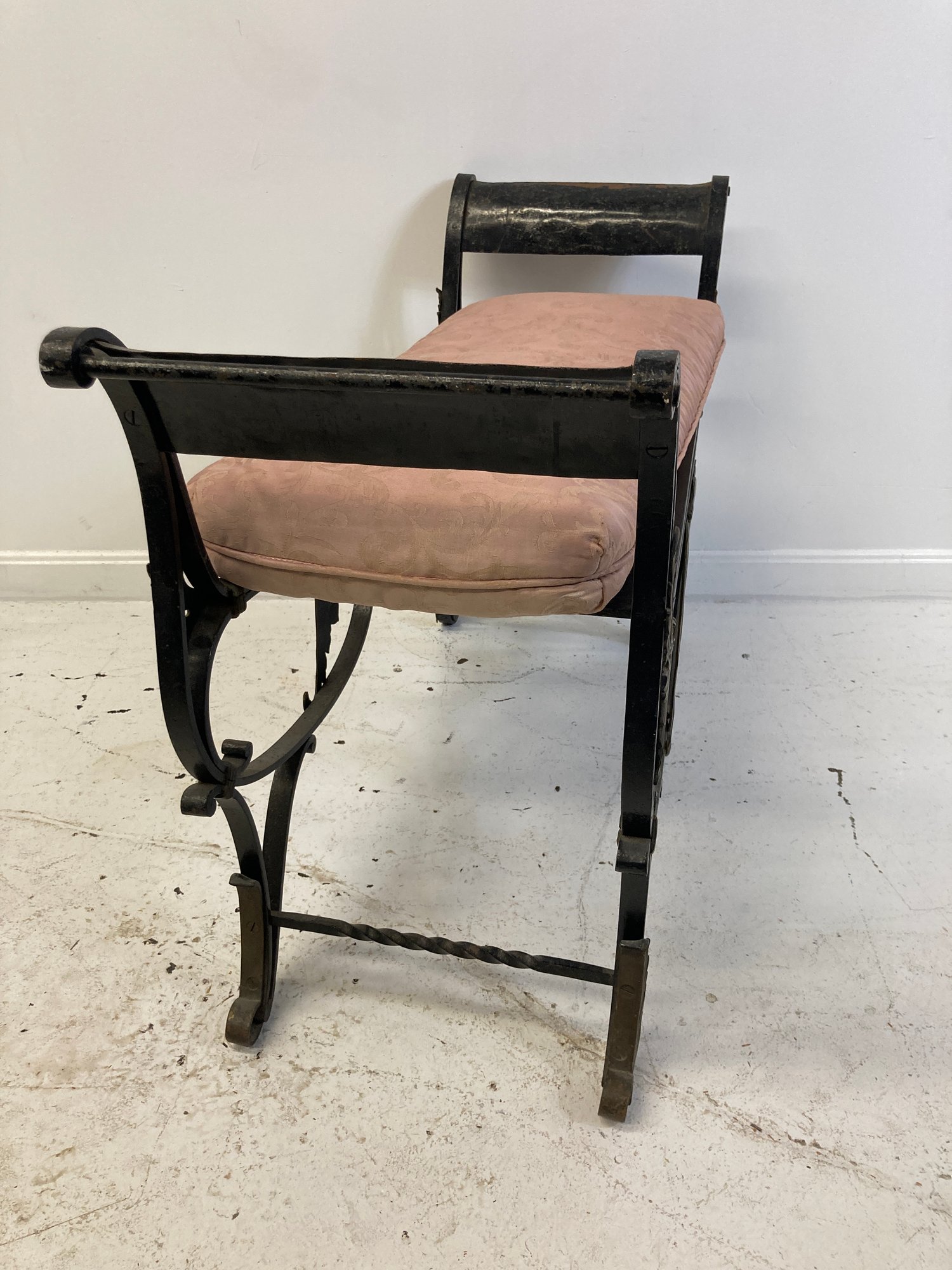 Selling a antique French wrought iron bench with brass accents. Circa late 19th-early 20th century.