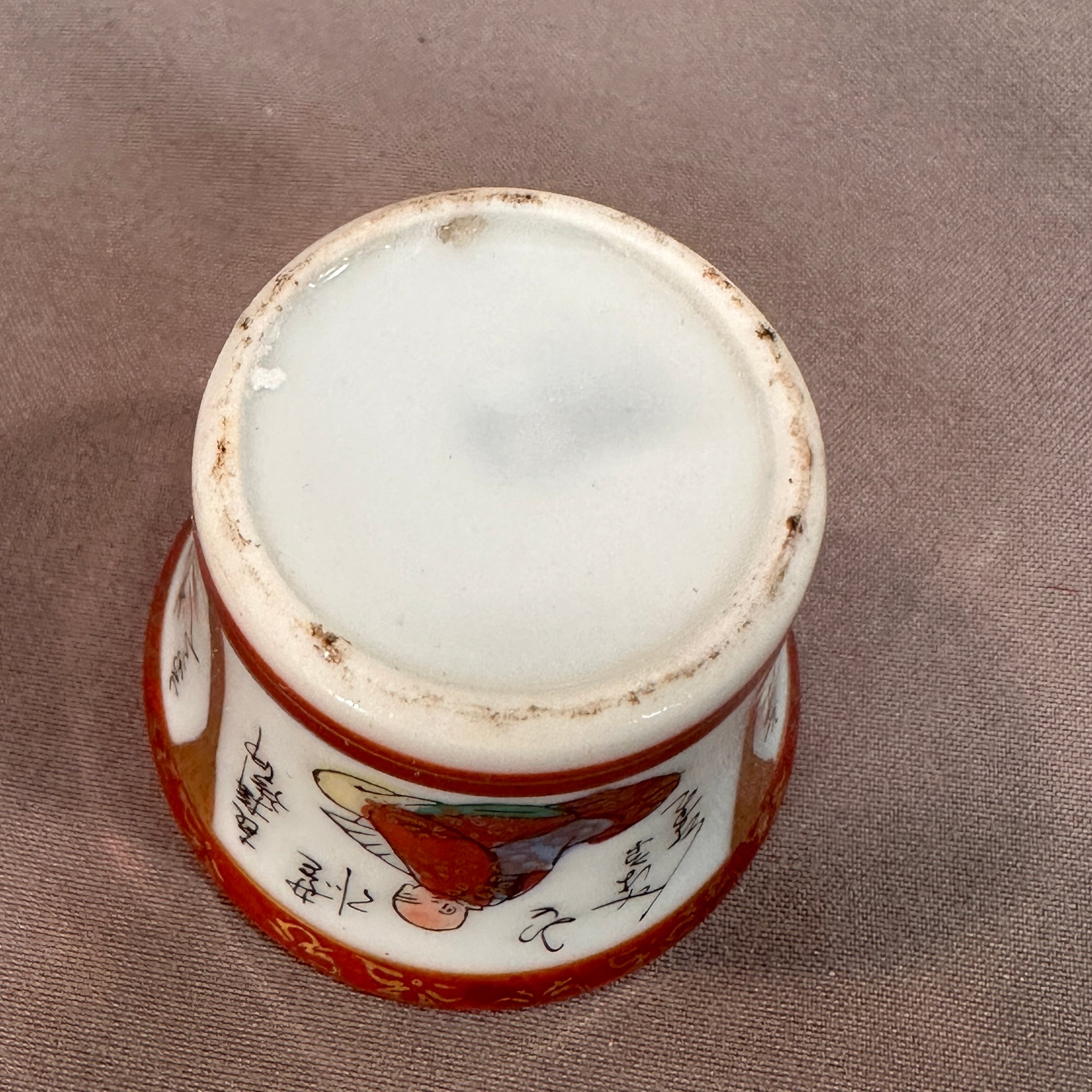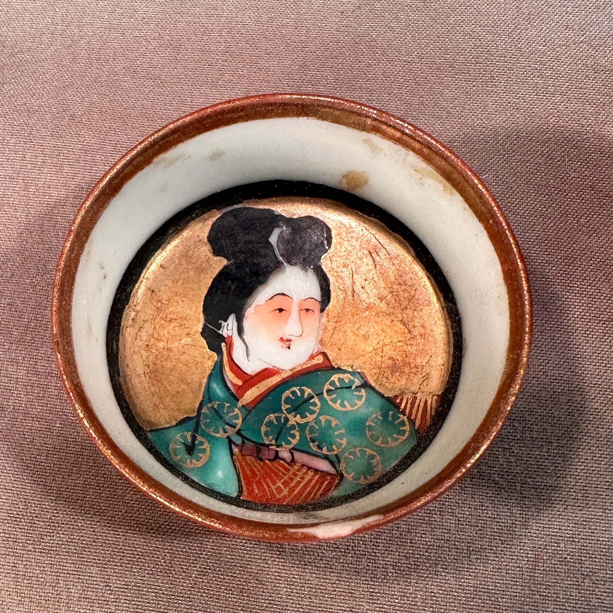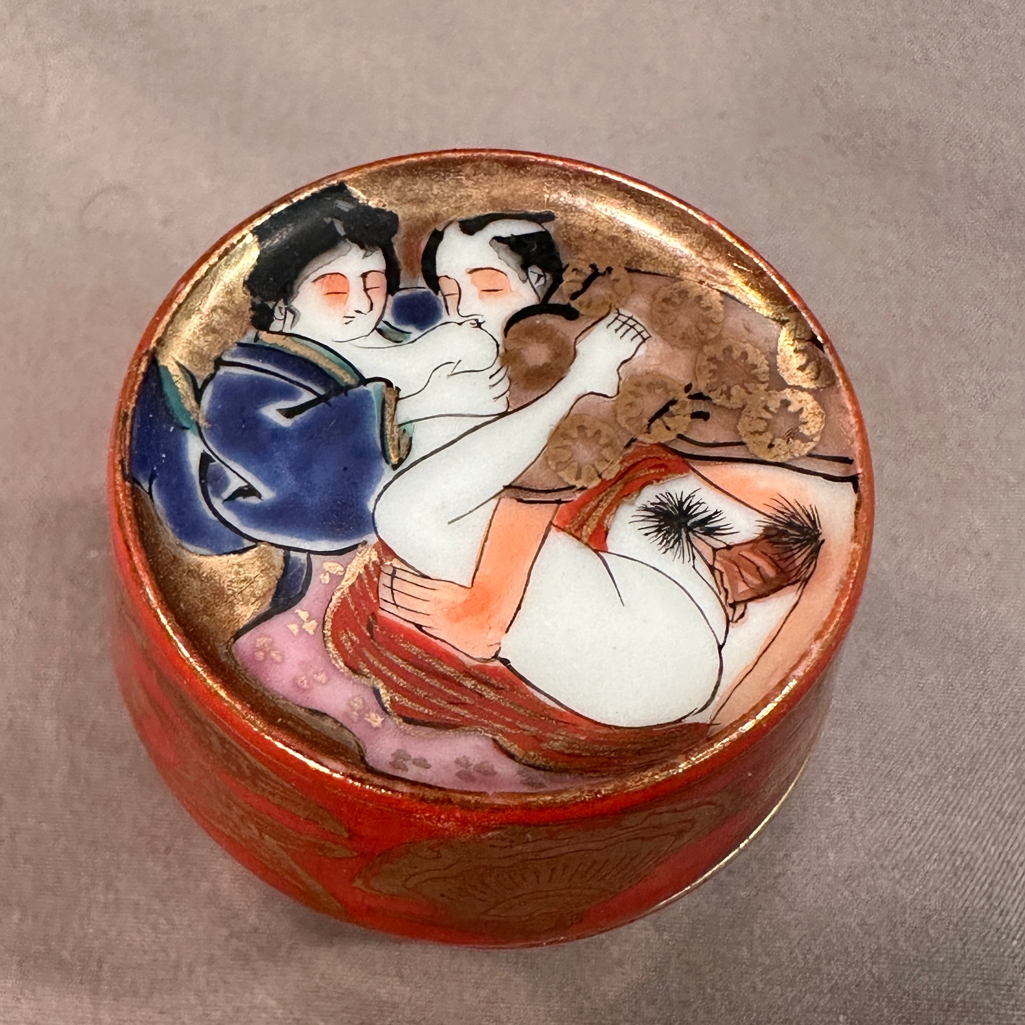A 2 part cup and lid set. Cup features three scenes with calligraphy writing and red/gold trim. The tops outside showcases an erotic scene while the interior features a portrait.