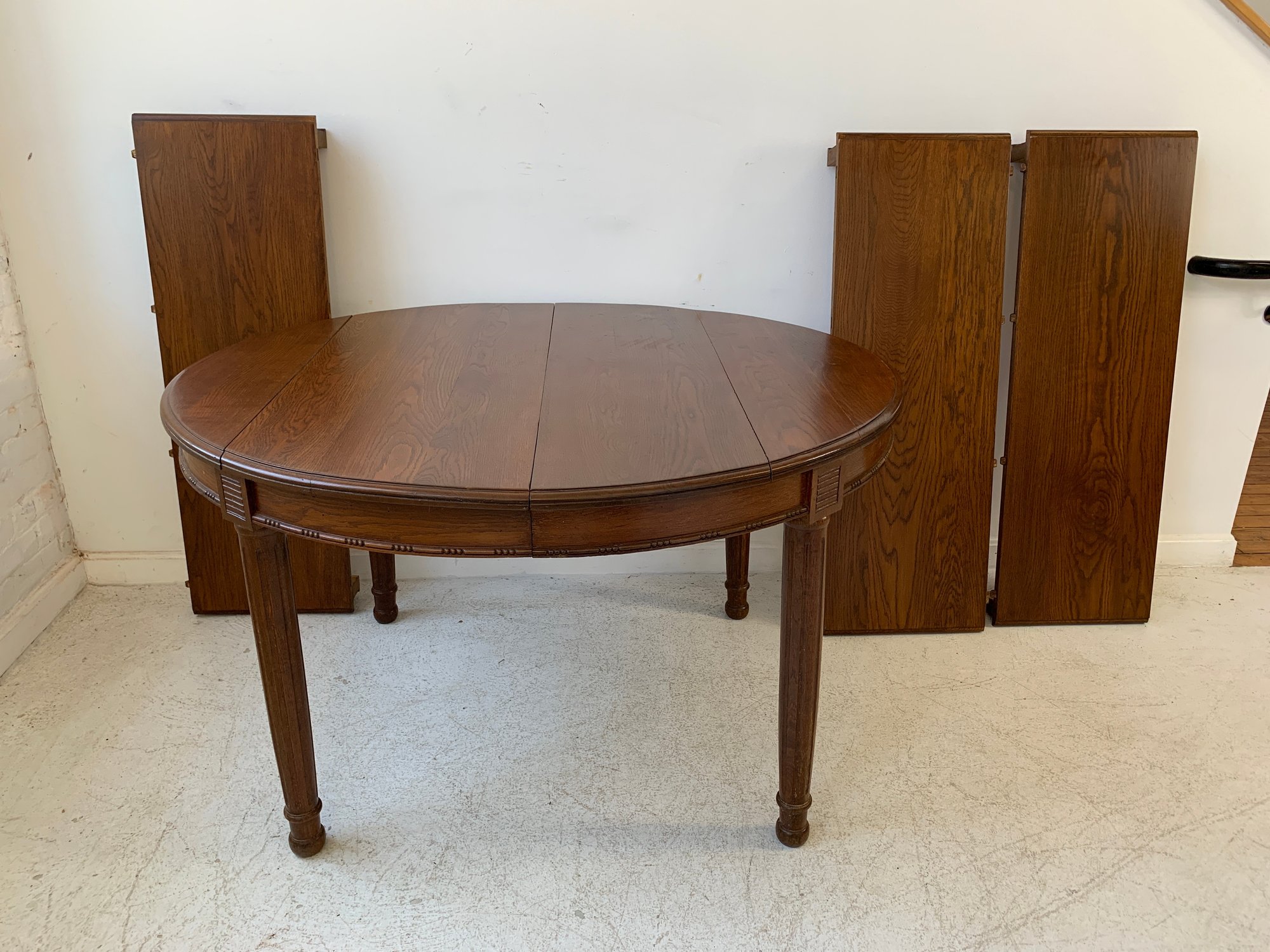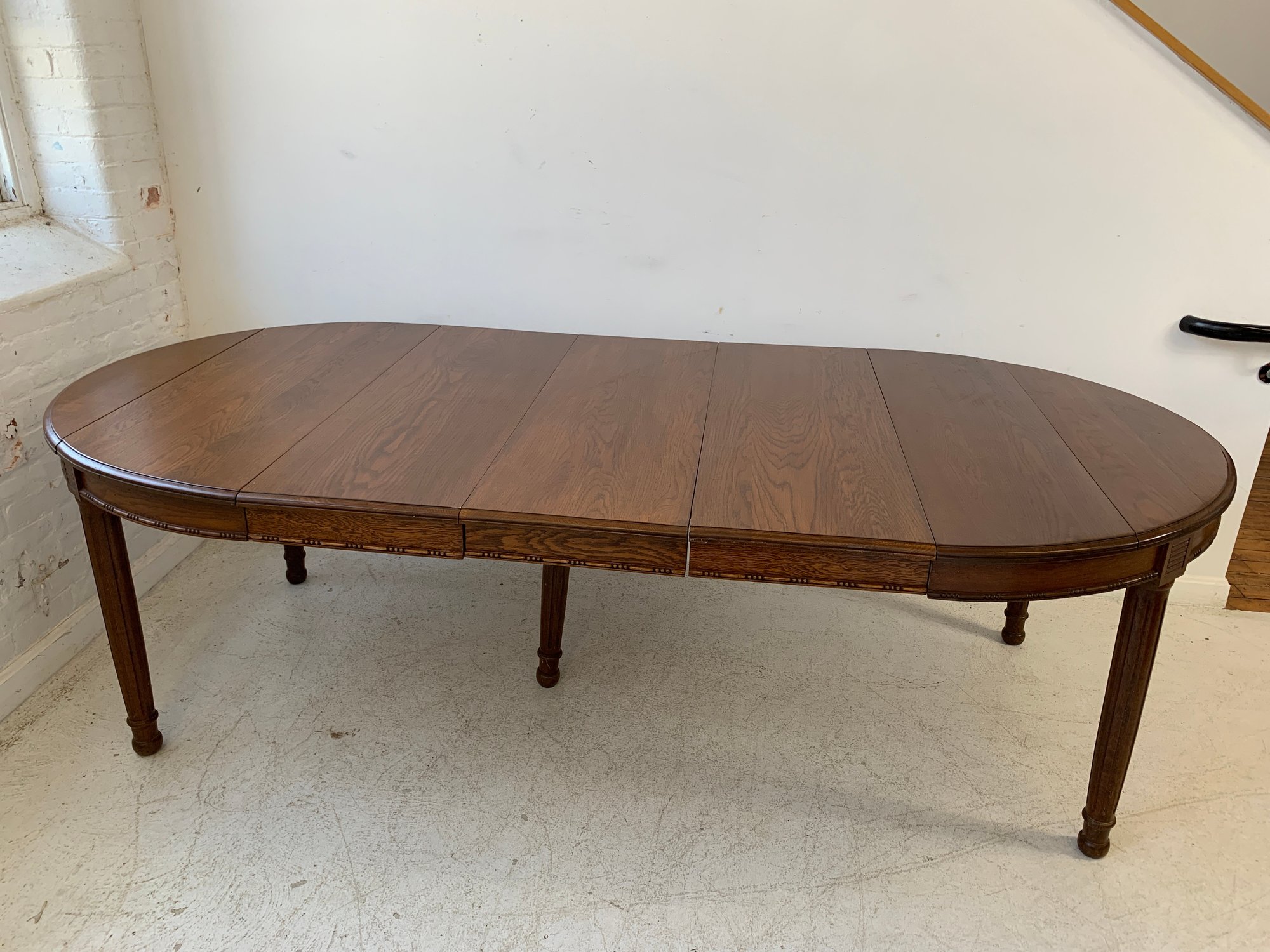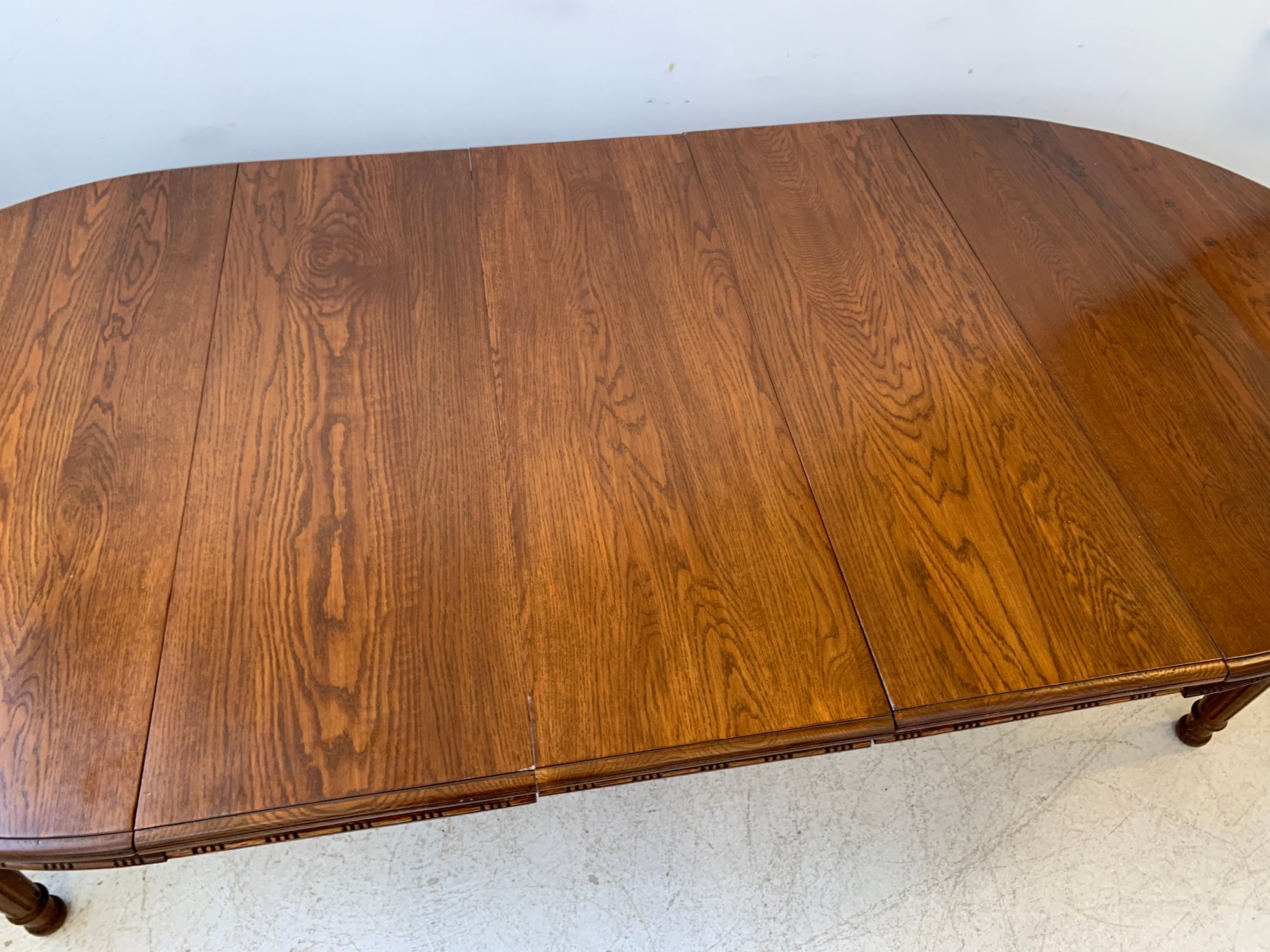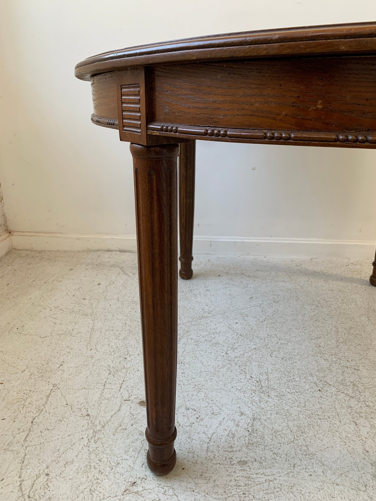 A solid oak extension dining table with an oval top, beaded carved apron, fluted tapered legs ending in turned feet, and carved rosette blocks at the leg joins. Includes three additional leaves and table felt pads.