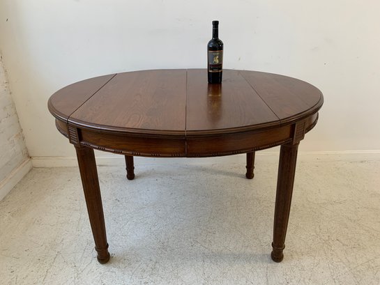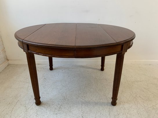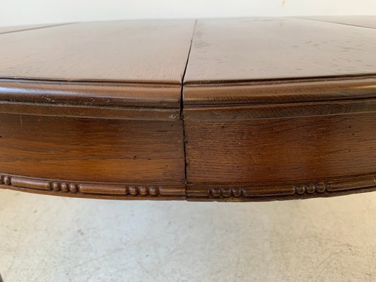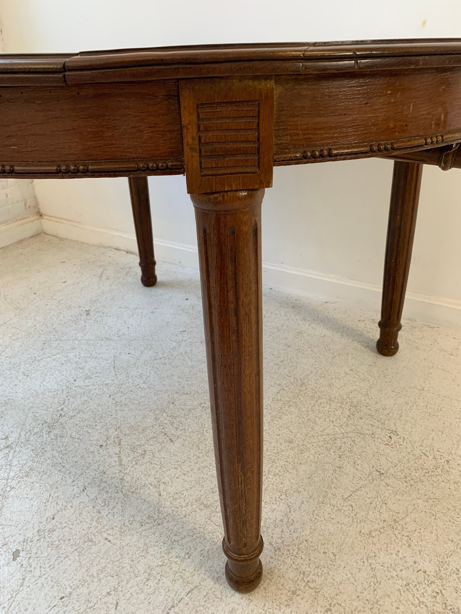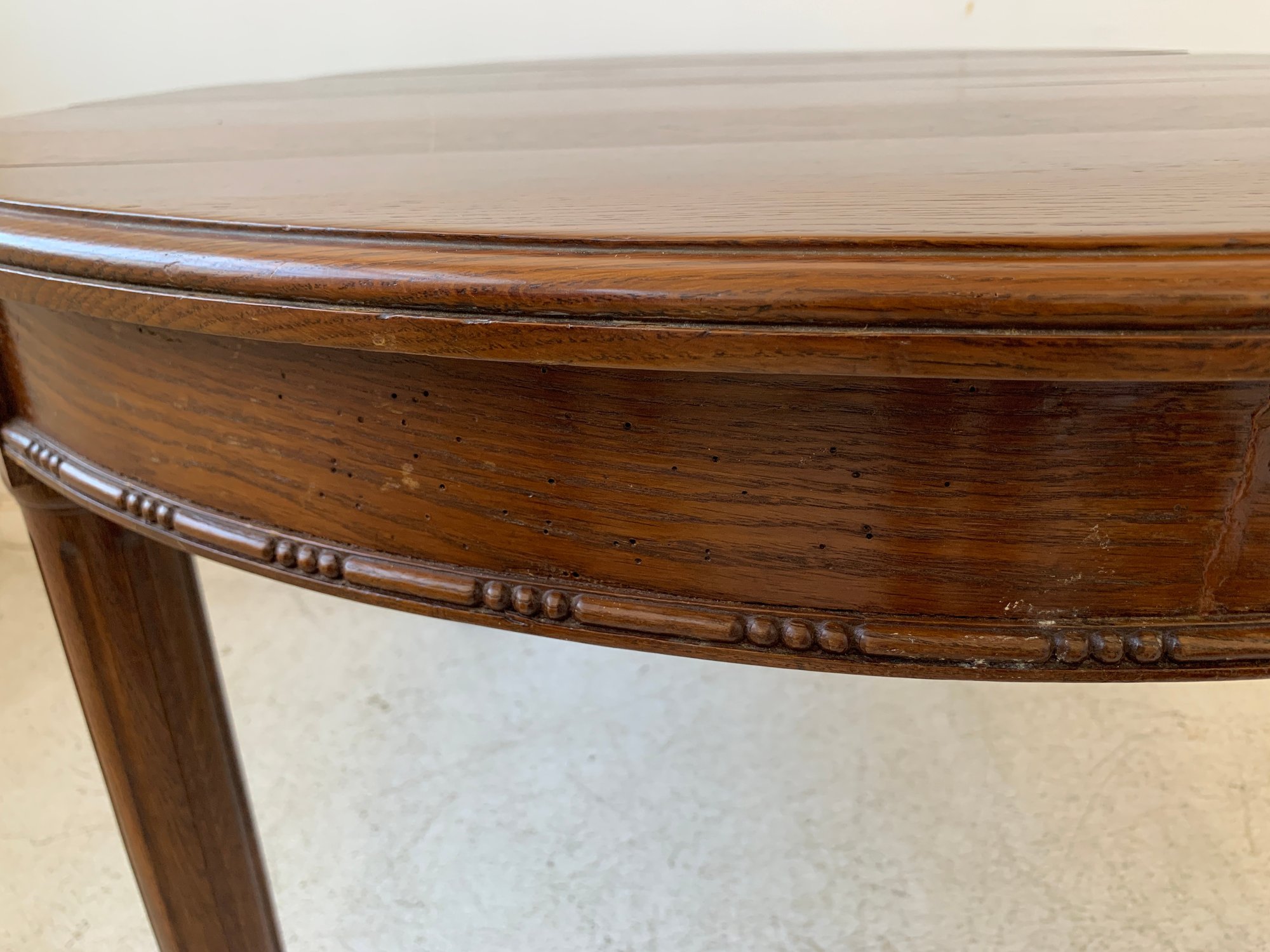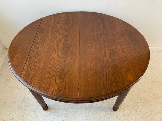 A solid oak extension dining table with an oval top, beaded carved apron, fluted tapered legs ending in turned feet, and carved rosette blocks at the leg joins. Includes three additional leaves and table felt pads.