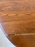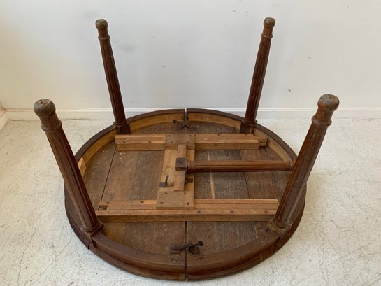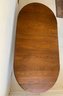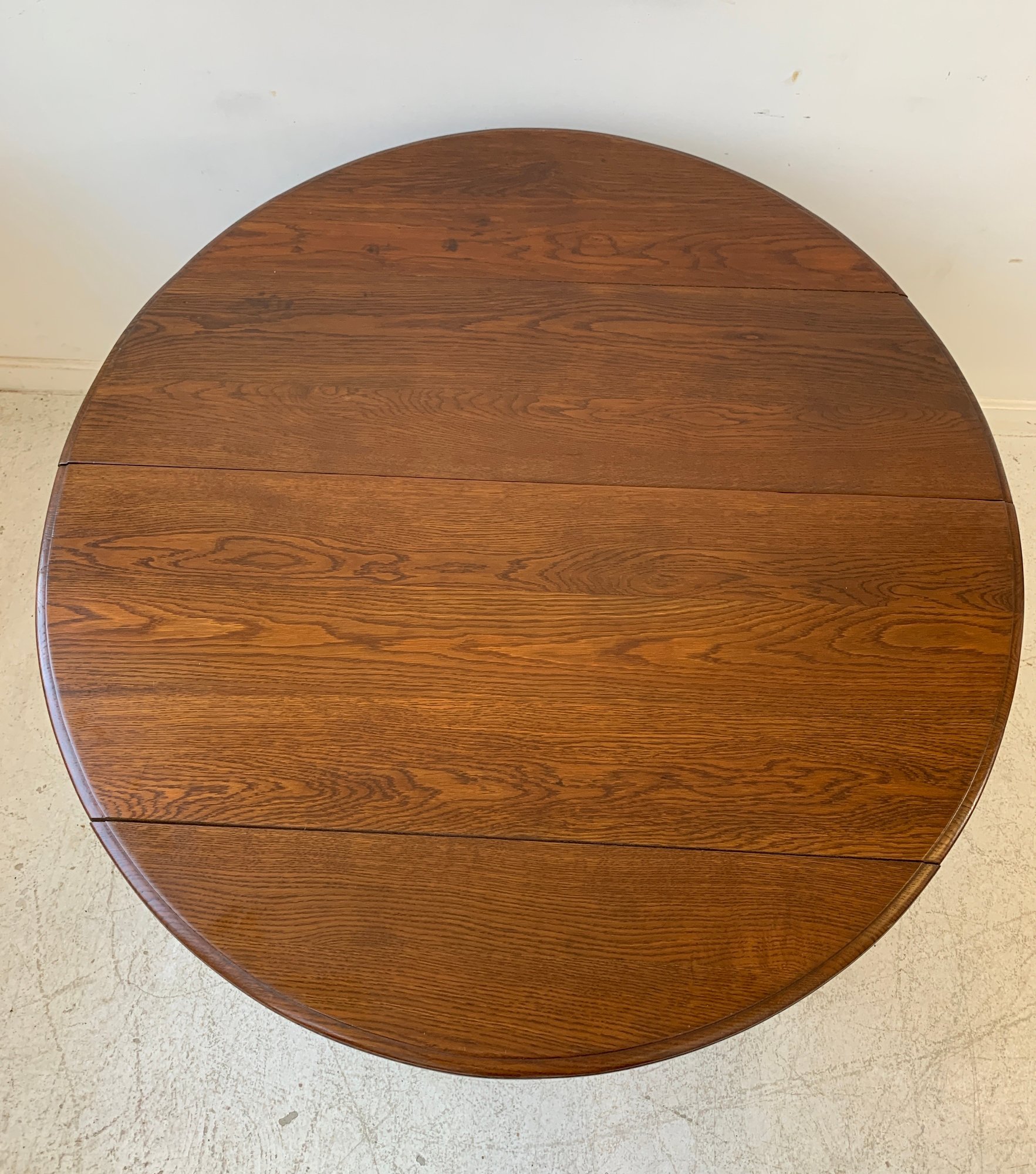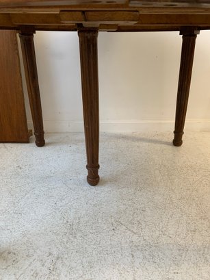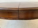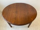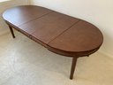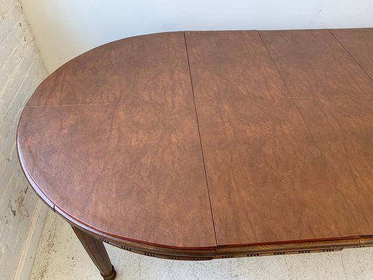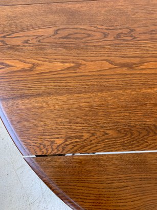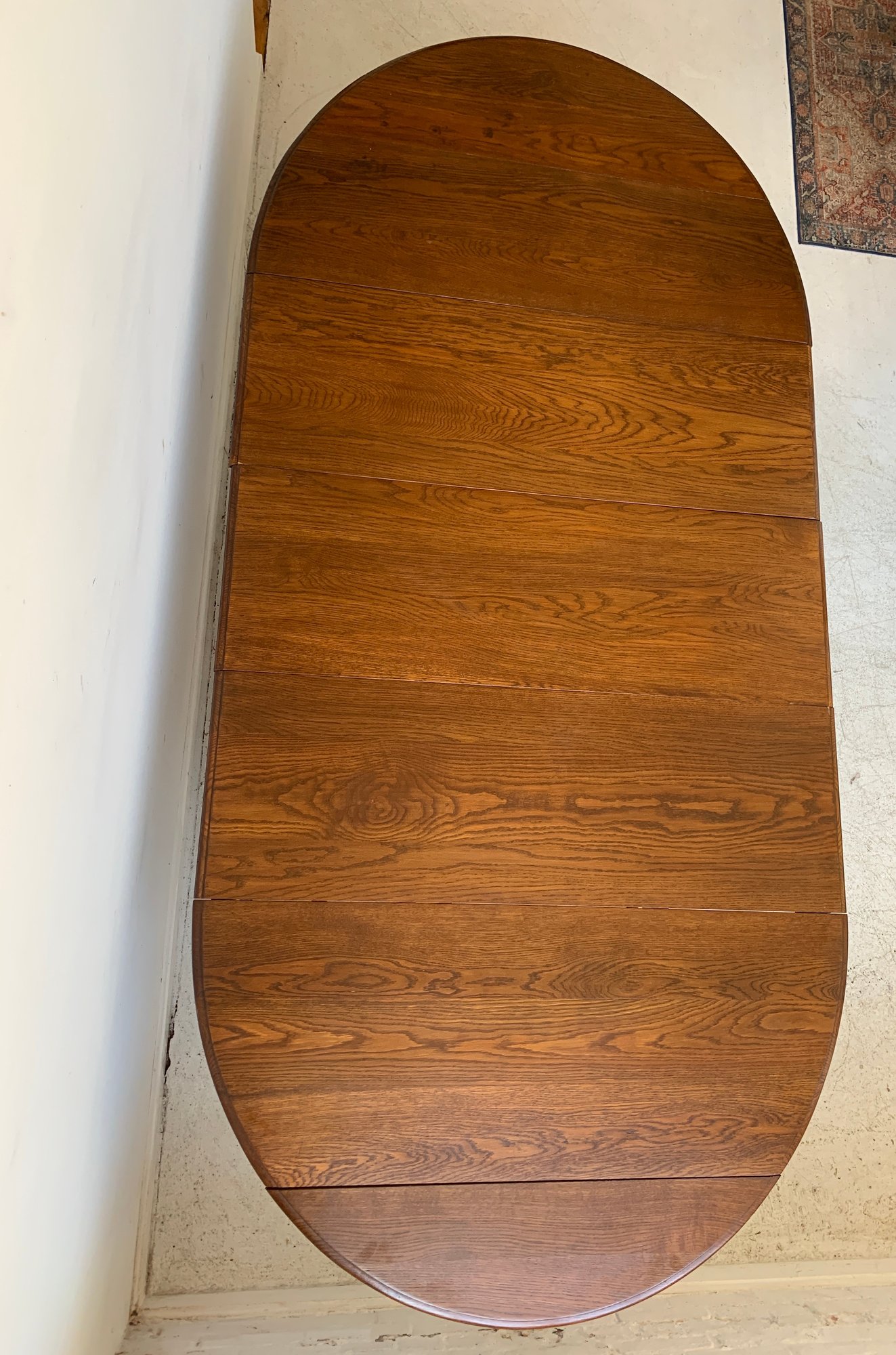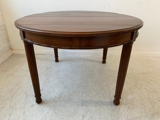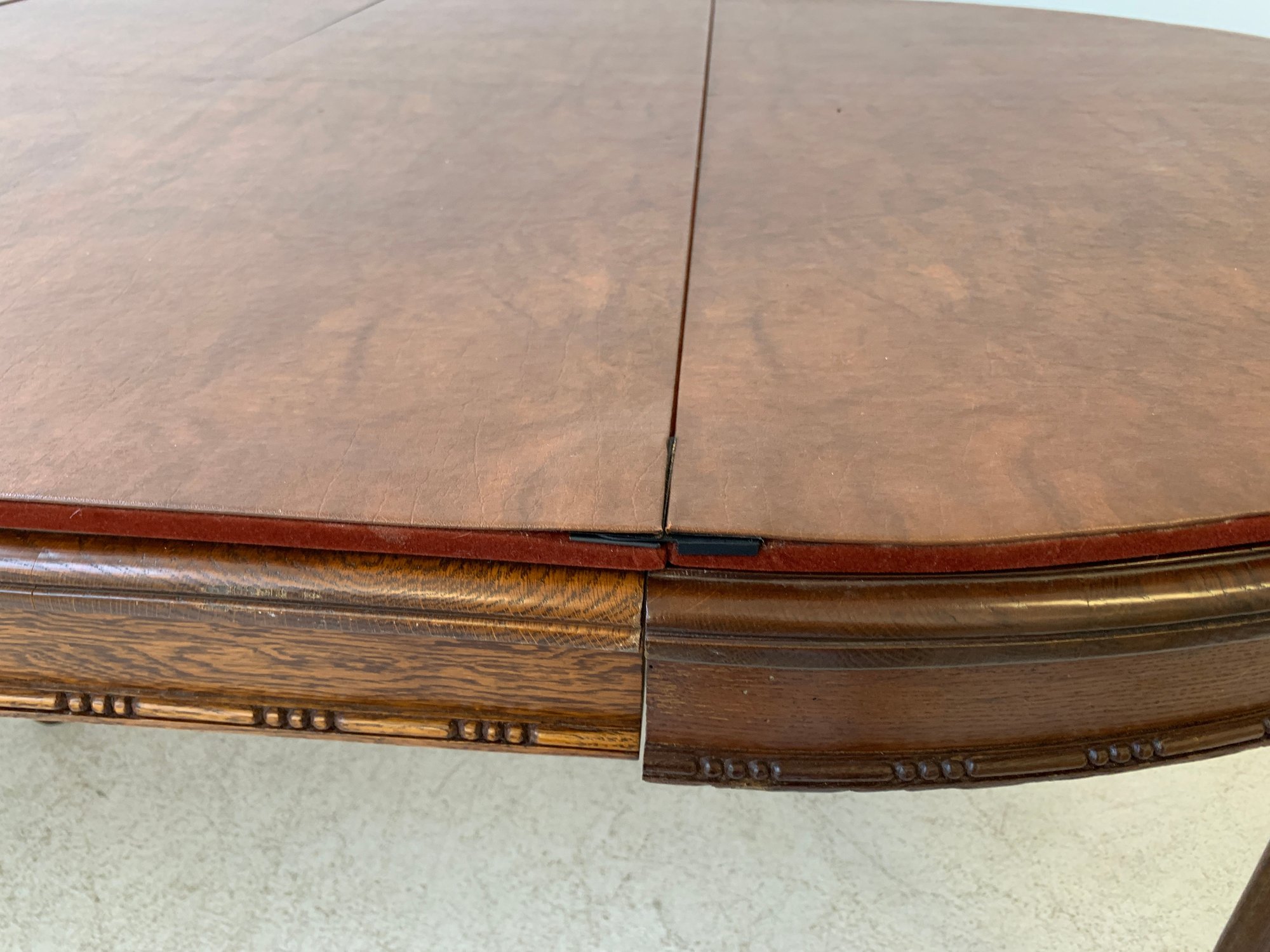 A solid oak extension dining table with an oval top, beaded carved apron, fluted tapered legs ending in turned feet, and carved rosette blocks at the leg joins. Includes three additional leaves and table felt pads.