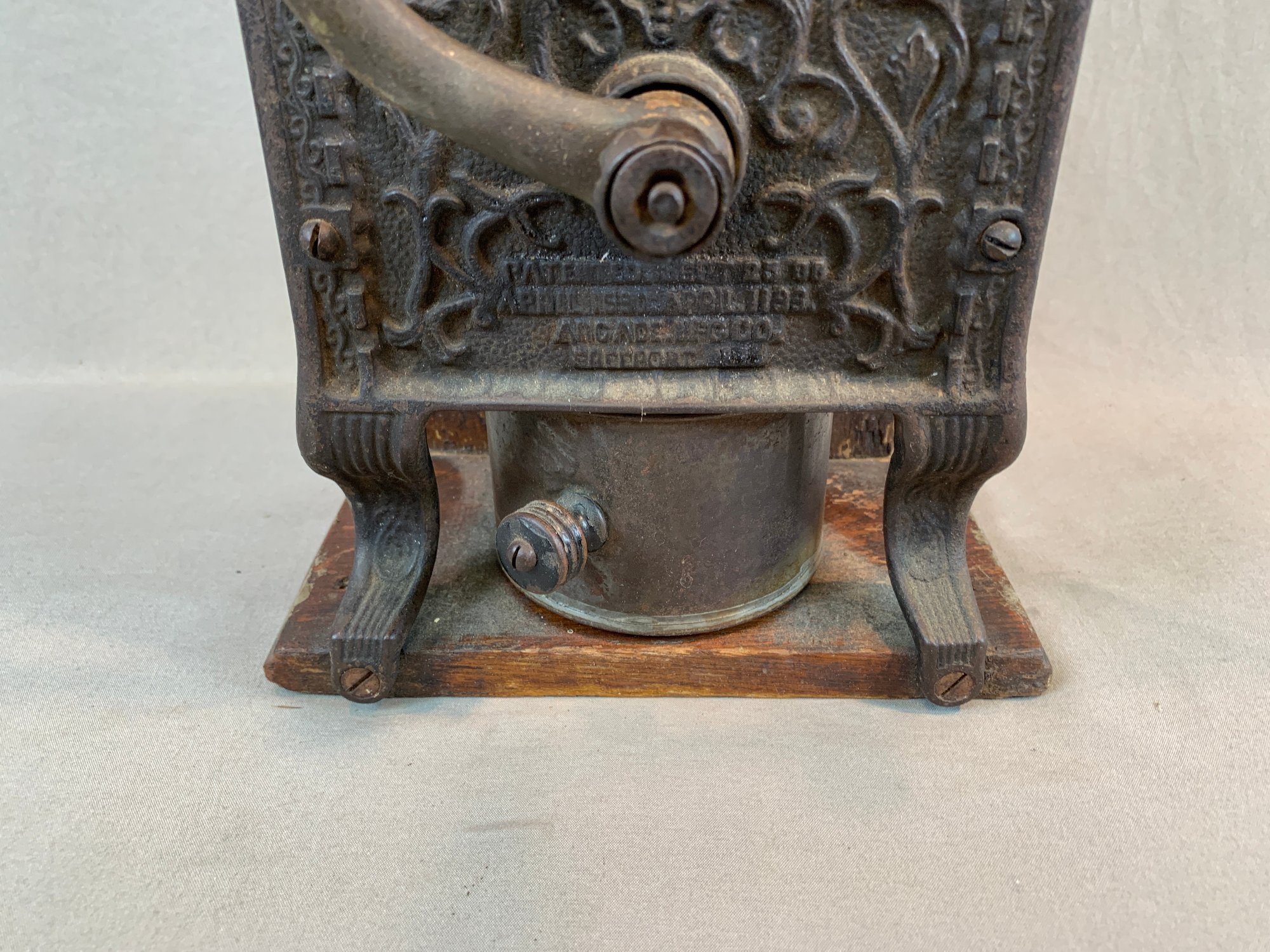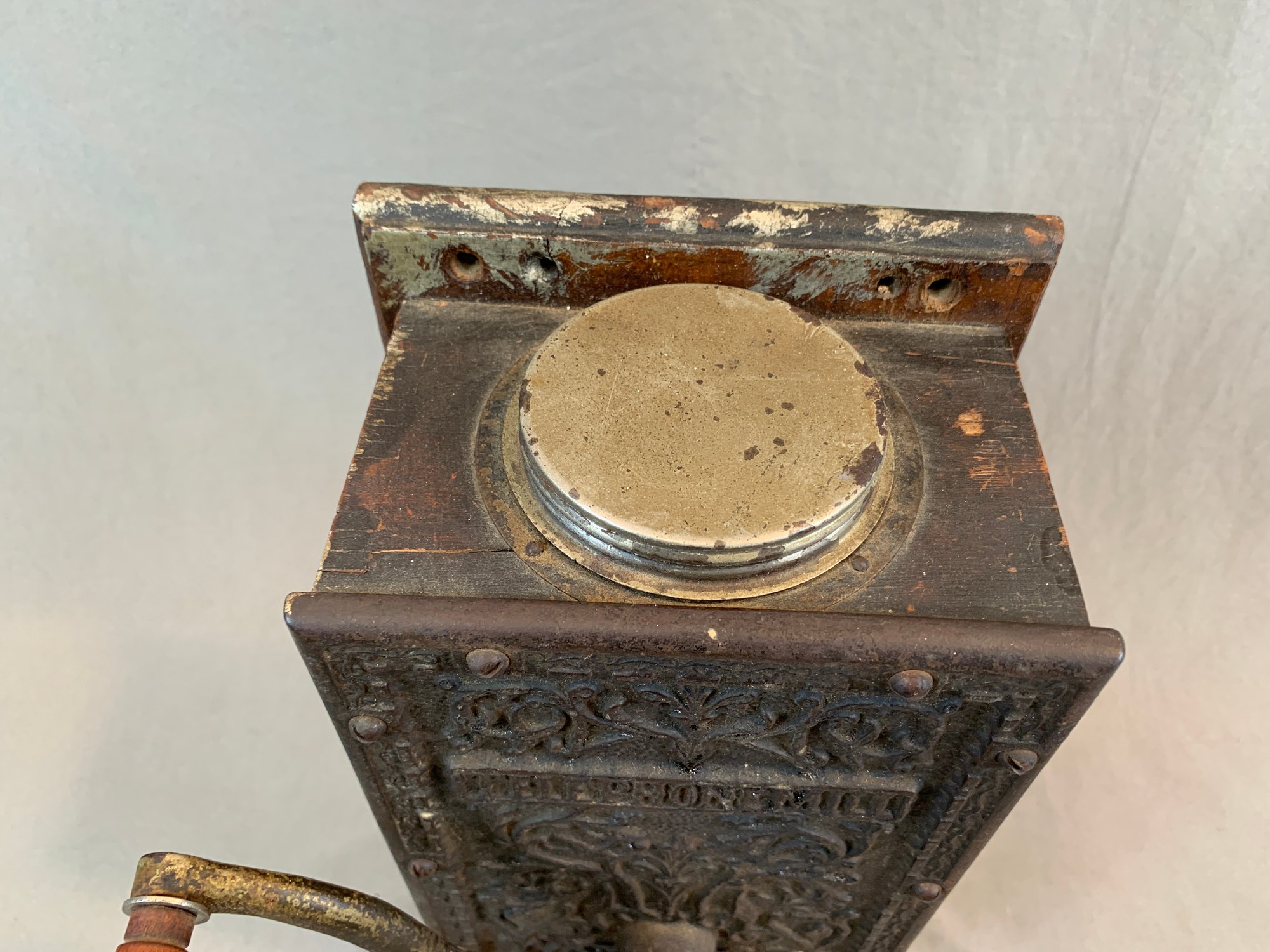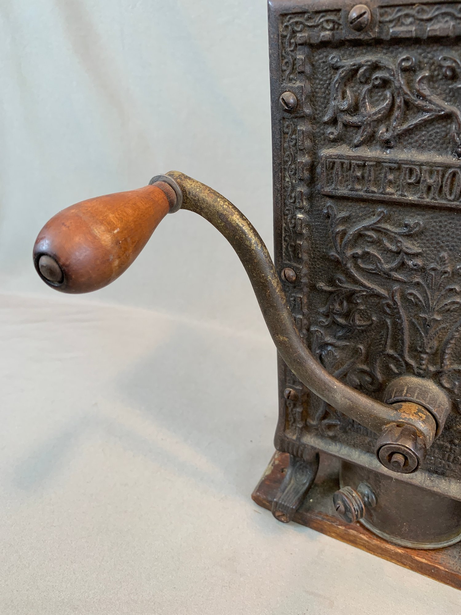 An antique wall-mount cast iron coffee grinder by Arcade Mfg. Co., Freeport, IL. Marked "Telephone Mill," patented Jan. 25, 1898 and April 11, 1898. Features heavily embossed Art Nouveau cast iron front panel, wooden hopper box with tin lid, curved crank arm with turned wooden handle, and cast iron base with wooden platform.
