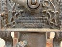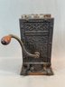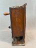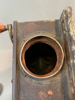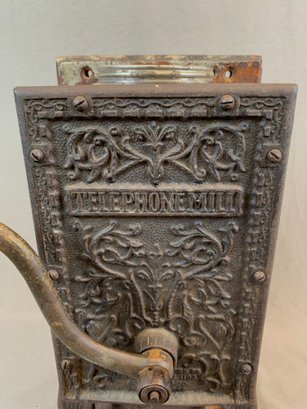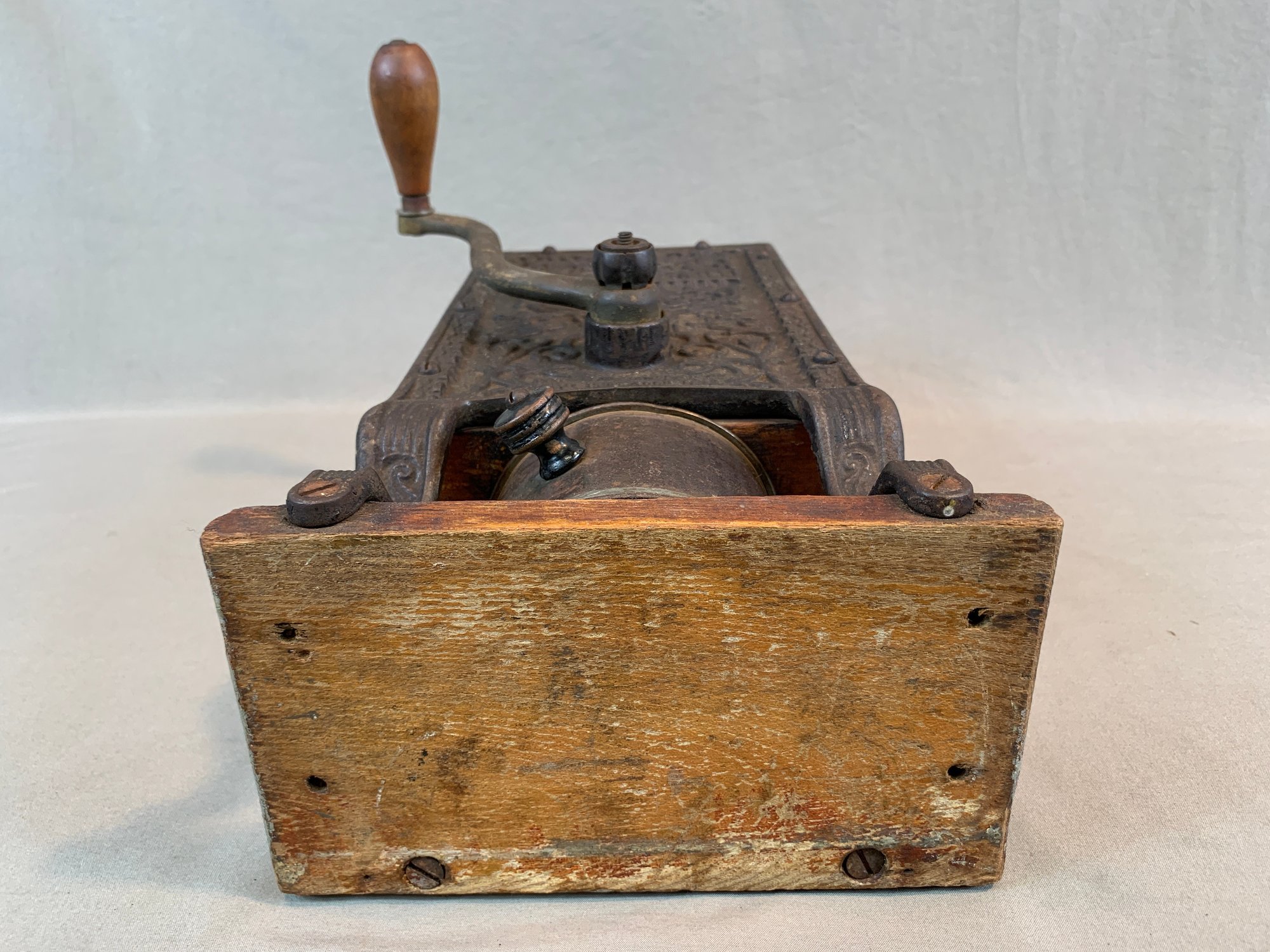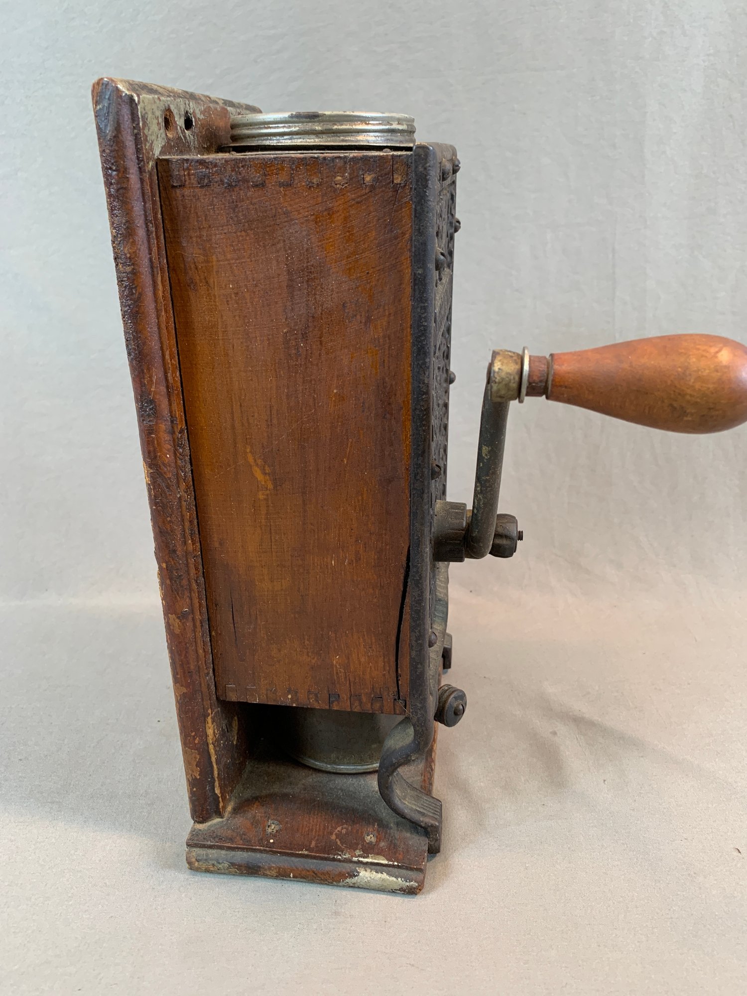 An antique wall-mount cast iron coffee grinder by Arcade Mfg. Co., Freeport, IL. Marked "Telephone Mill," patented Jan. 25, 1898 and April 11, 1898. Features heavily embossed Art Nouveau cast iron front panel, wooden hopper box with tin lid, curved crank arm with turned wooden handle, and cast iron base with wooden platform.