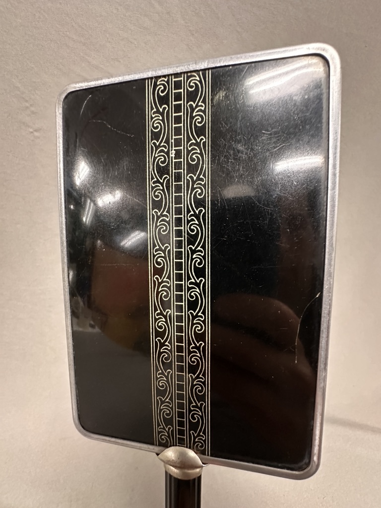 Elegant hand mirror with Bakelite handle and celluloid back in Art Deco design, mirror is rectangular in form and mirror glass in good useable condition .