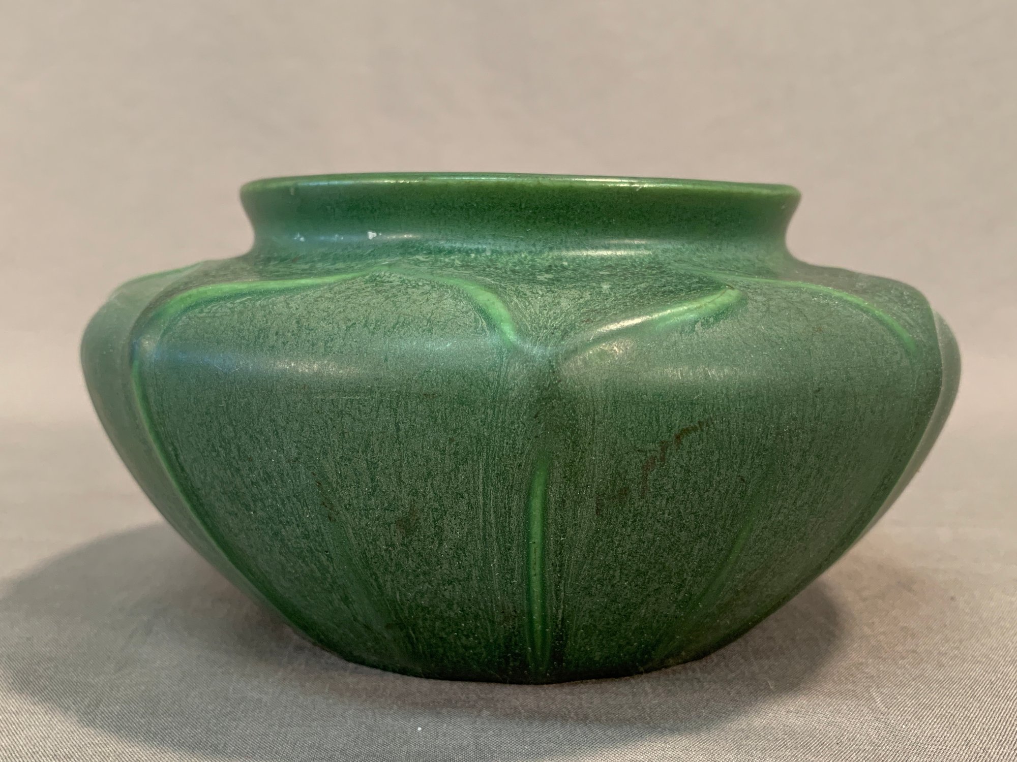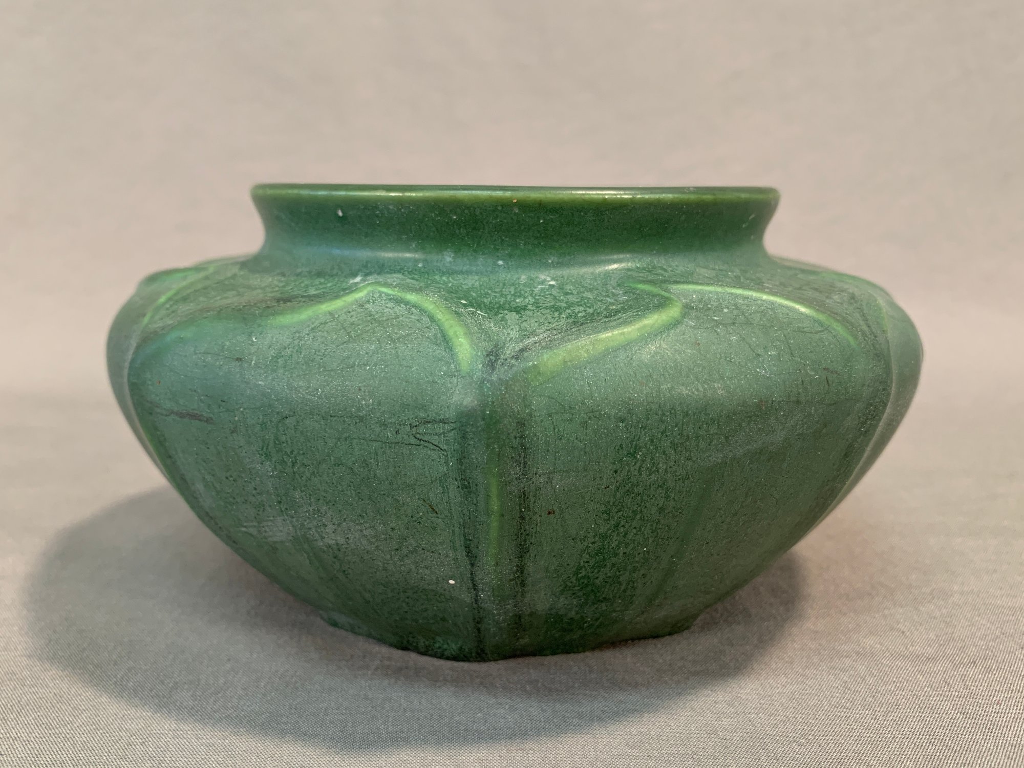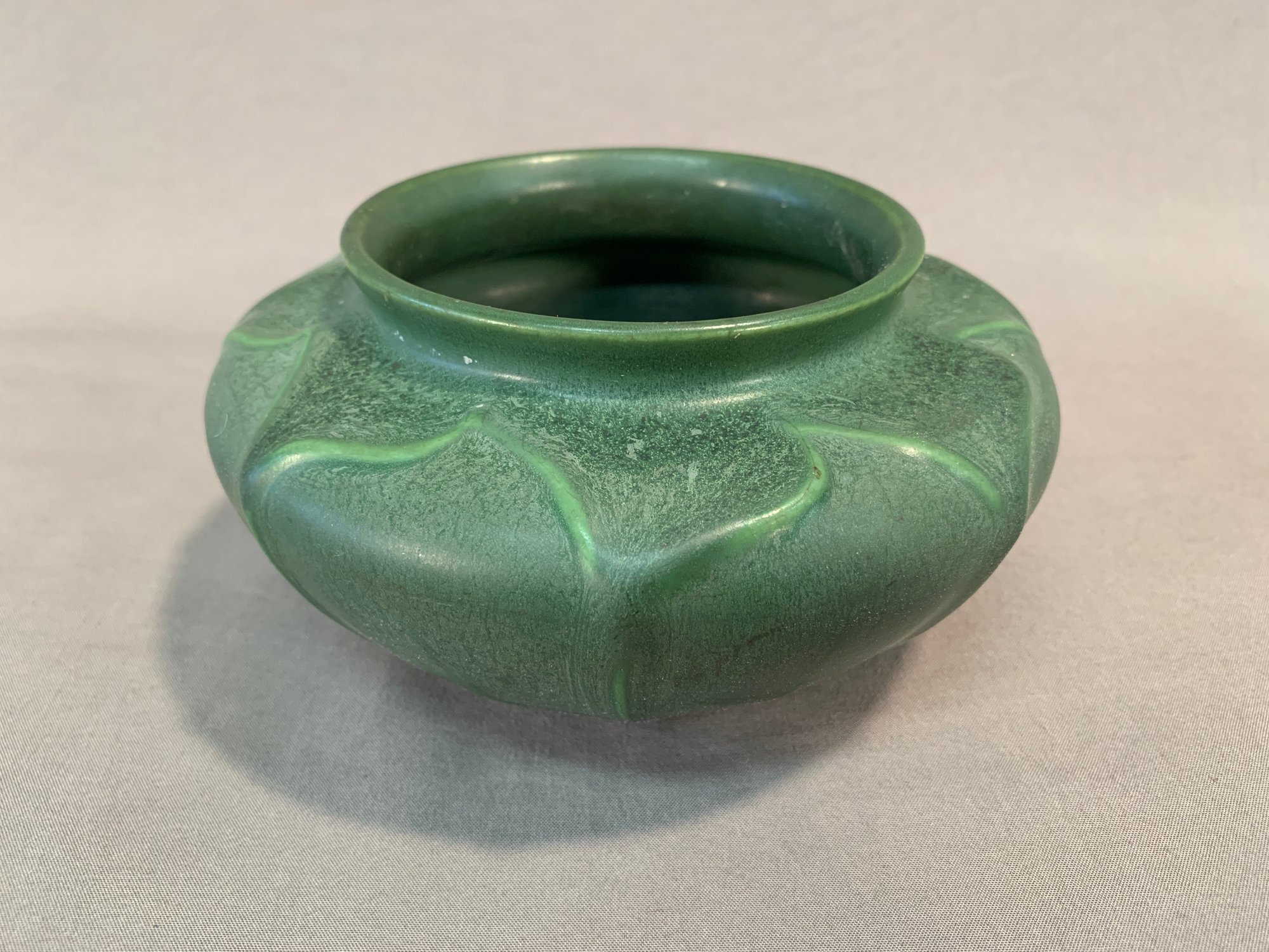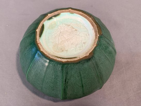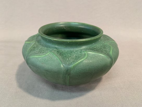 Hampshire Art Pottery squat-form vase, featuring a rich green matte glaze with drip glaze accents. Base stamped with the number 132 and a partial Hampshire mark. A solid example of American Arts & Crafts pottery.