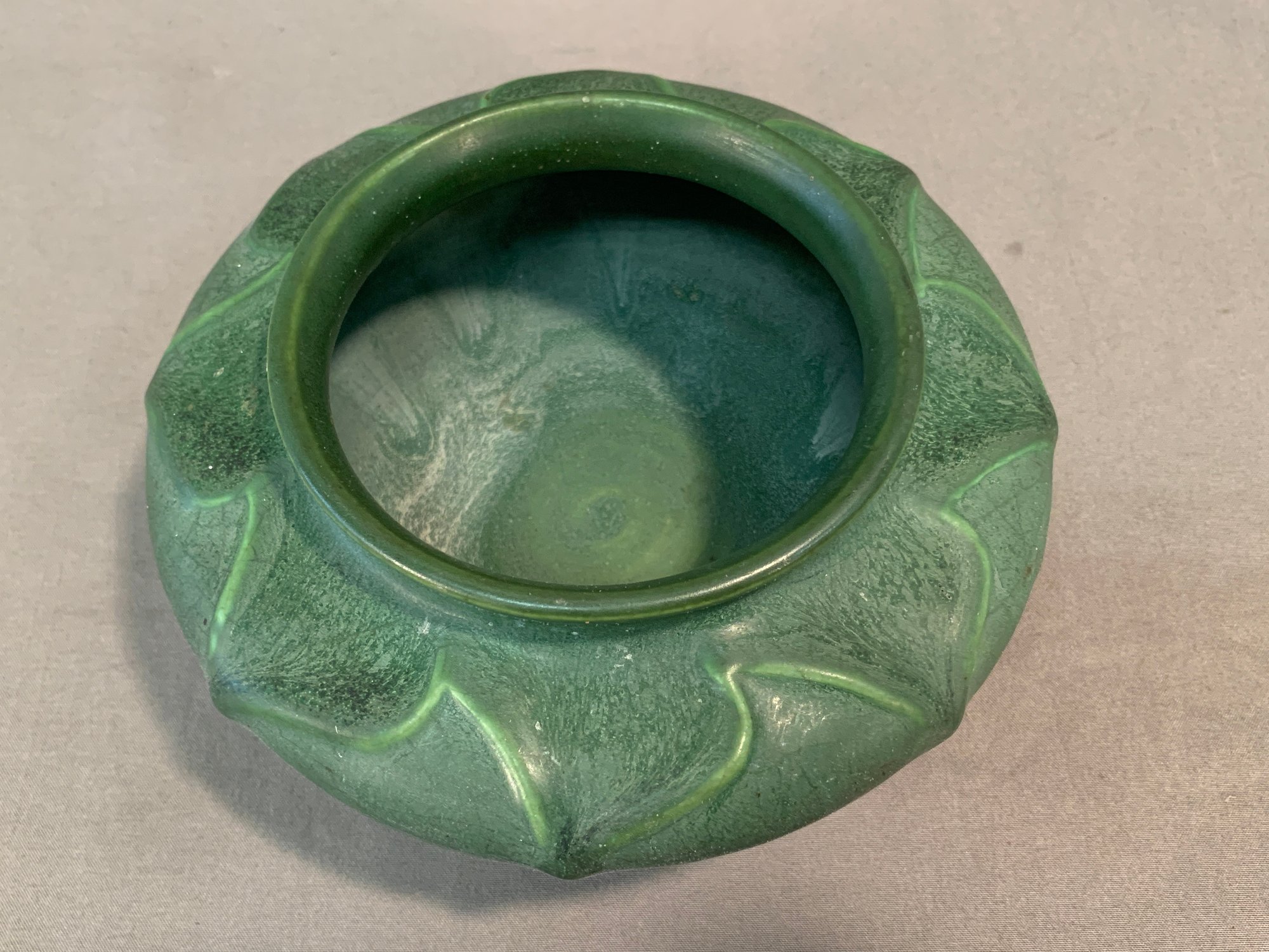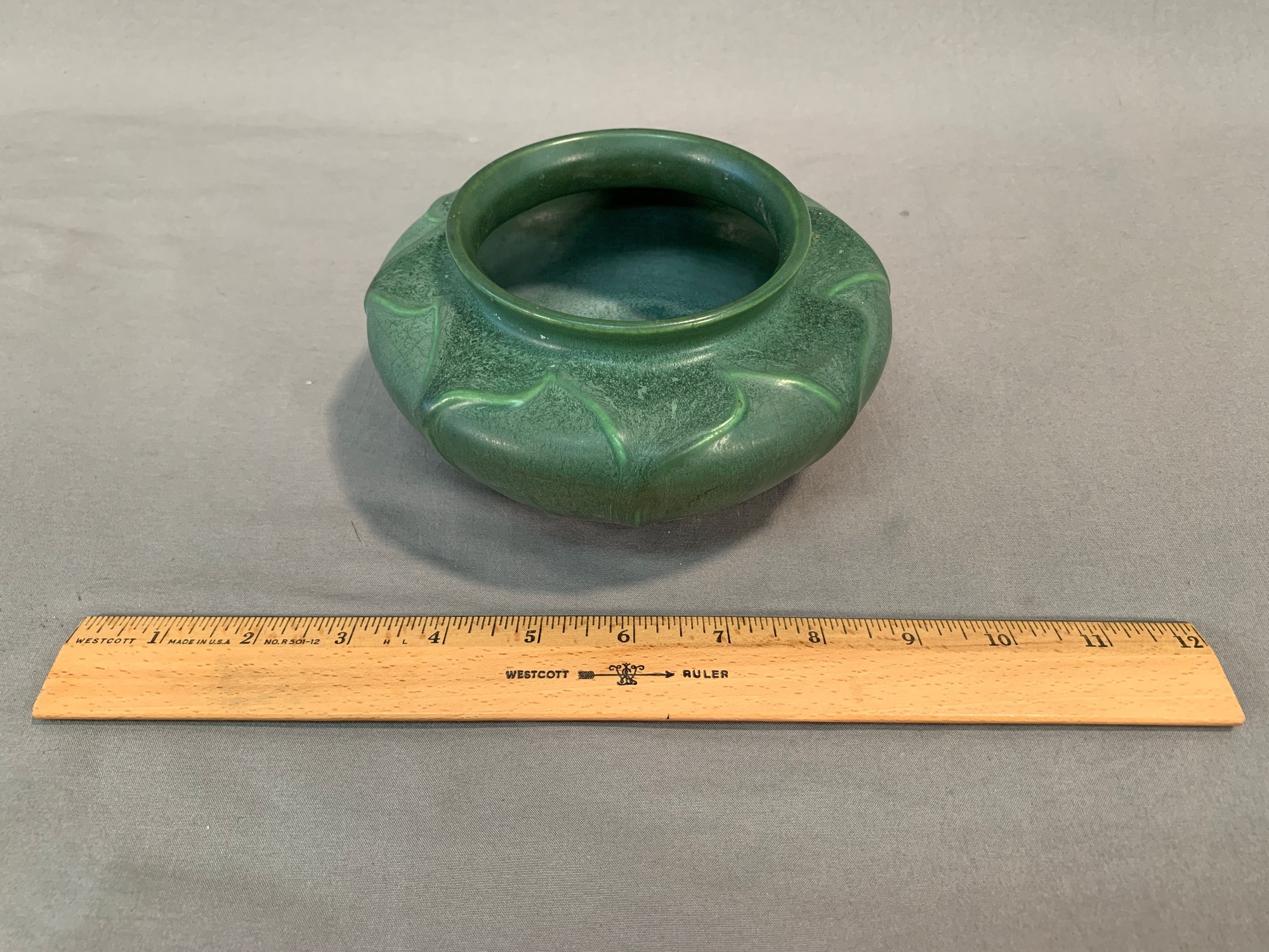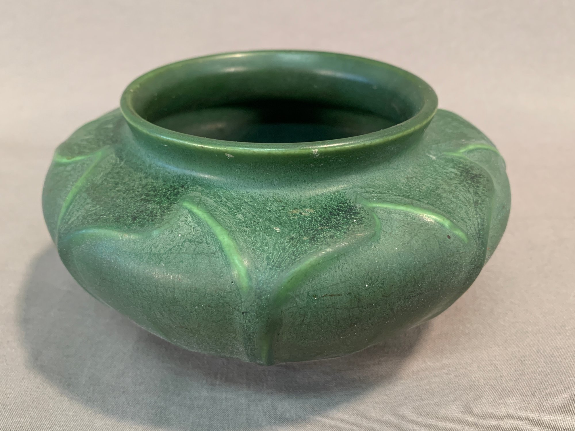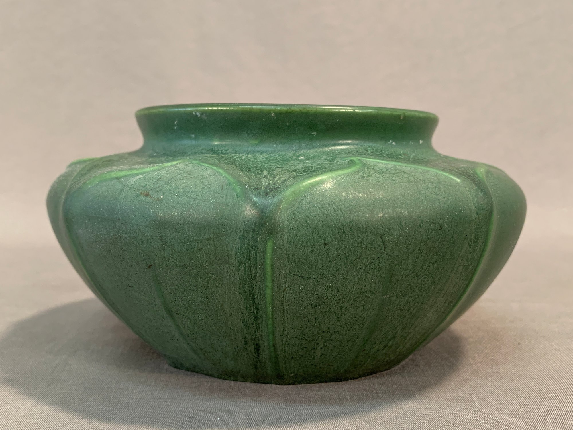 Hampshire Art Pottery squat-form vase, featuring a rich green matte glaze with drip glaze accents. Base stamped with the number 132 and a partial Hampshire mark. A solid example of American Arts & Crafts pottery.