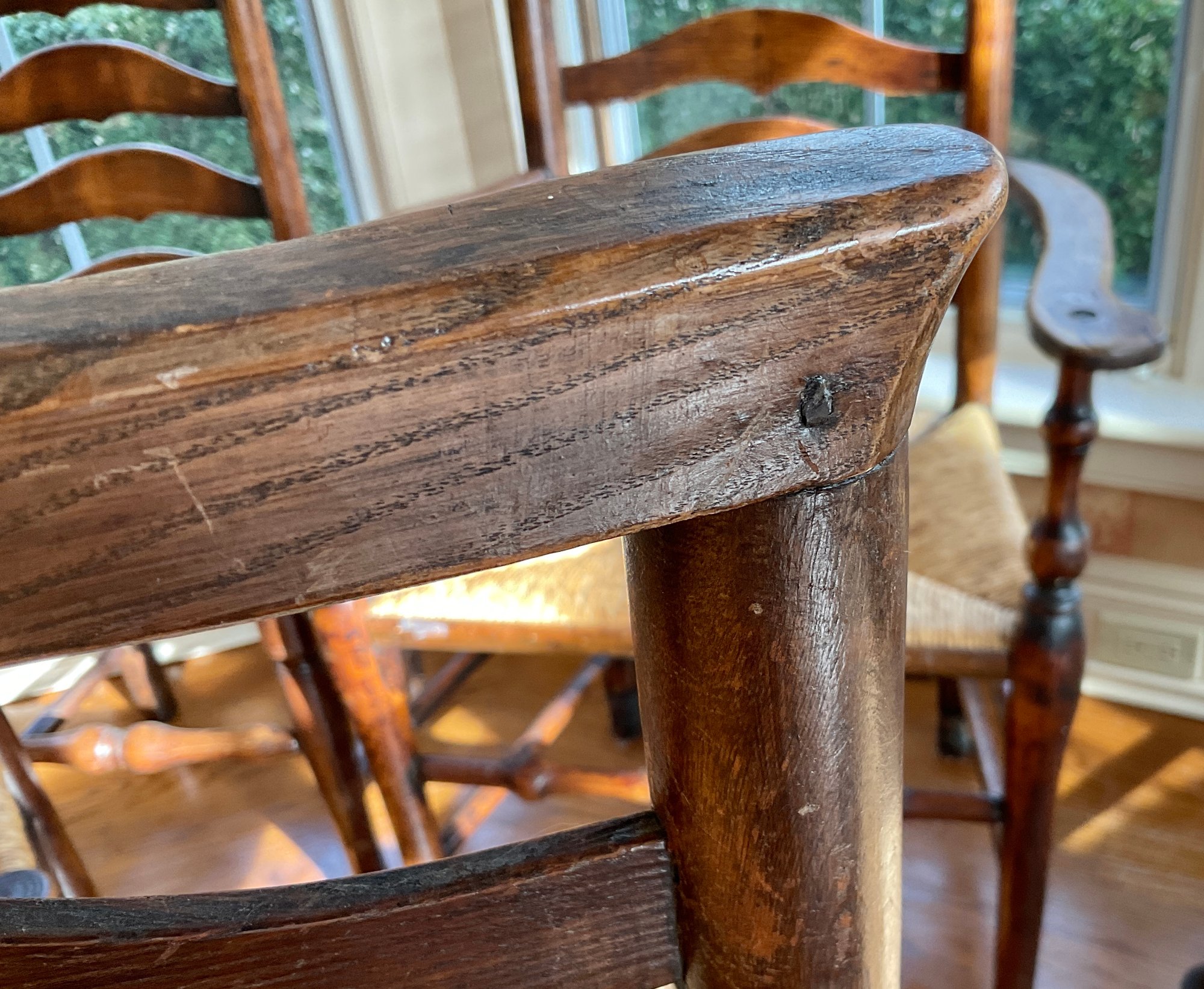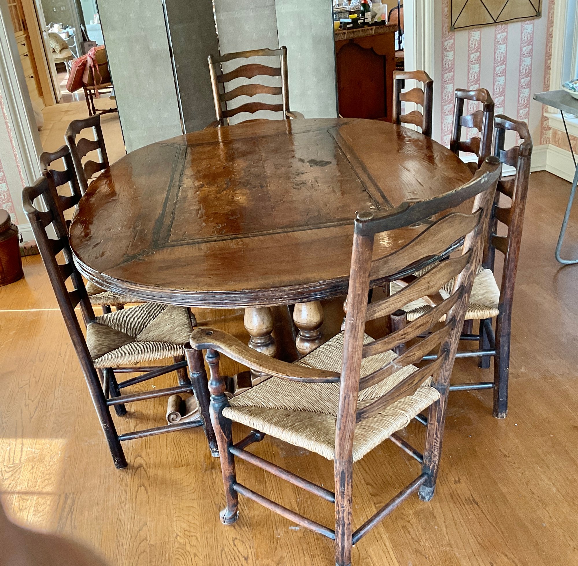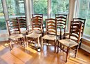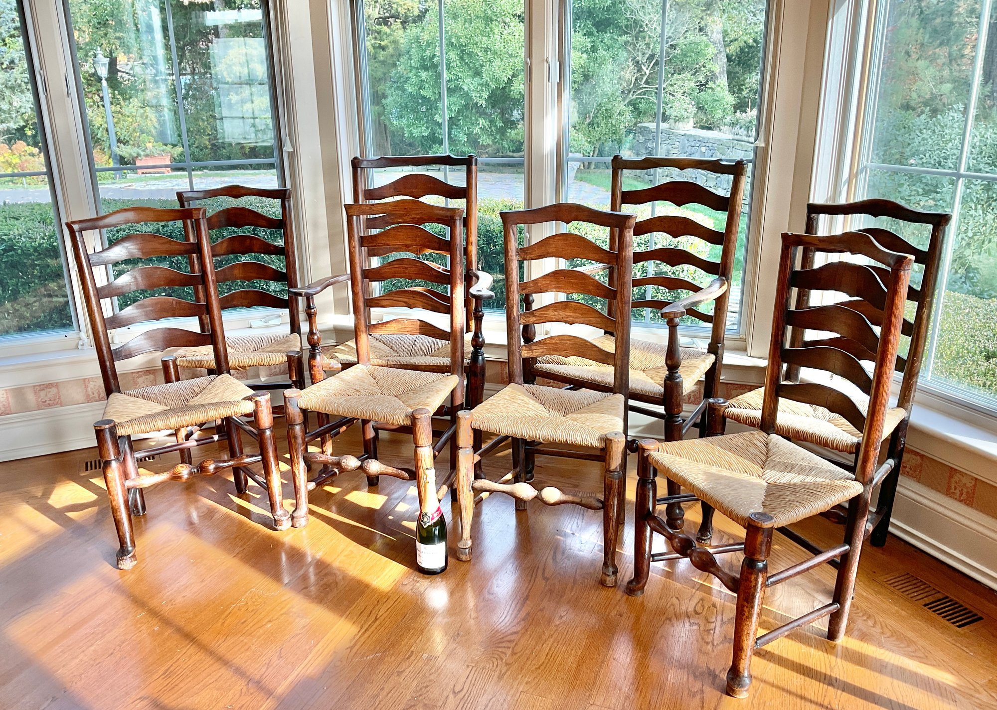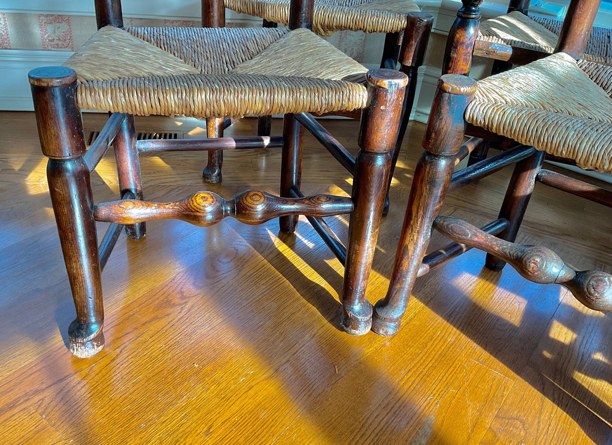 2 arm chairs and 6 side chairs with rush seats and Queen Anne feet. Rush seat are all good.