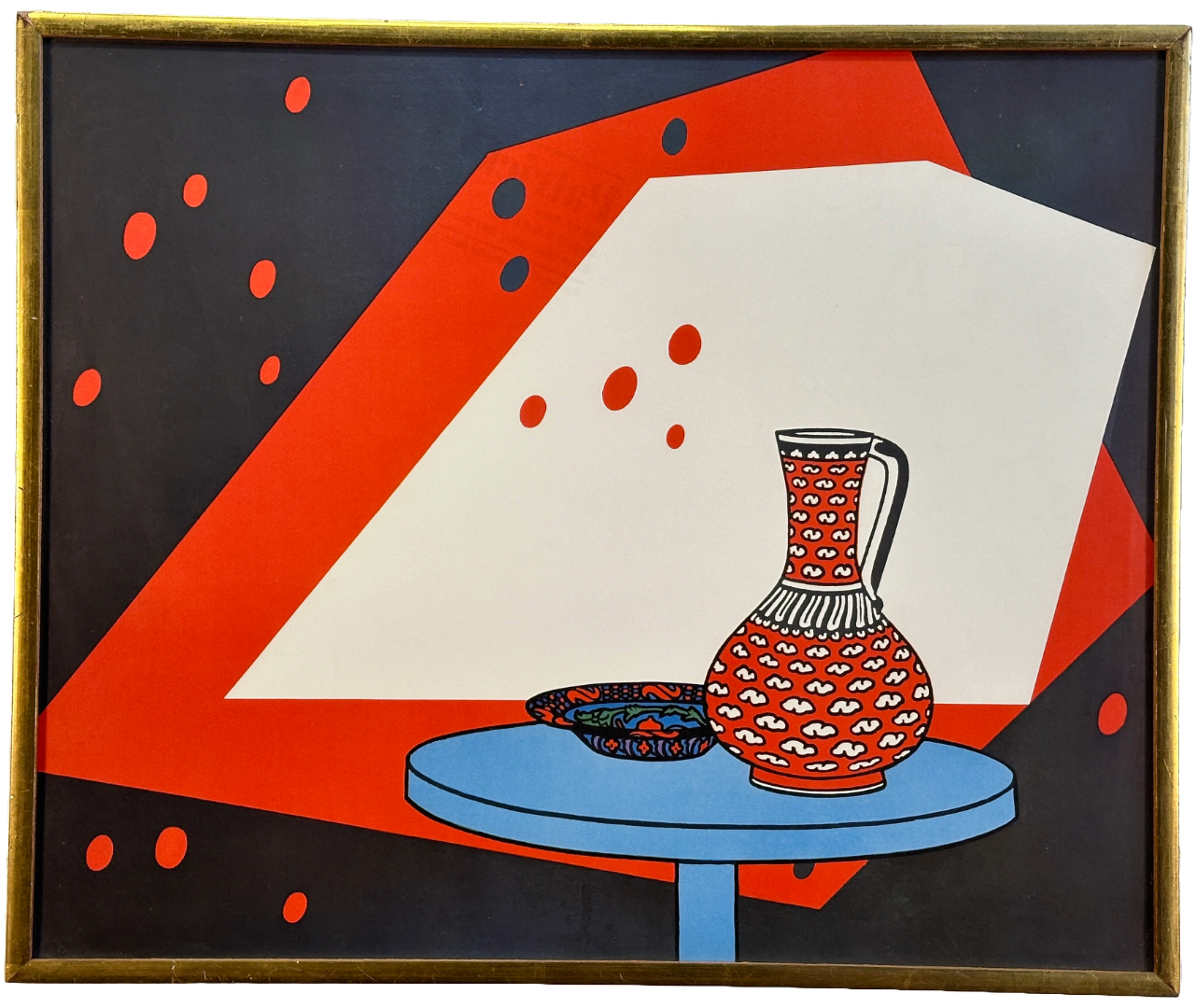 A vintage color lithograph by Patrick Caulfield (British, 1936-2005) titled, "Red and White Still Life". Unsigned. Framed under glass in gold painted wooden frame.