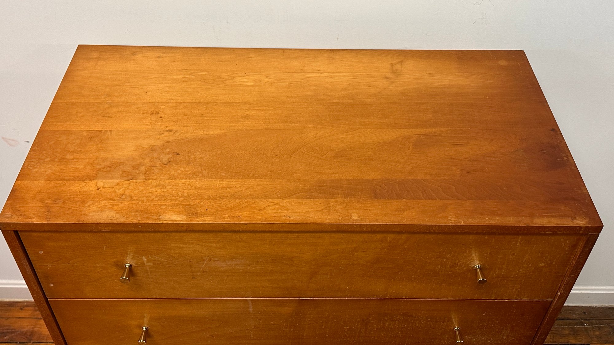 Condition: Shows some finish imperfections to the top and front drawers, bumps and scratching to the finish on right side.