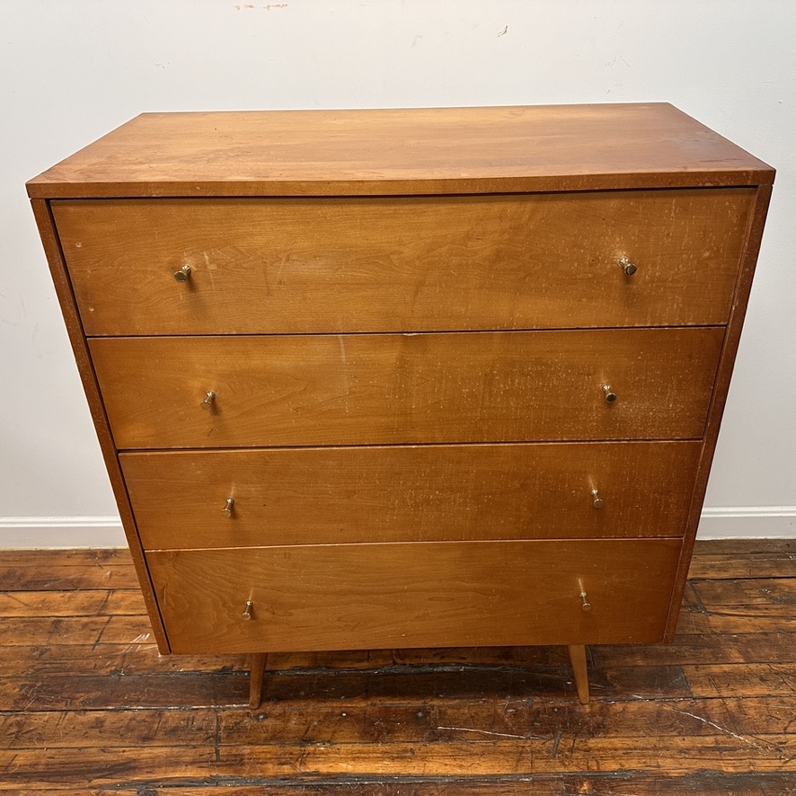 A Paul McCobb for Winchendon four drawer maple chest of drawers on tapered legs with cone shaped brass pulls.