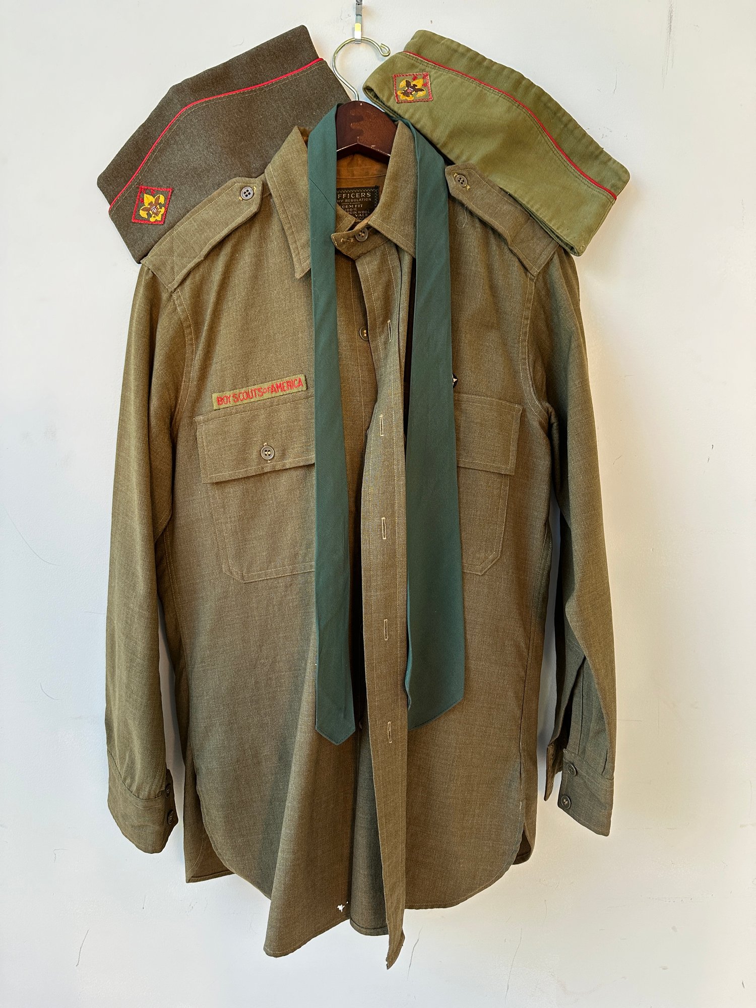 Boy Scouts of American Army regulation uniform with shirt, pants, tie & 2 caps. Form fit 100% virgin wool.