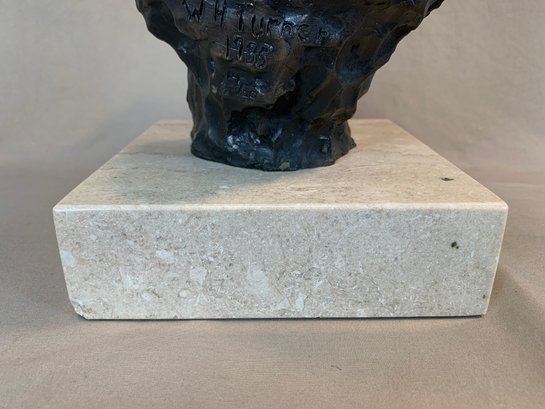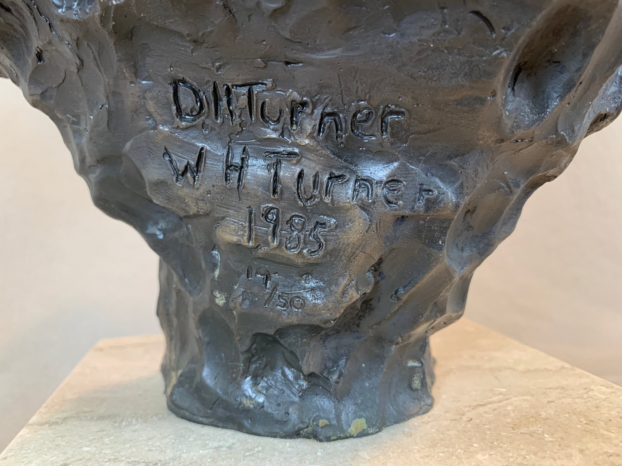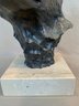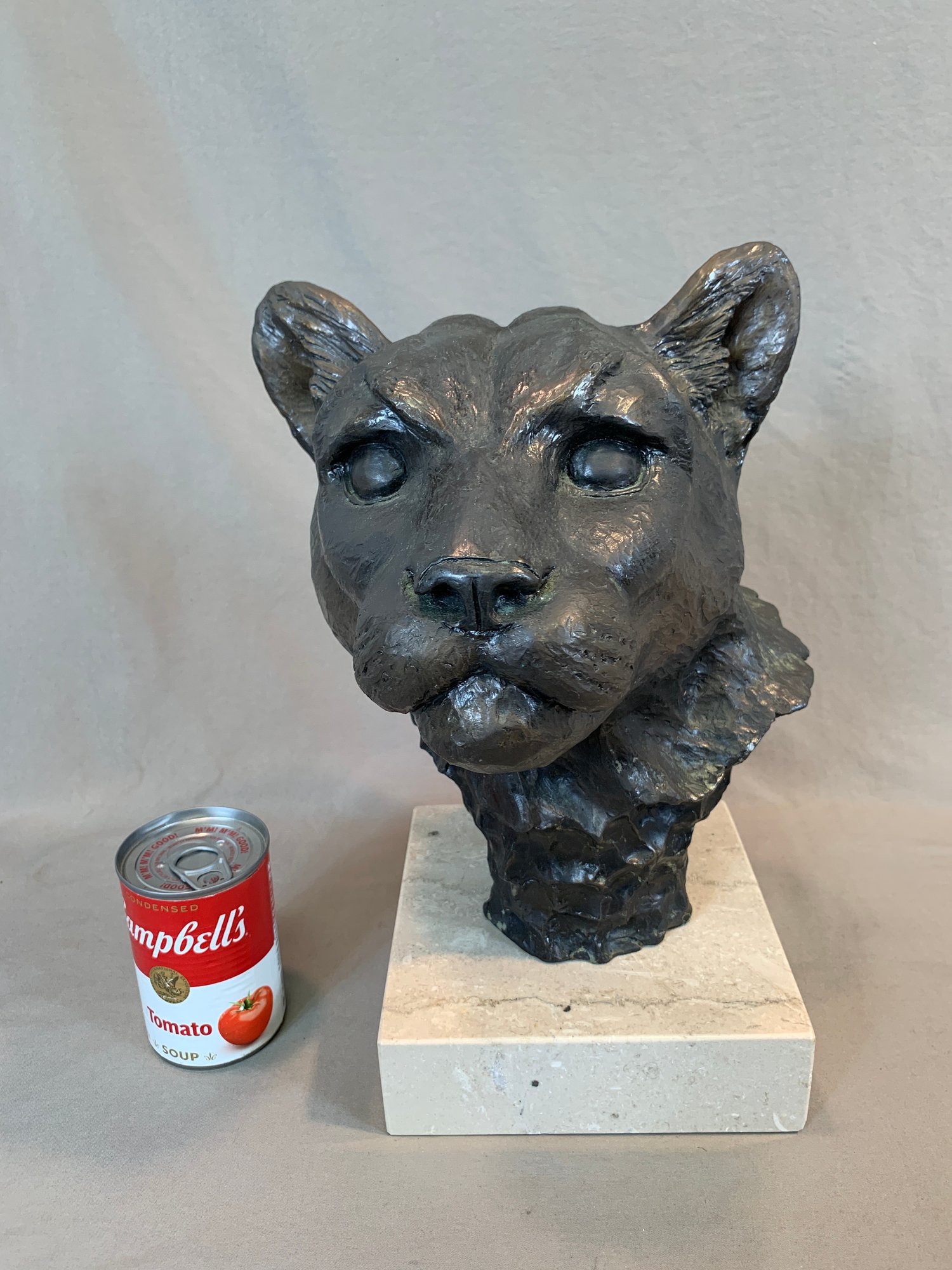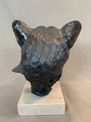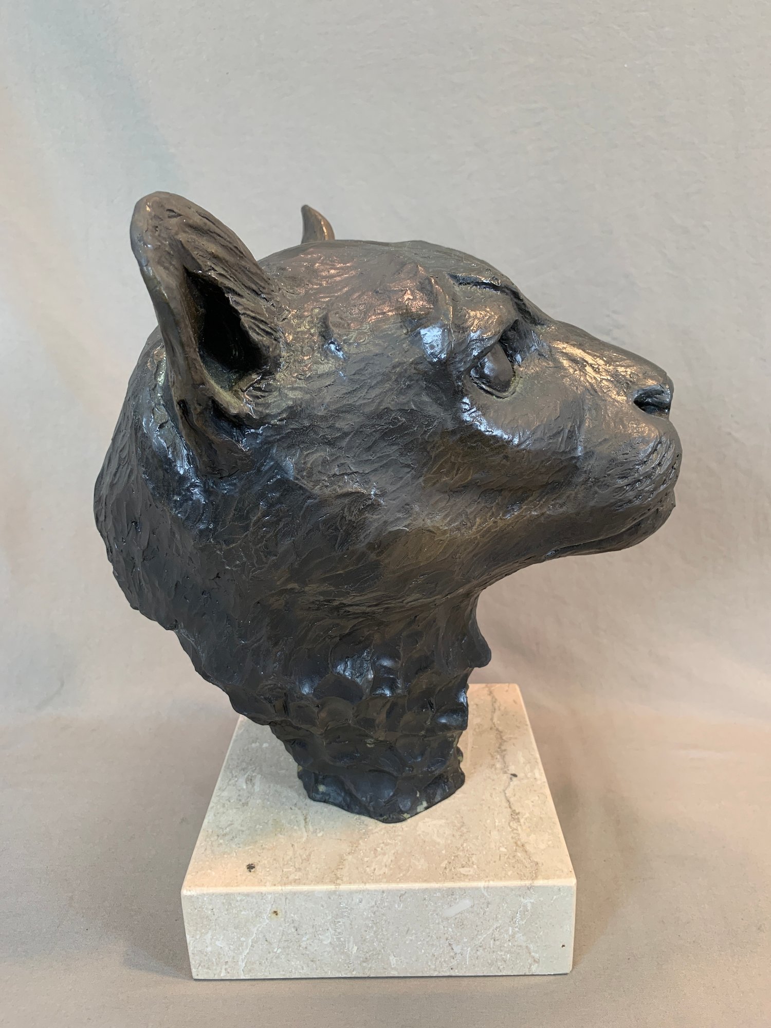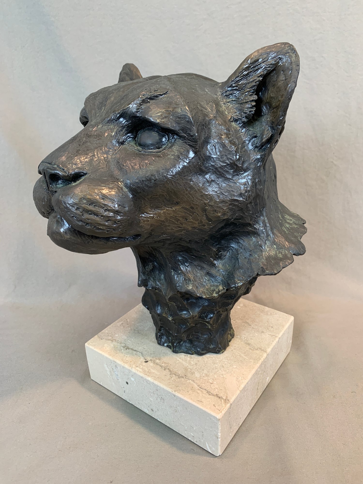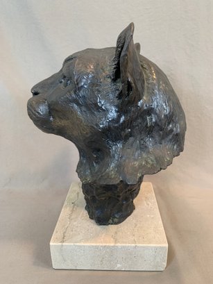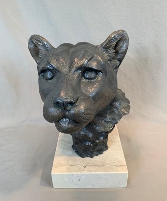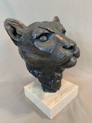 Limited edition bronze lioness head sculpture mounted on a marble base, signed and numbered 14/50. Dated 1985.