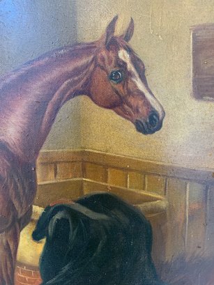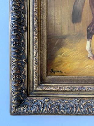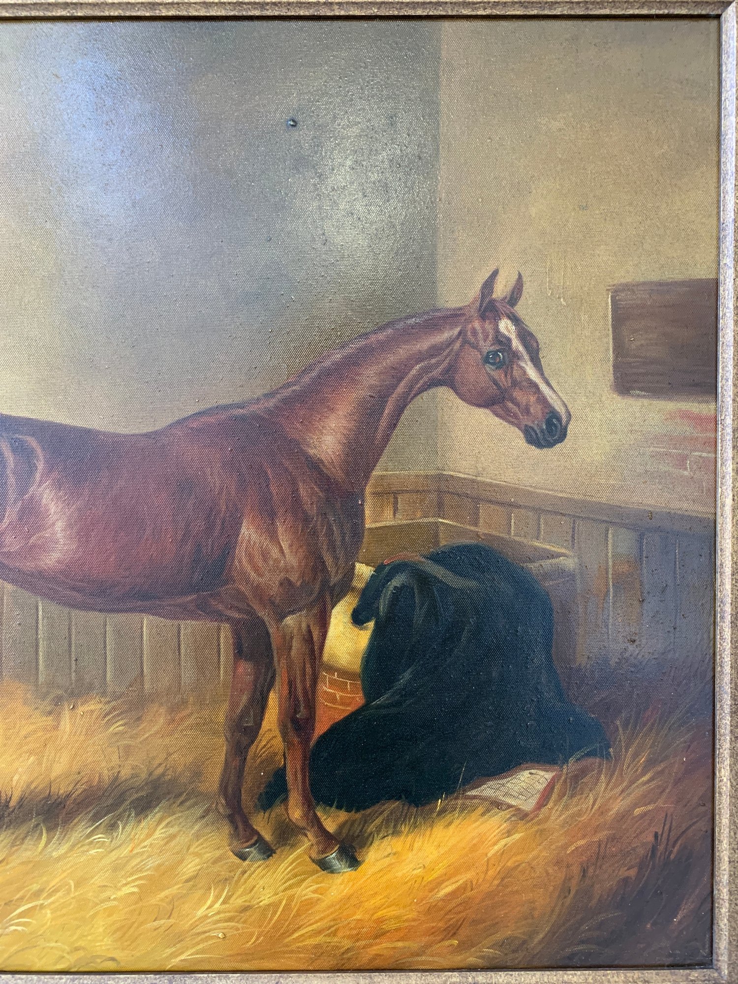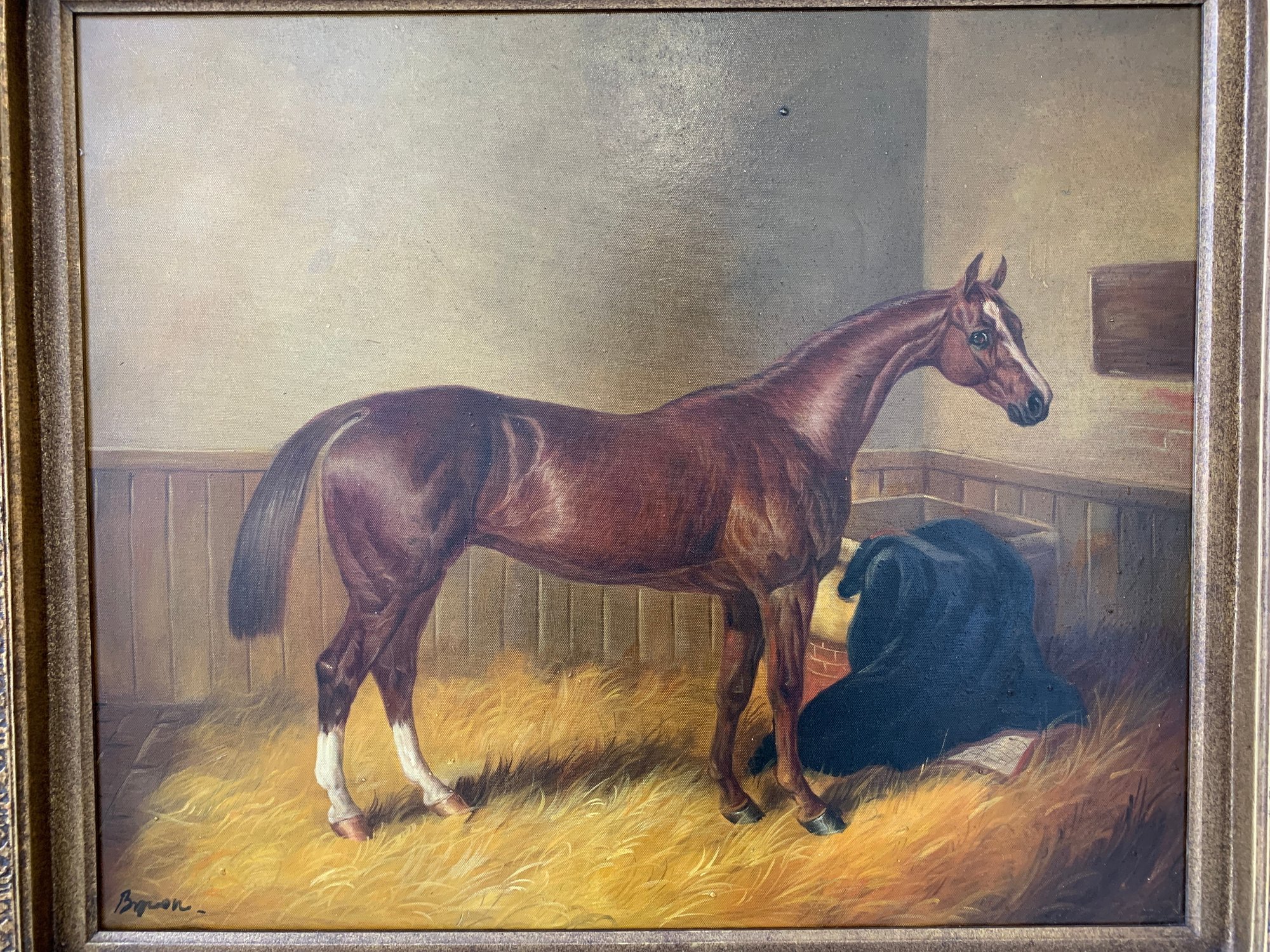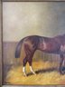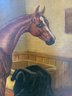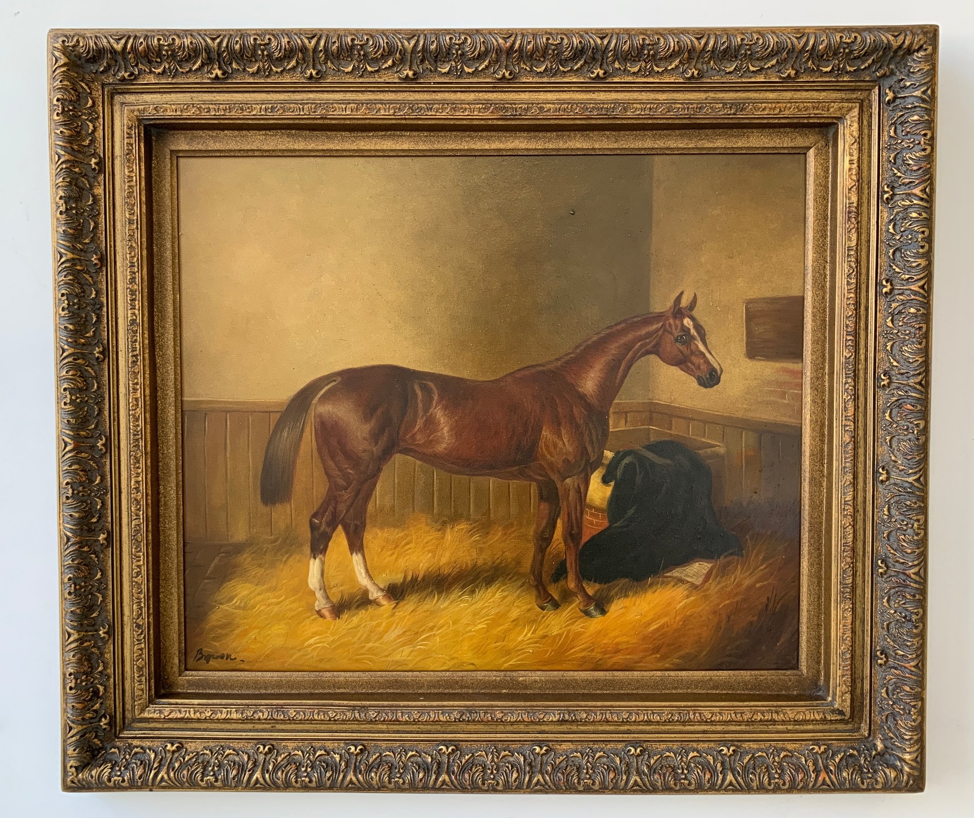A well-executed portrait of a chestnut horse standing in a straw-lined stall, with a dark horse blanket draped over the manger to the right. Signed lower left.
