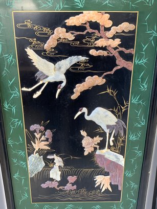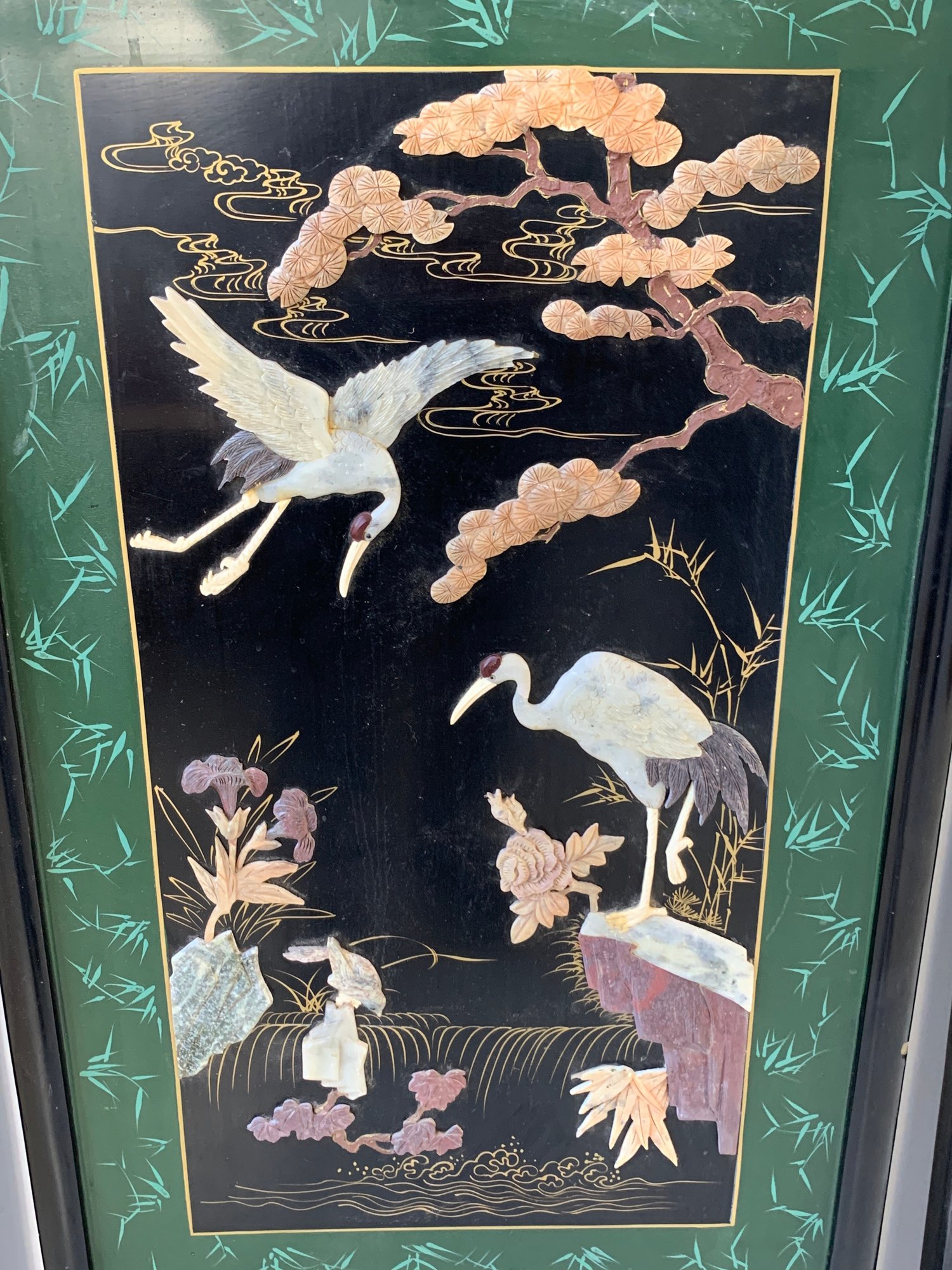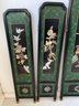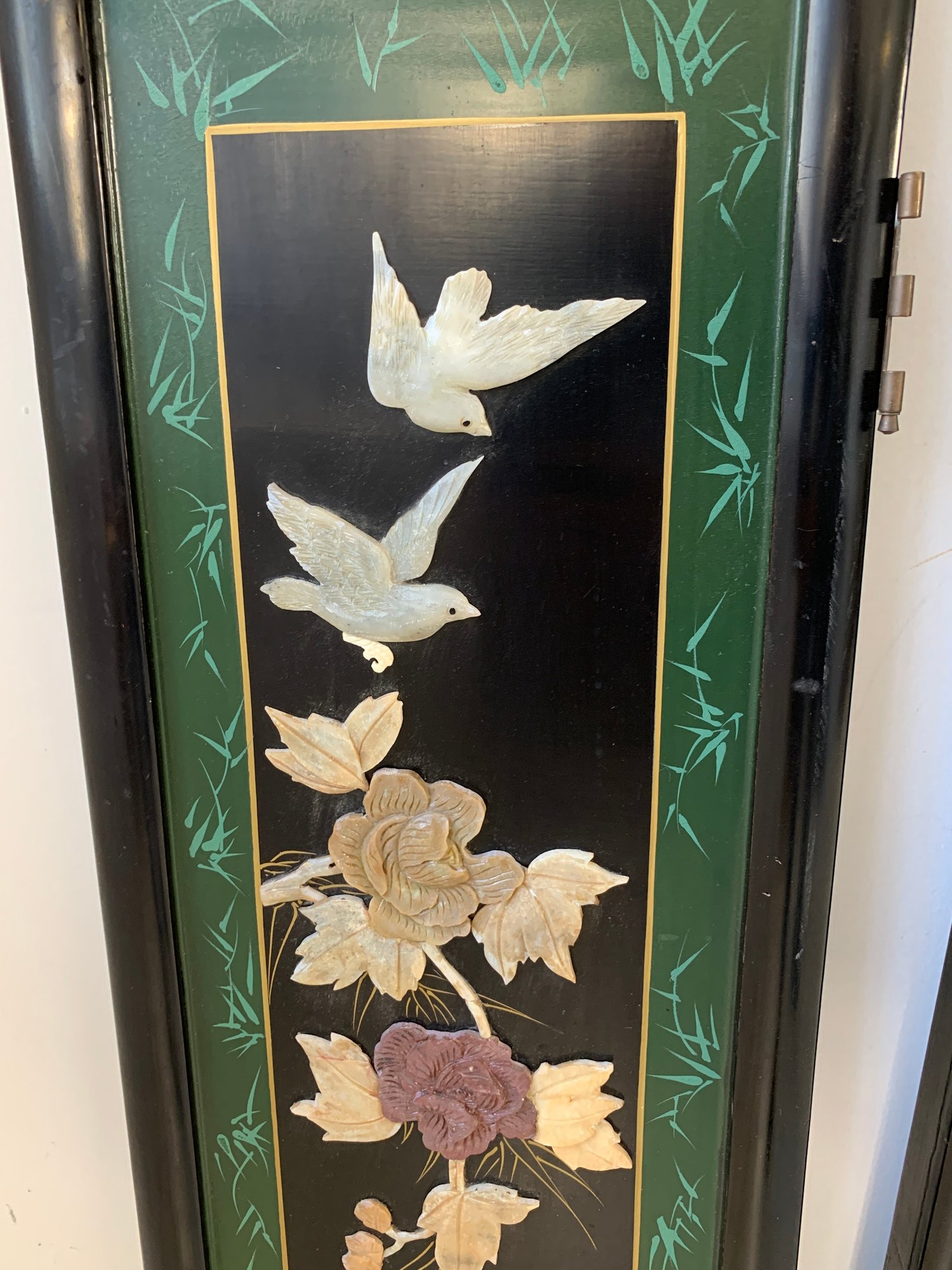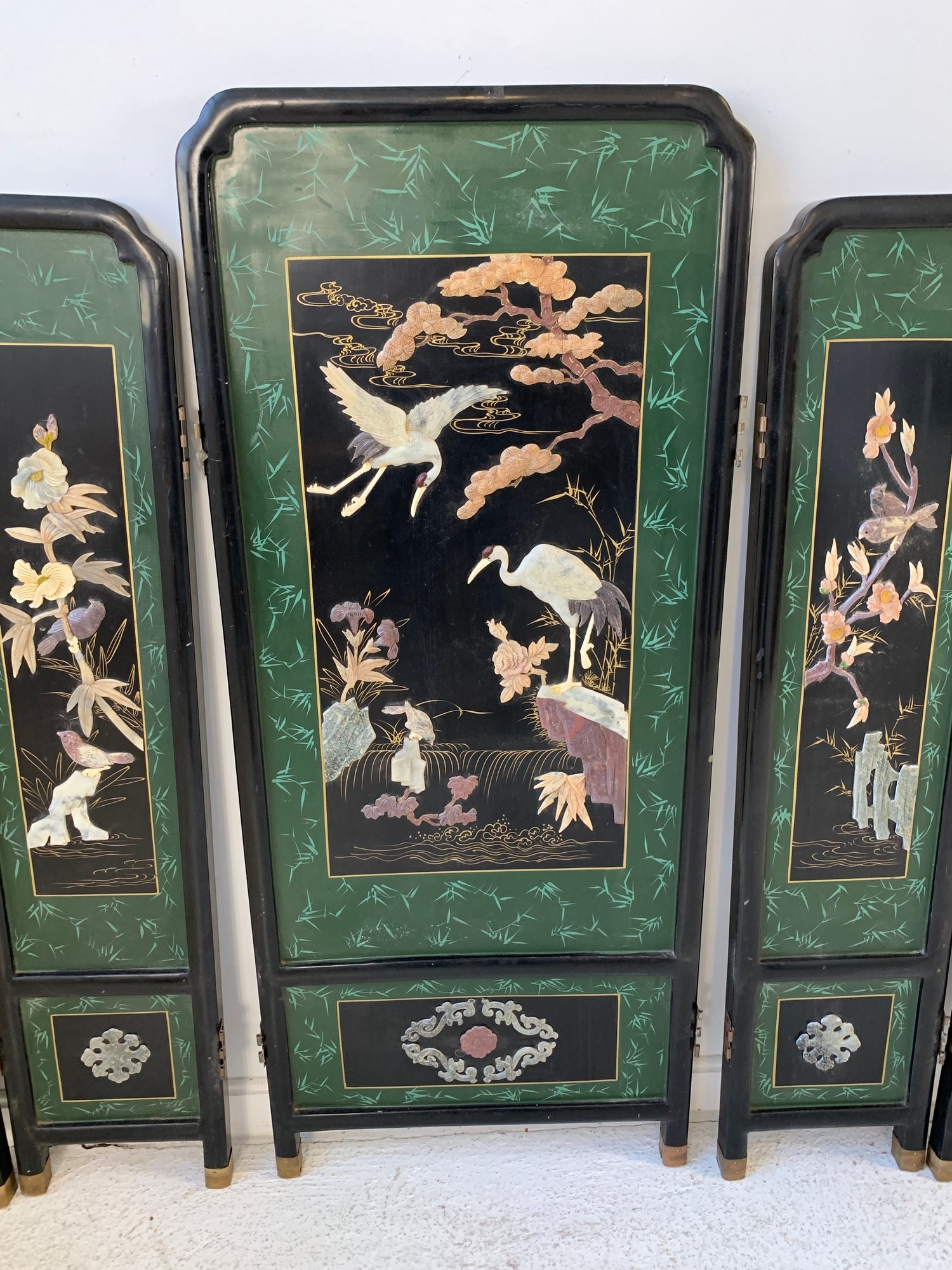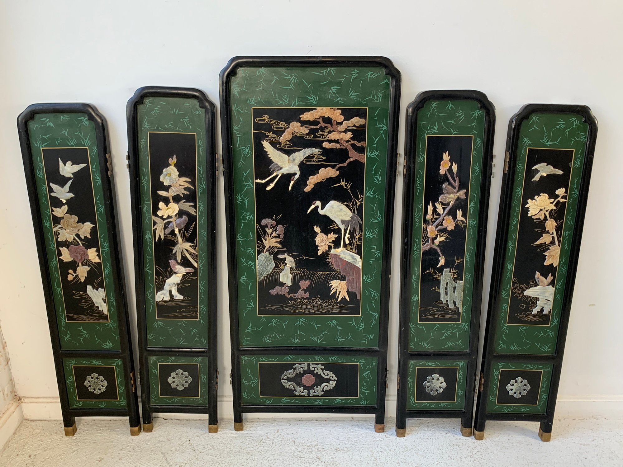A five-panel folding screen in the Qing dynasty style, with black and green lacquered grounds decorated with applied hand-carved hardstone and bone figures depicting cranes in flight, pine trees, peonies, birds and garden figures. Jade medallion insets to the base of each panel. The reverse of the two outer panels decorated with gold on black incised landscape scenes. Raised on brass sabots. The center panel is larger than the flanking panels, creating a graduated stepped profile.