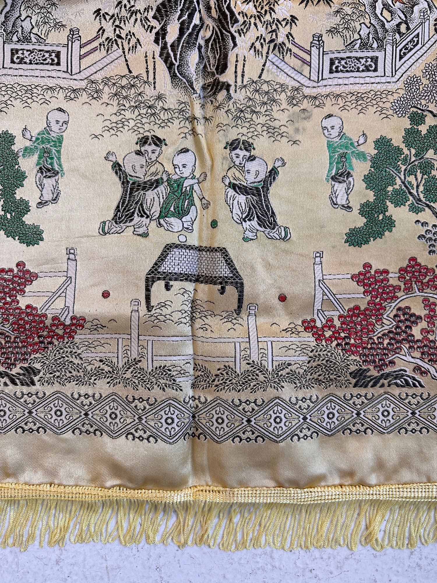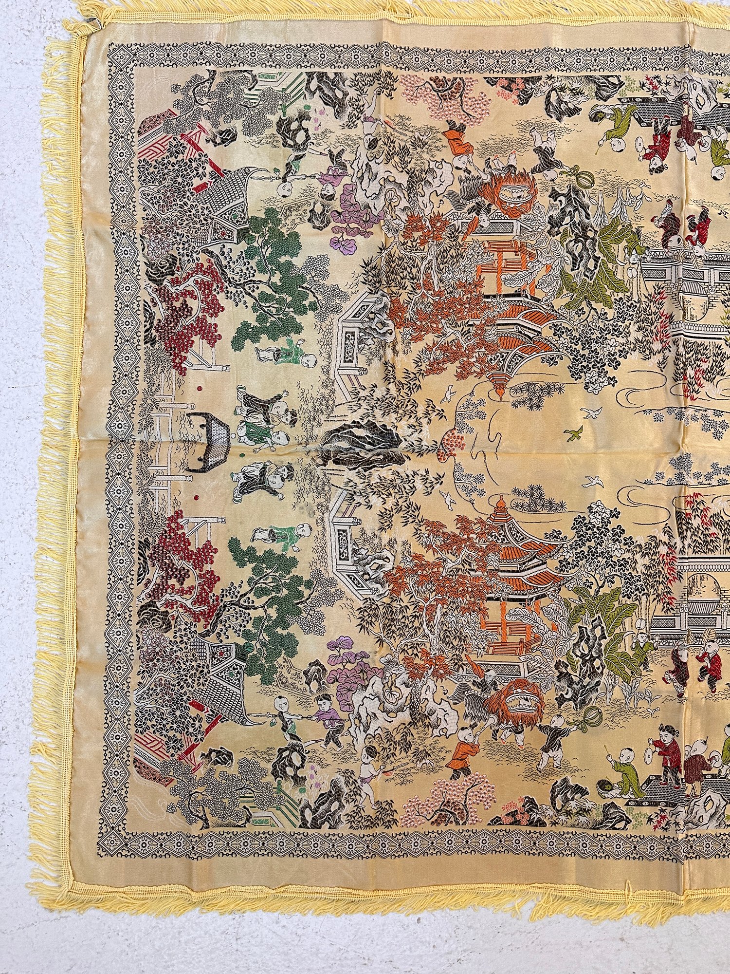 Beautiful vintage Chinese silk brocade tablecloth with intricate woven design.
