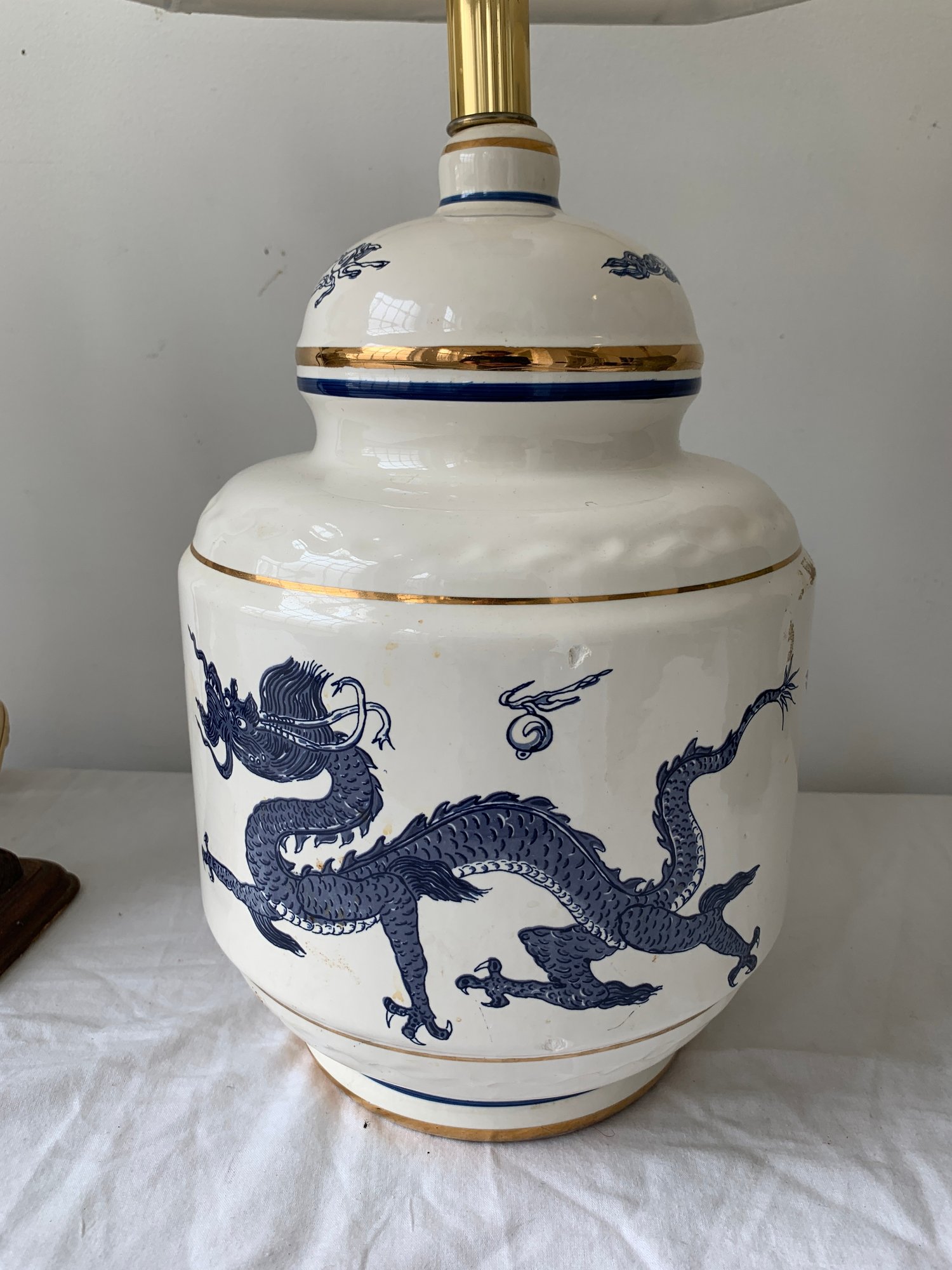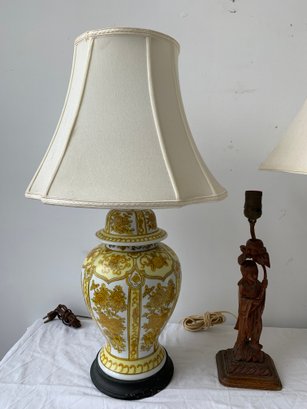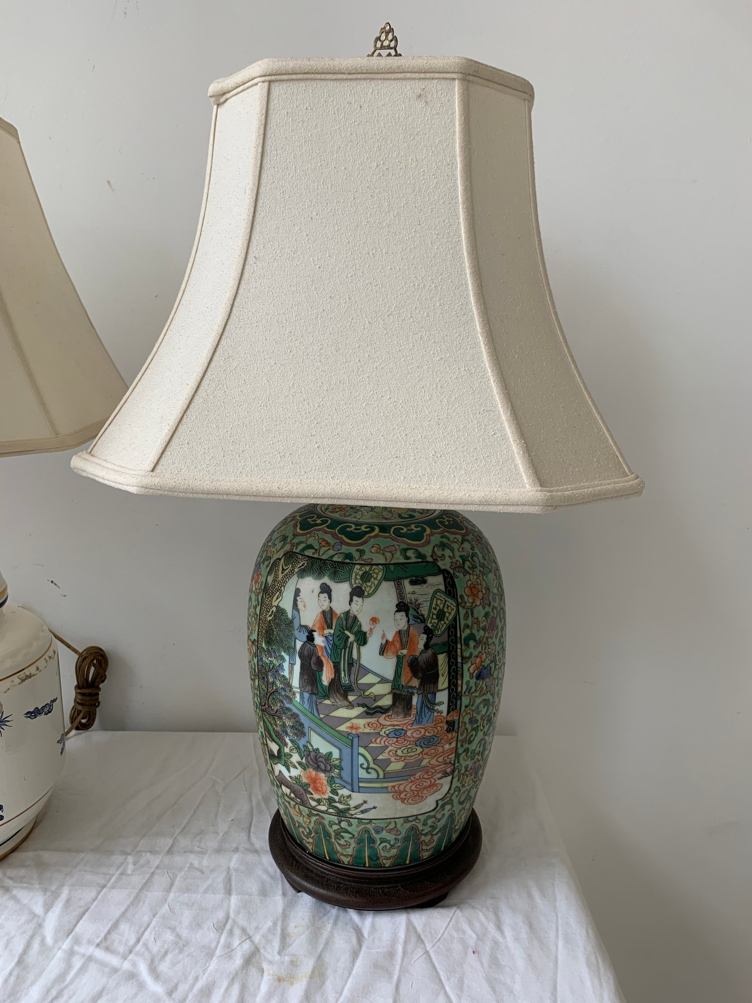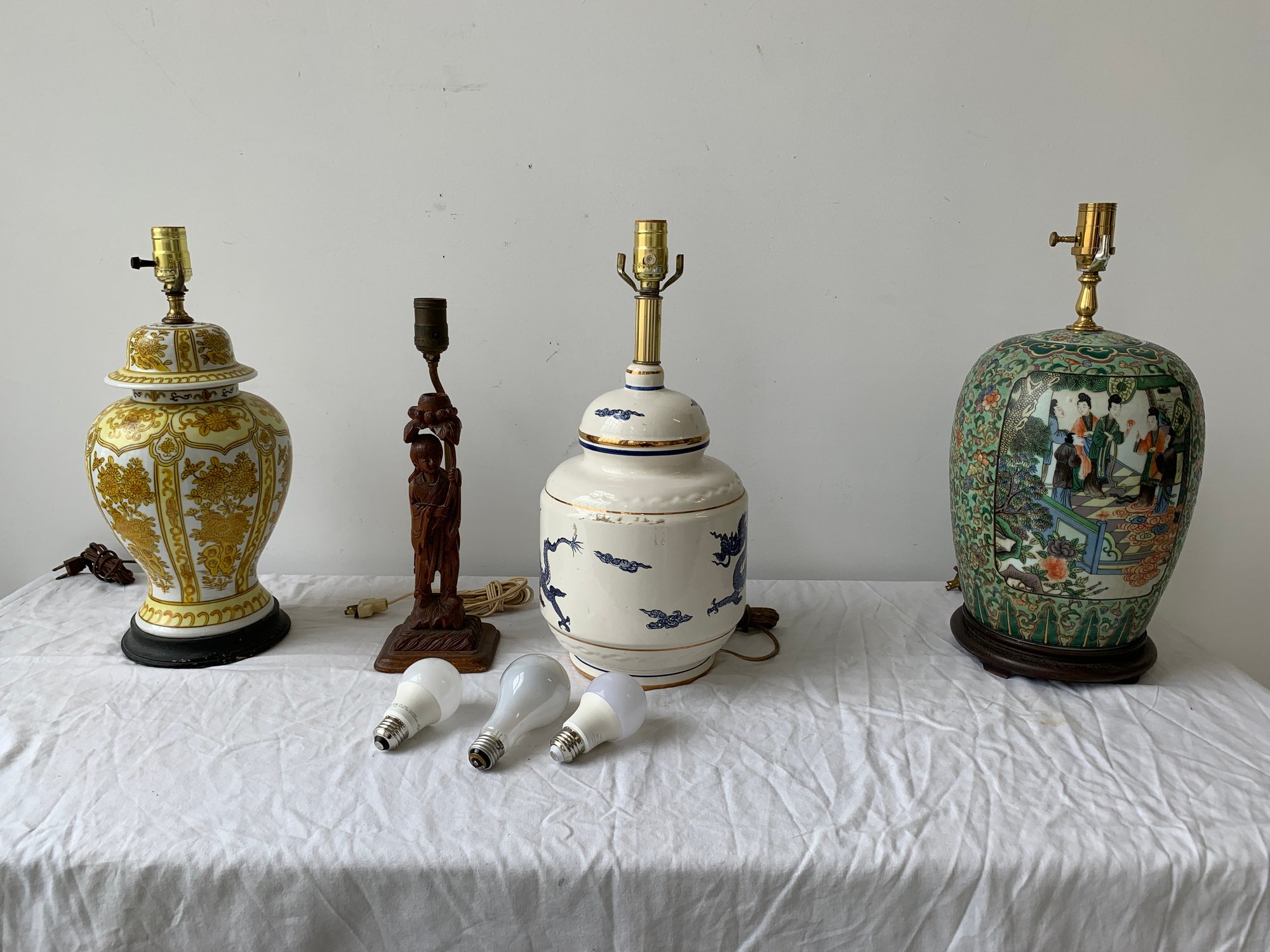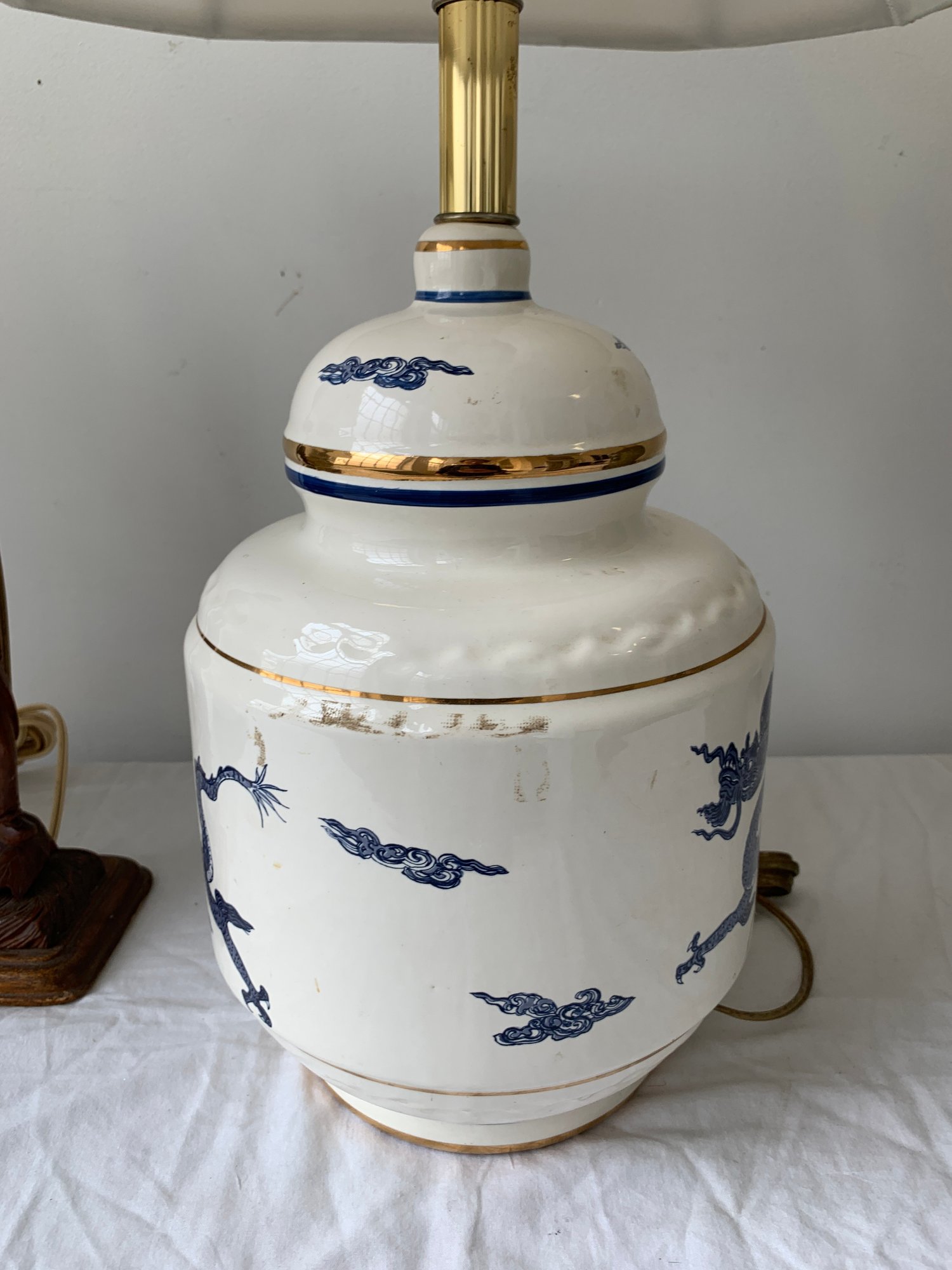 3 lamps are porcelain , 1 lamp is carved wood. Blue and white lamp marked Westwood industries, all lamps have silk shades.